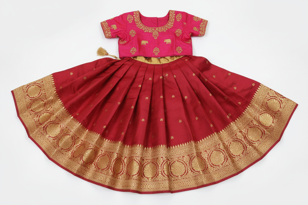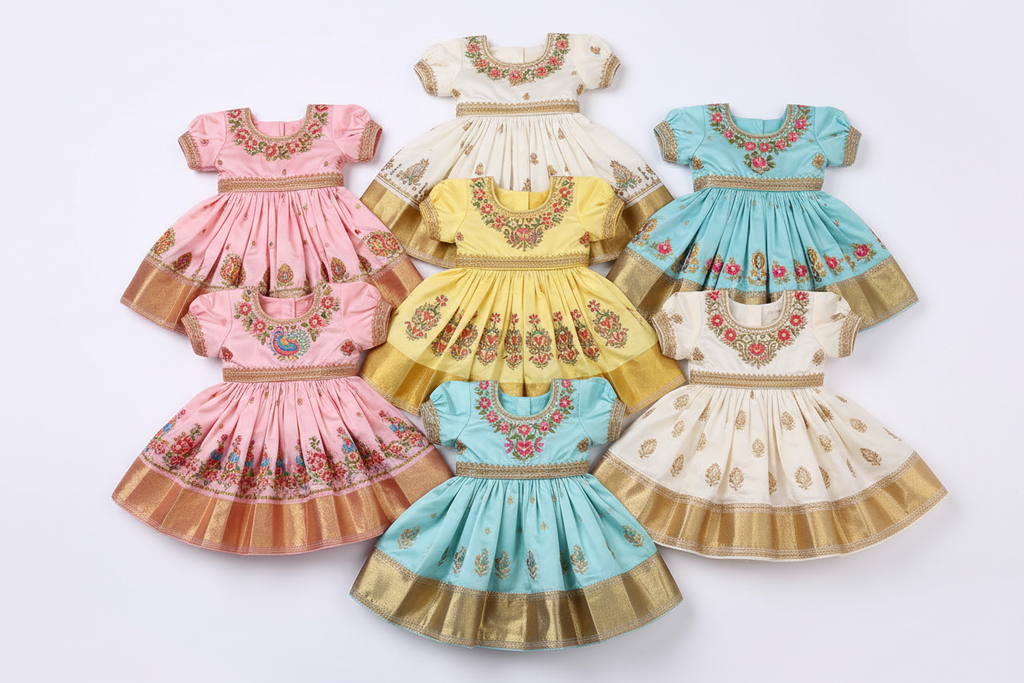 Pattu pavadai garments are recommended for dry cleaning only. This ensures that the delicate fabric and intricate embellishments are properly cared for without risking damage from washing.