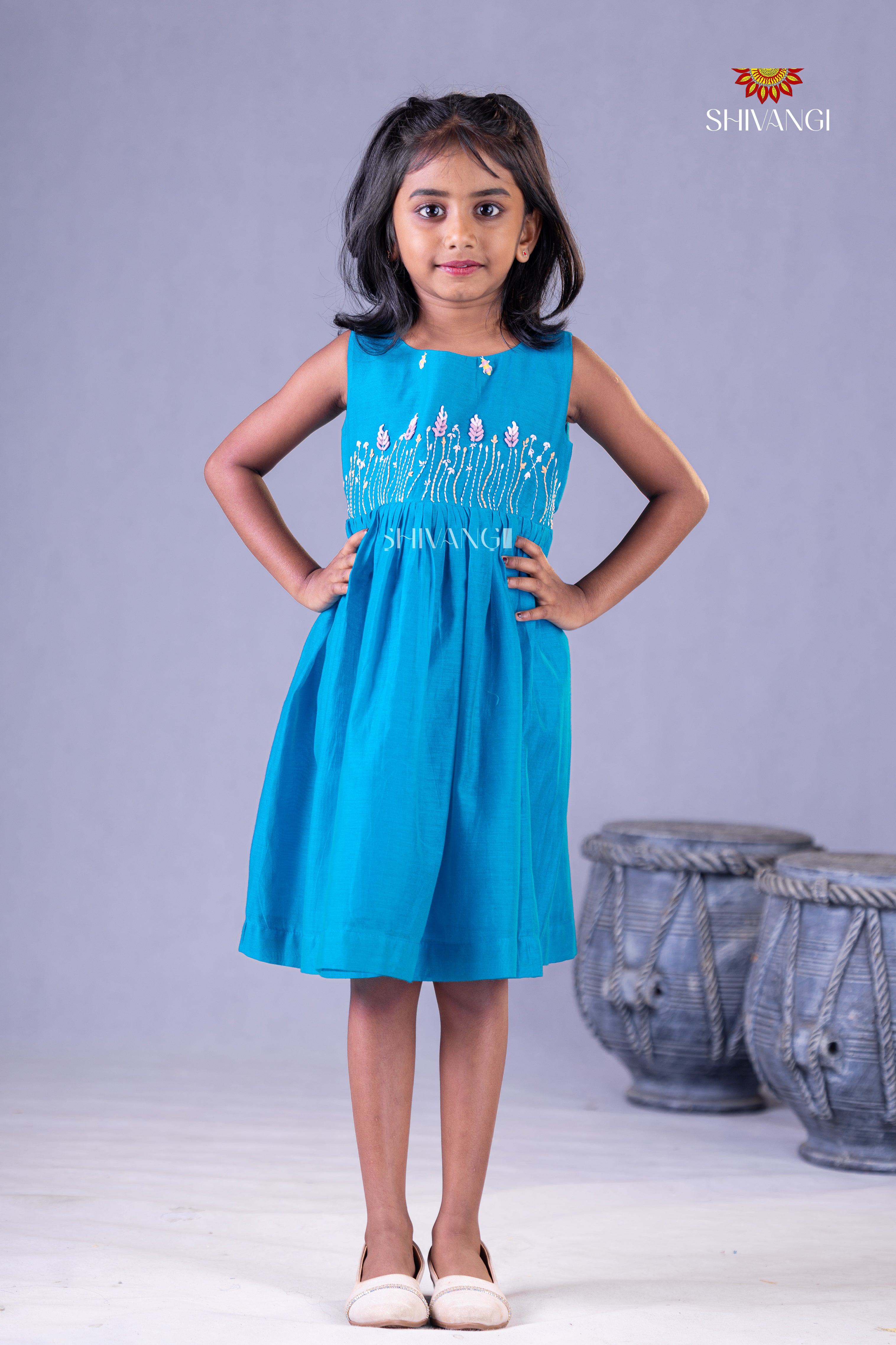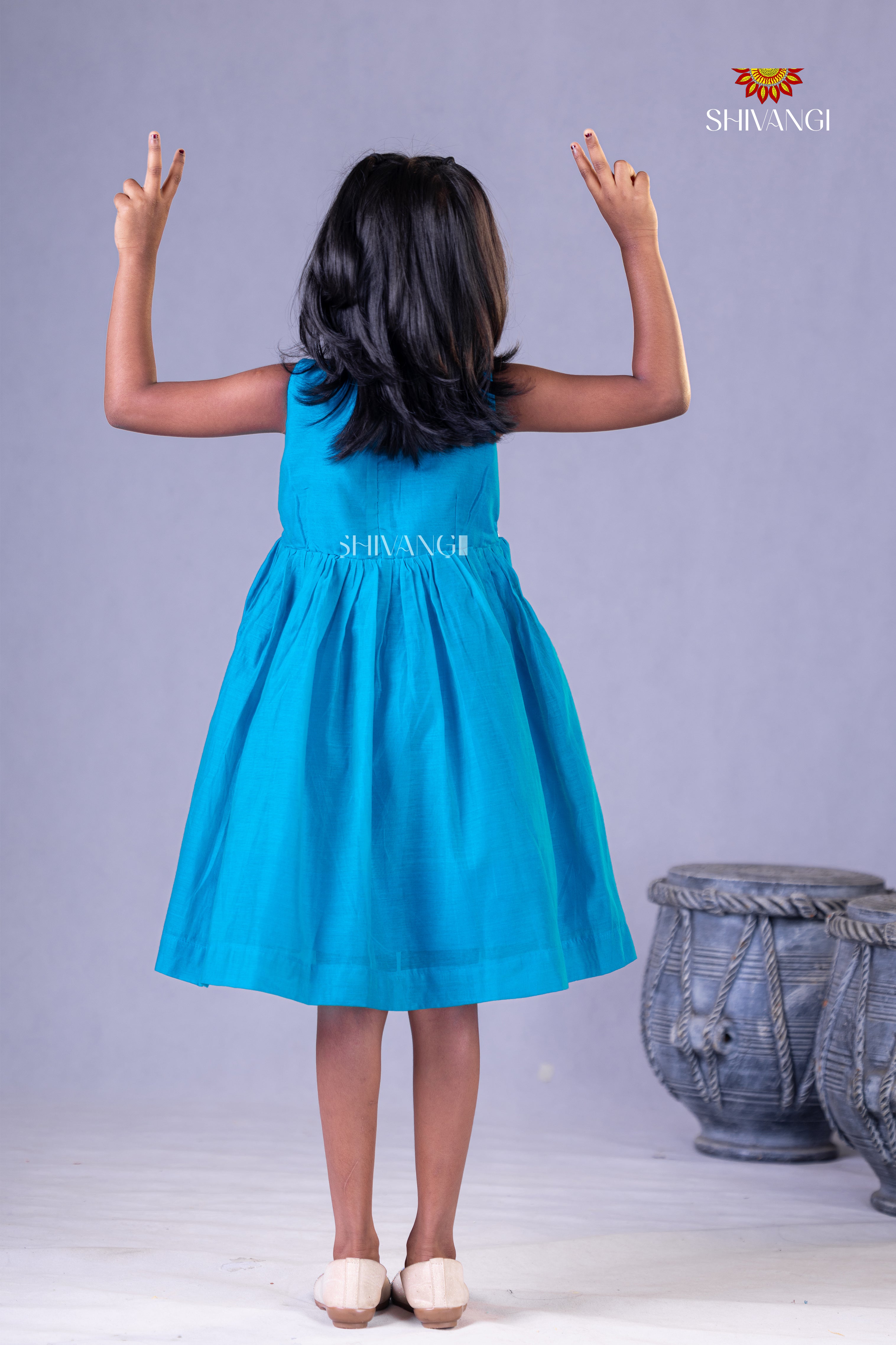 Sky Blue Chanderi Rice Corn Frock For Kids