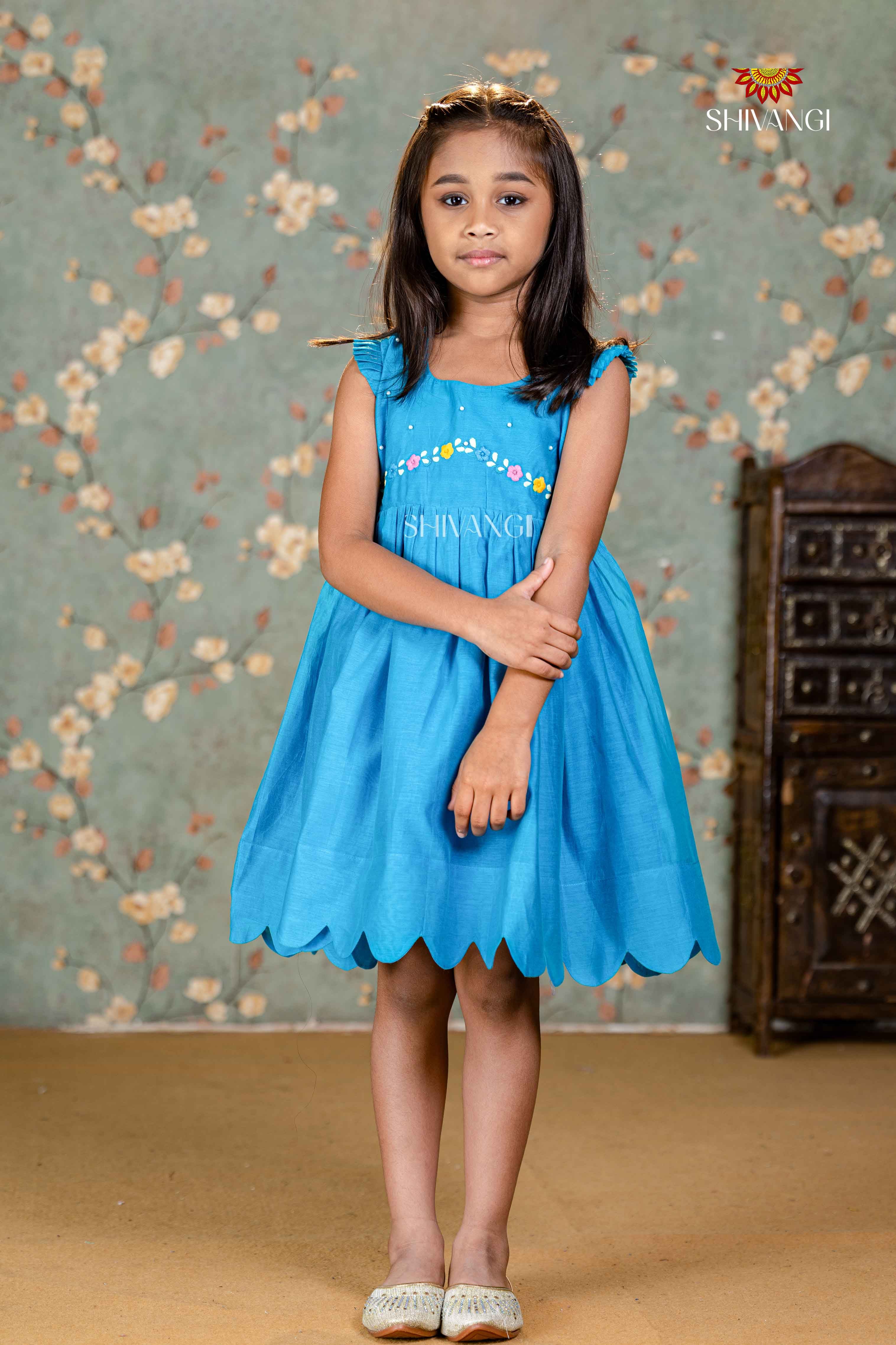 Sky Blue Chanderi Floral Creeper Frock For Kids