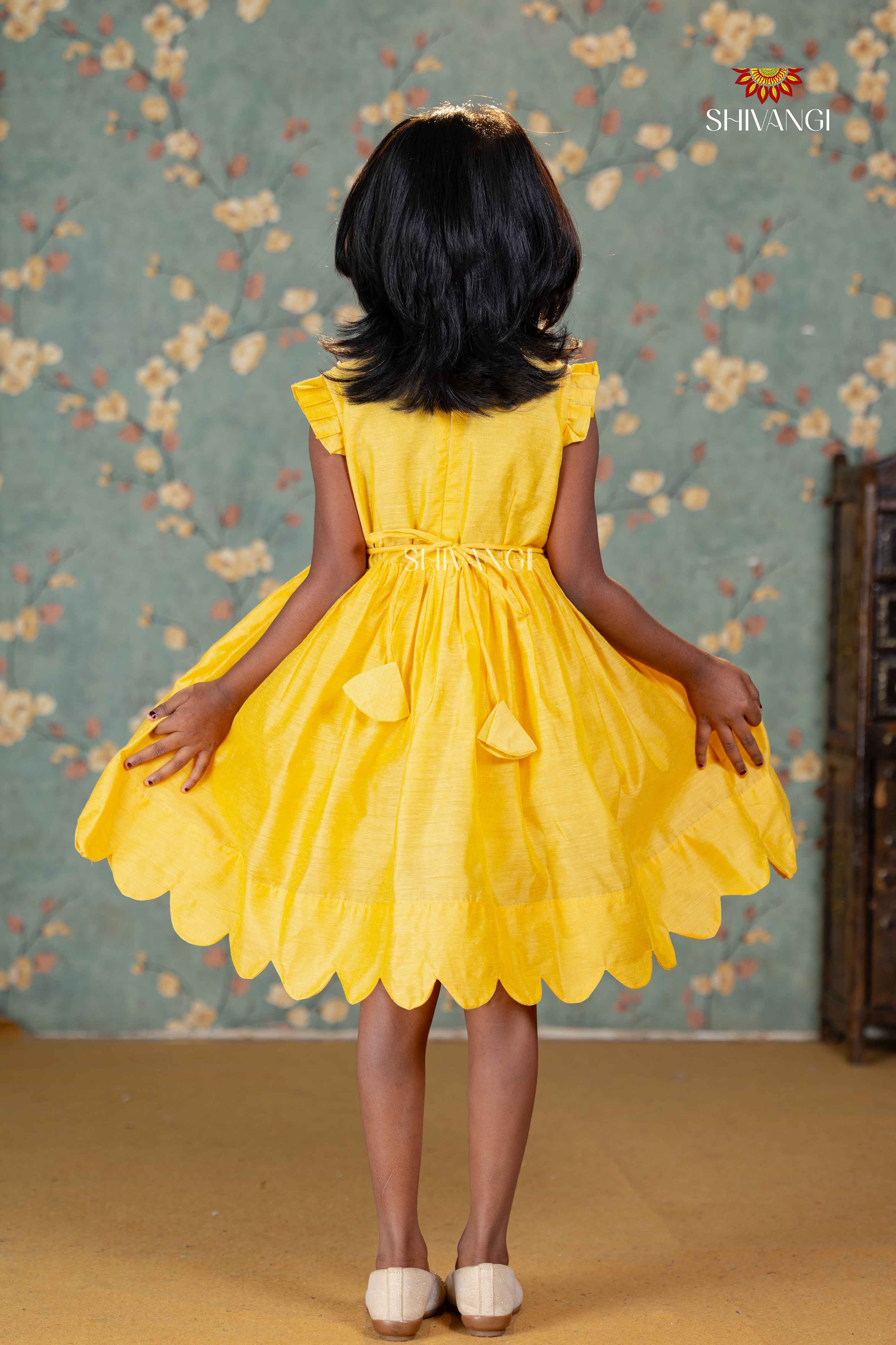 Yellow Chanderi Floral Frock For Kids