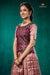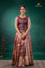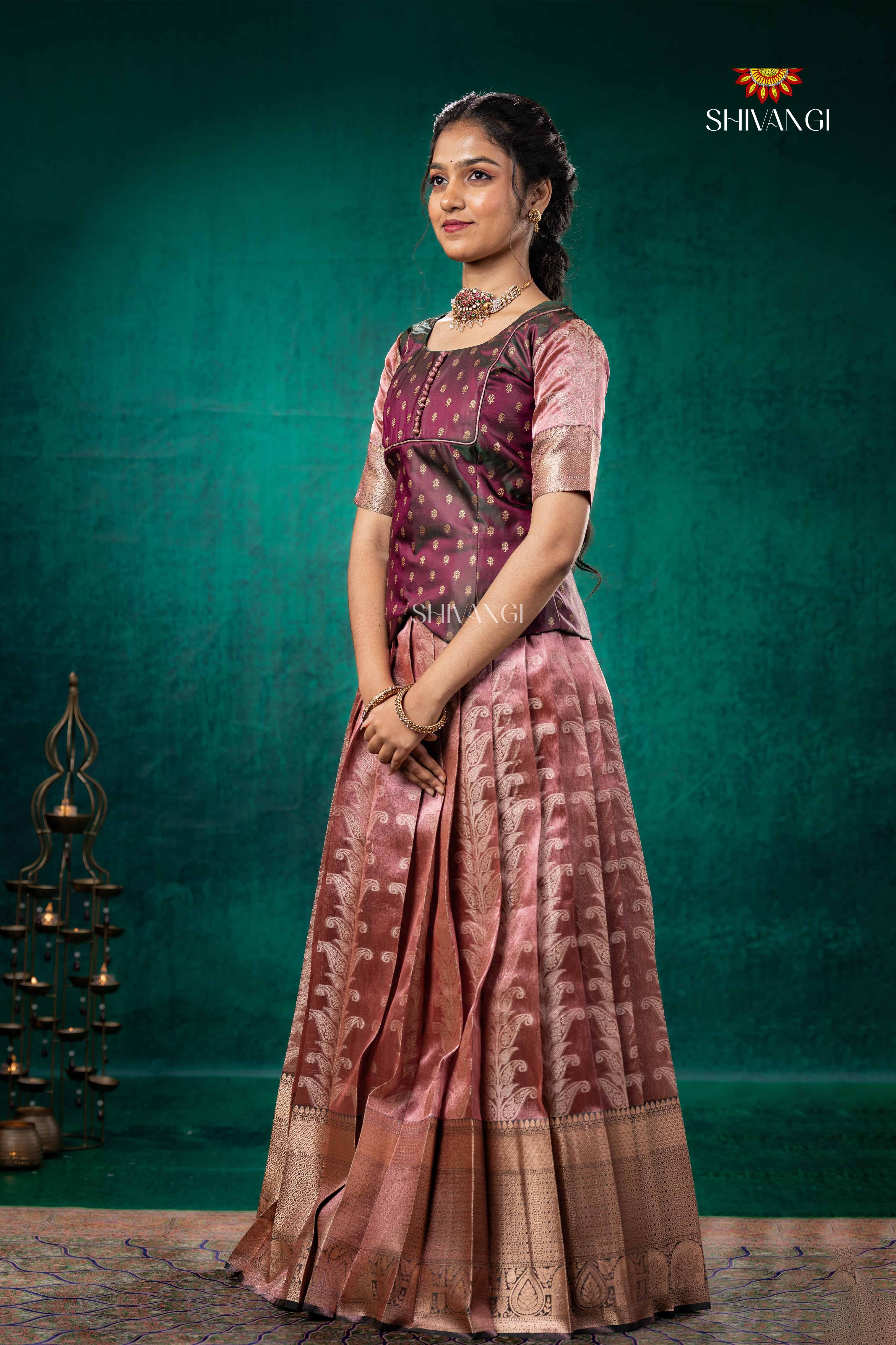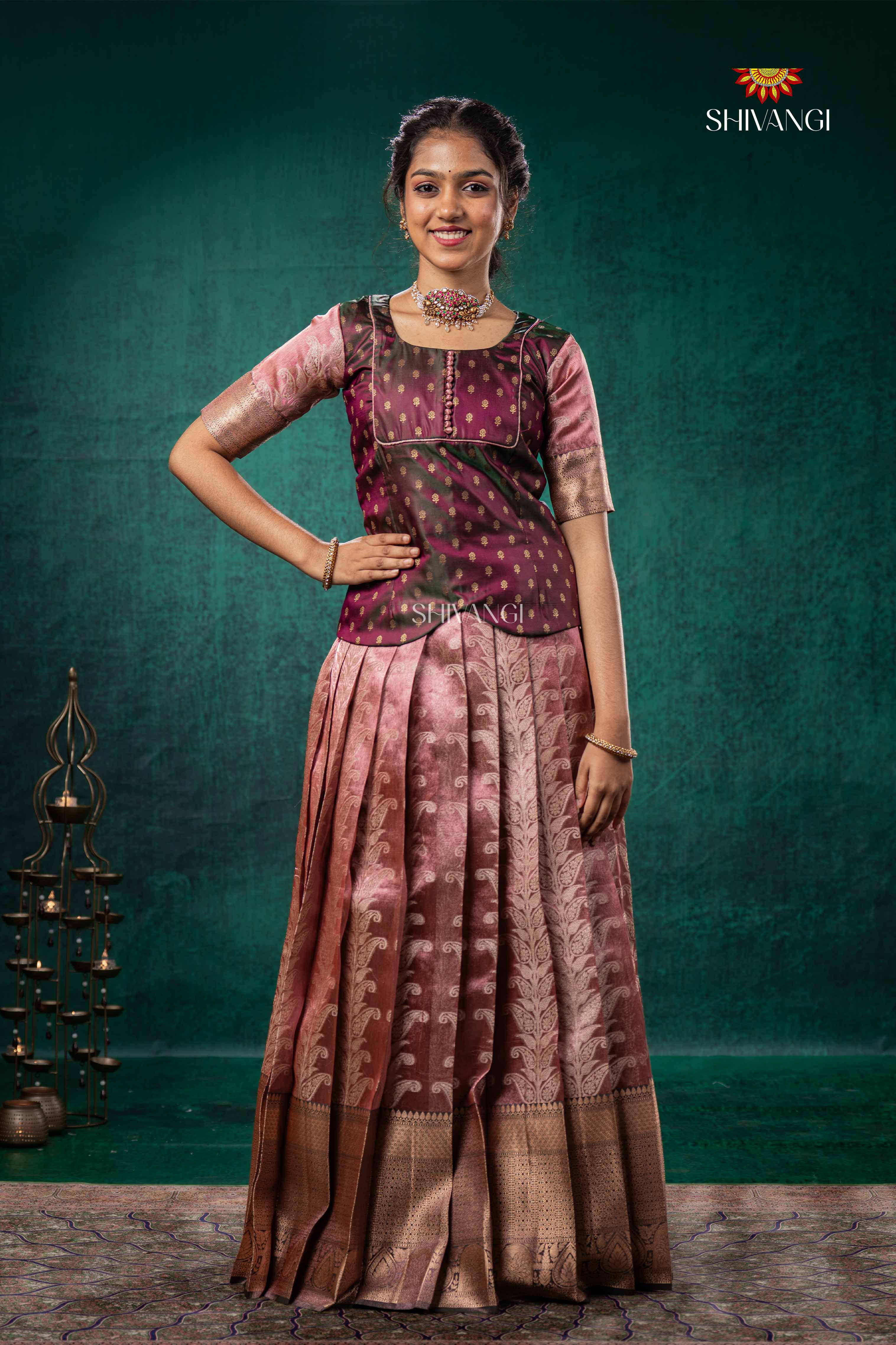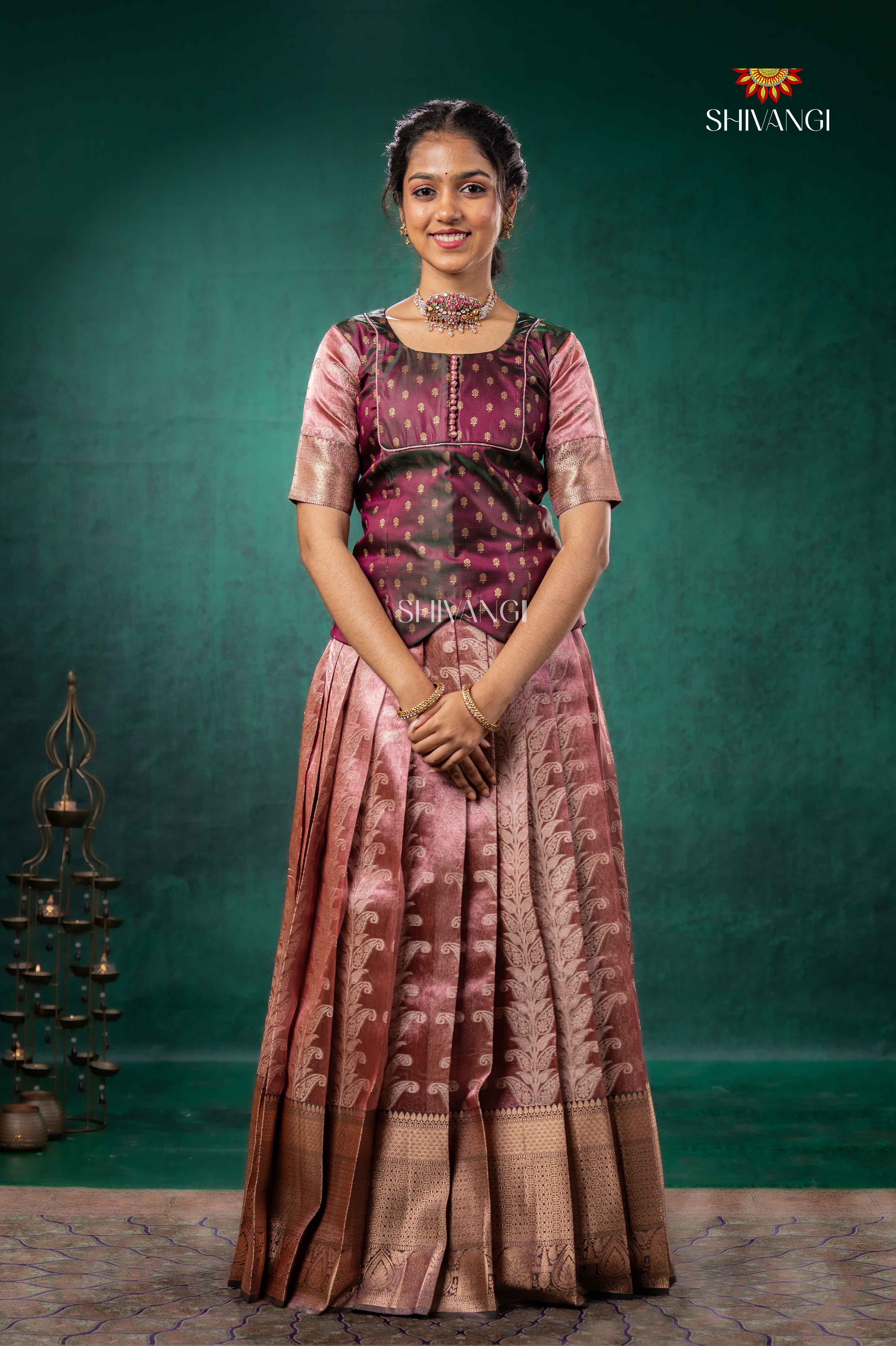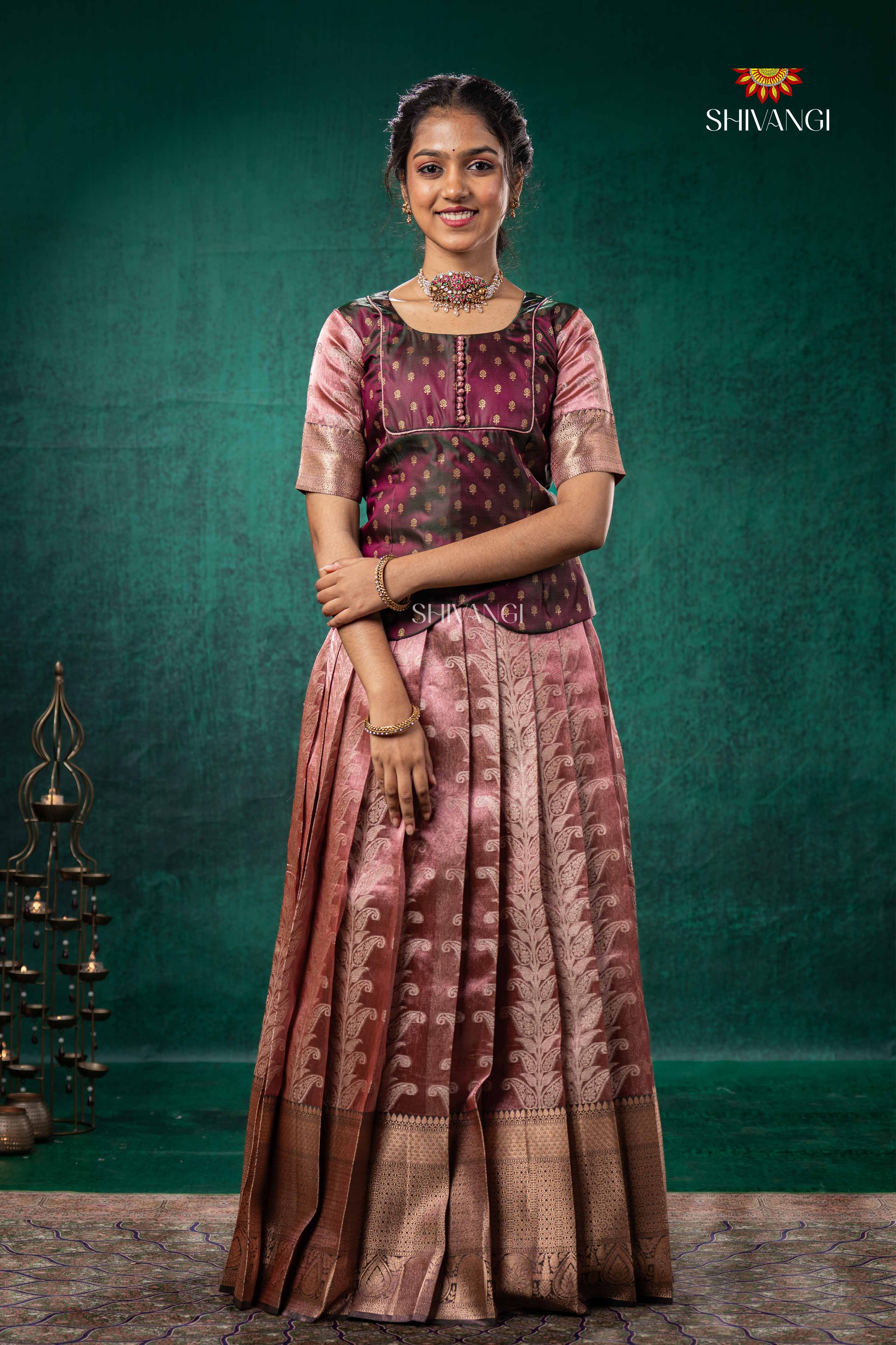 Brown Tissue Turmeric Traditional Pattu Pavadai Set features a top with a round neck and elbow sleeves.