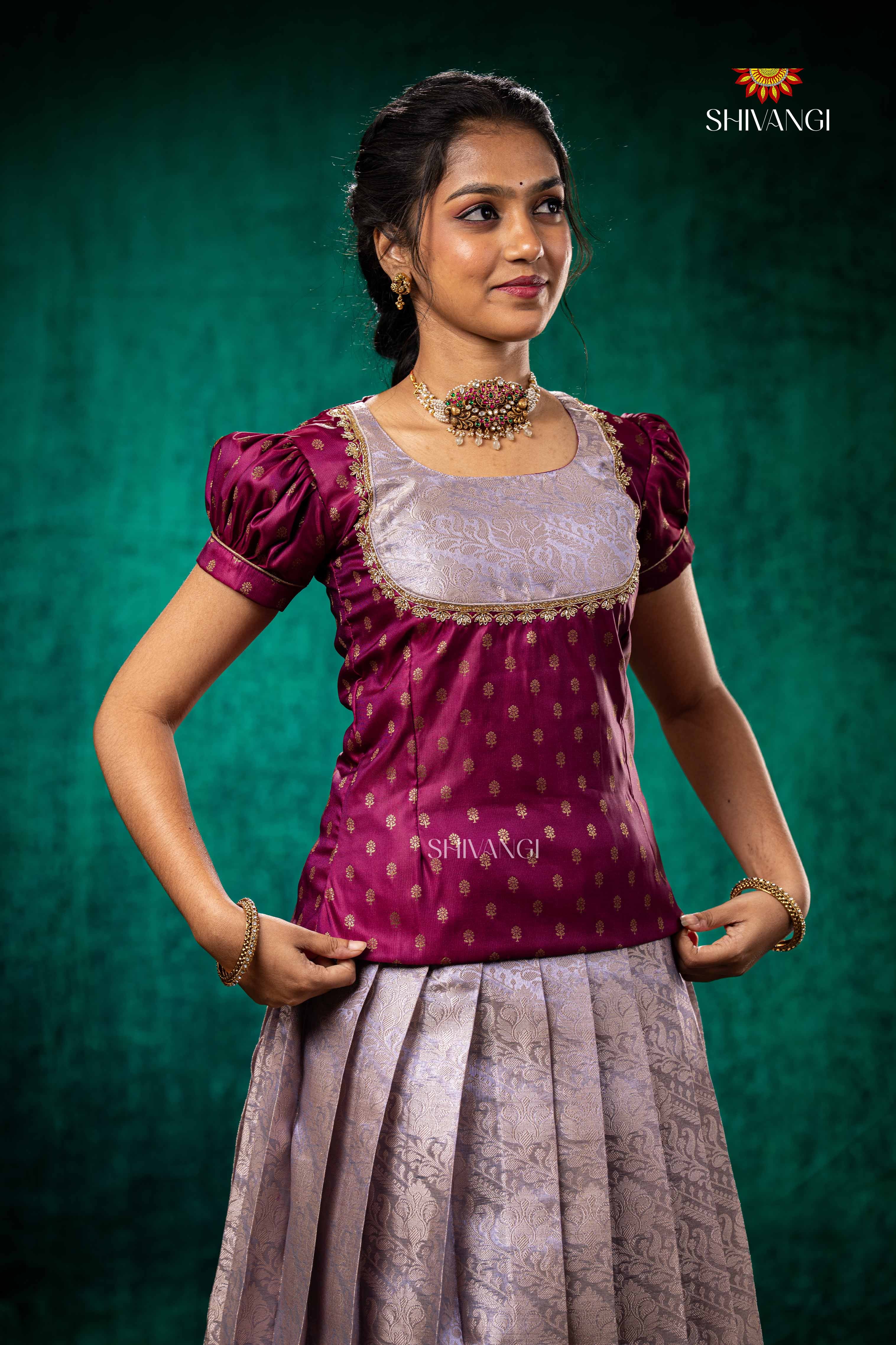 Magenta Royal Jasmine Traditional Pattu Pavadai Set features a Magenta top with a round neck and elbow sleeves.
