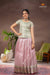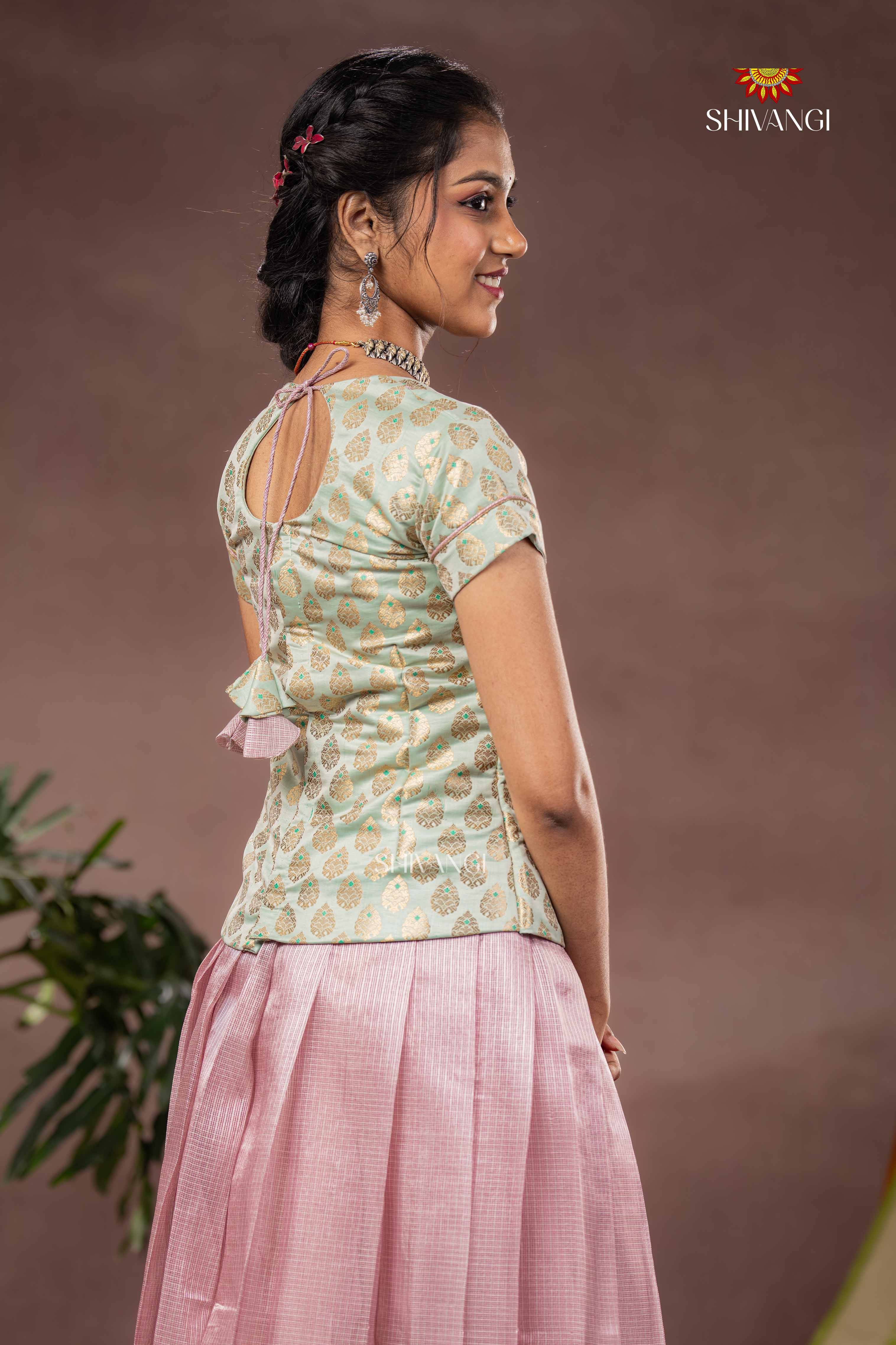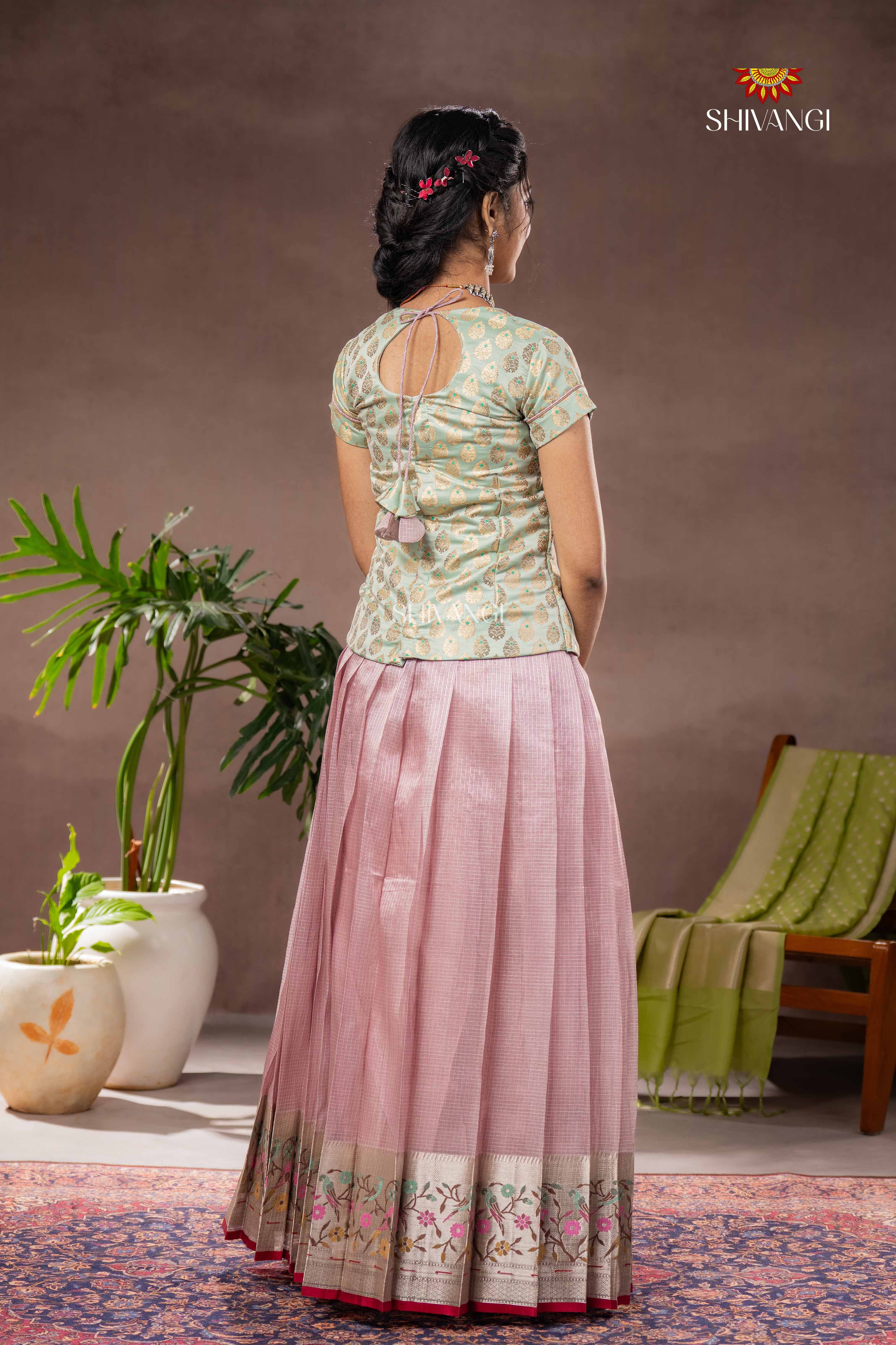 Pink Parrot Traditional Pattu Pavadai Set features a pink top with a round neck and elbow sleeves.