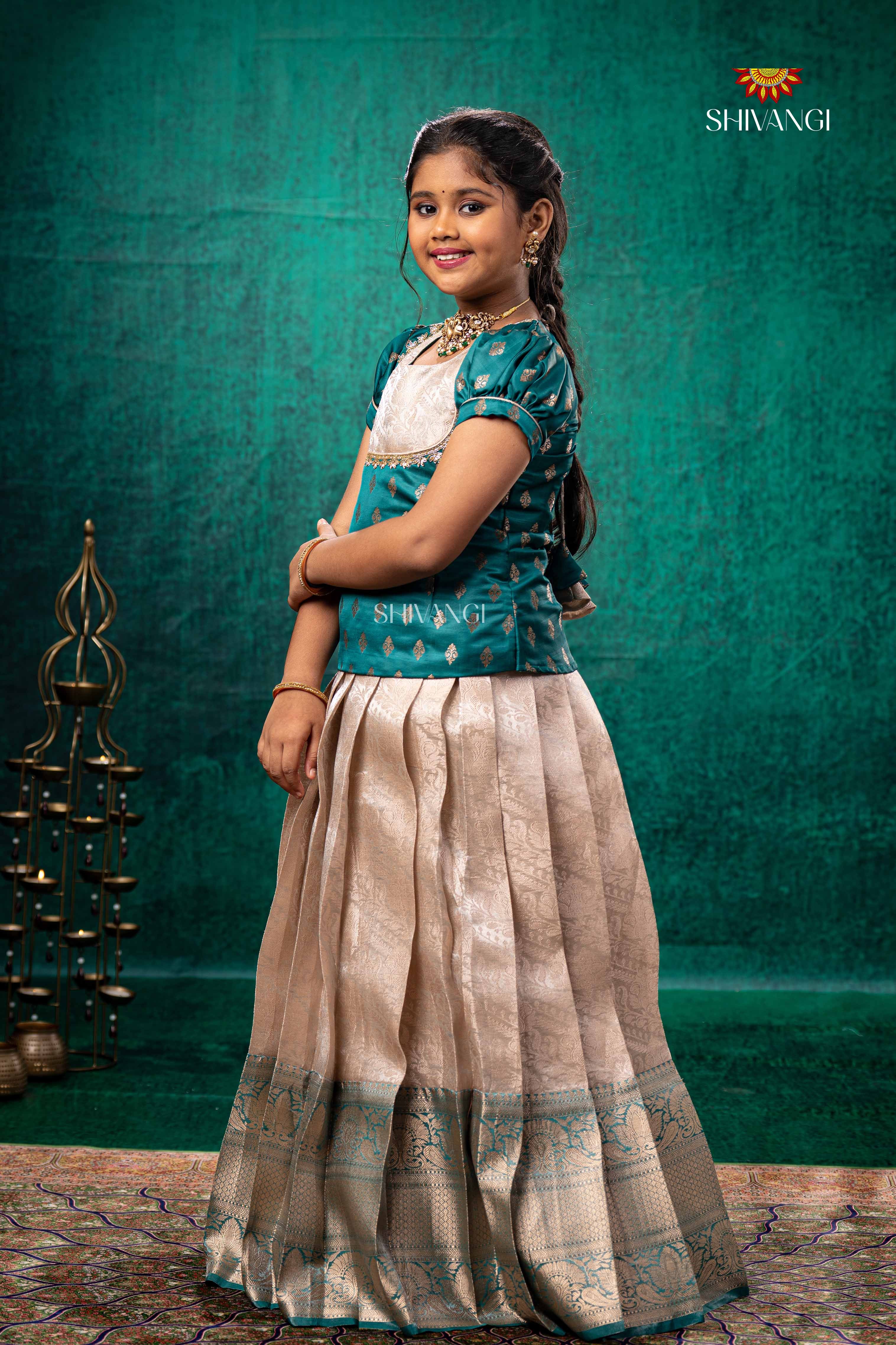Ramar Green Royal Jasmine Traditional Pattu Pavadai Set features a Ramar Green top with a round neck and elbow sleeves.