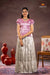Half White Misty Lilac Traditional Pattu Pavadai Set features a pink top with a round neck and elbow sleeves.