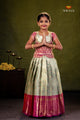 Pink Tissue Turmeric Traditional Pattu Pavadai Set features a top with a round neck and elbow sleeves.