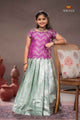 Red Kota Moraccan Traditional Pattu Pavadai Set features a red top with a round neck and elbow sleeves.