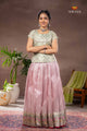 Red Mayapavai Traditional Pattu Pavadai Set features a silver top with a round neck and elbow sleeves.