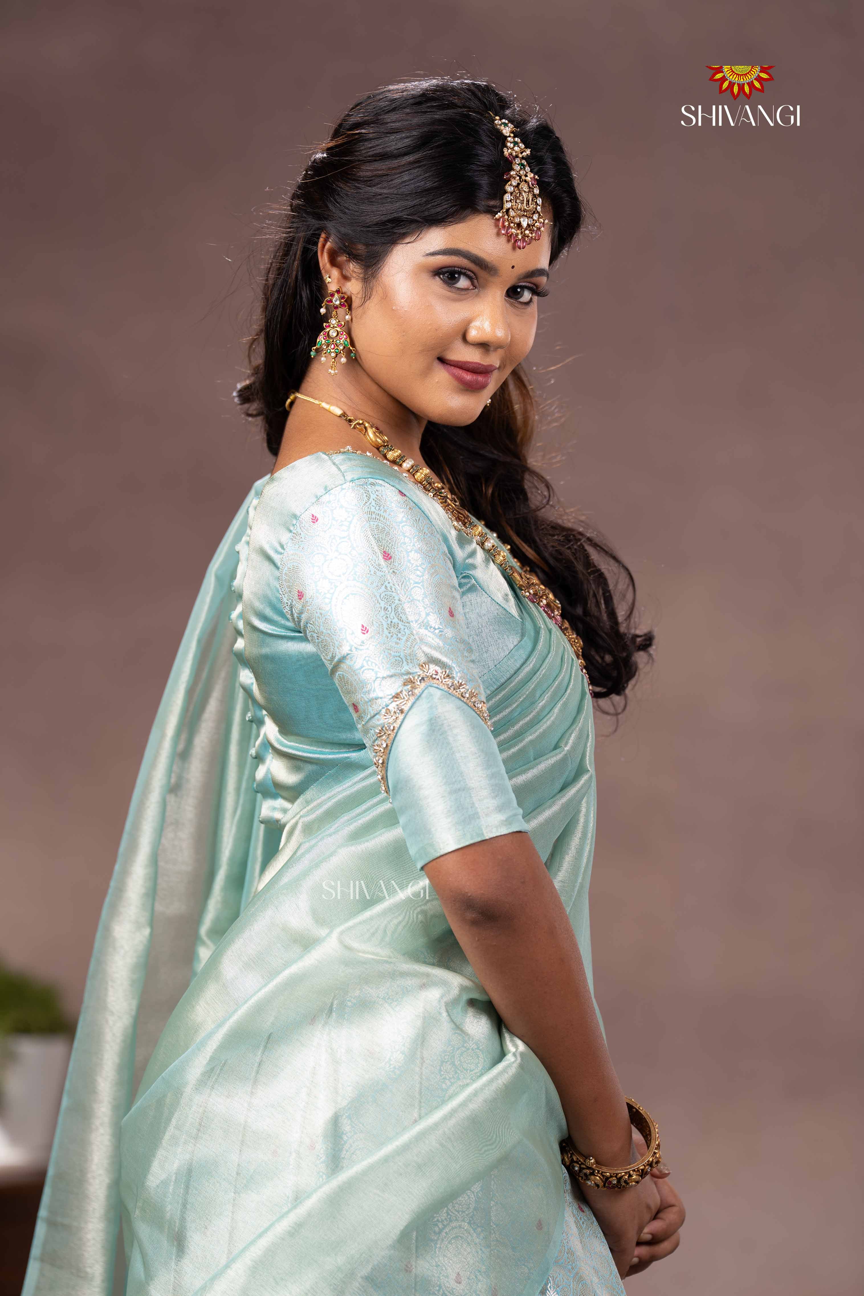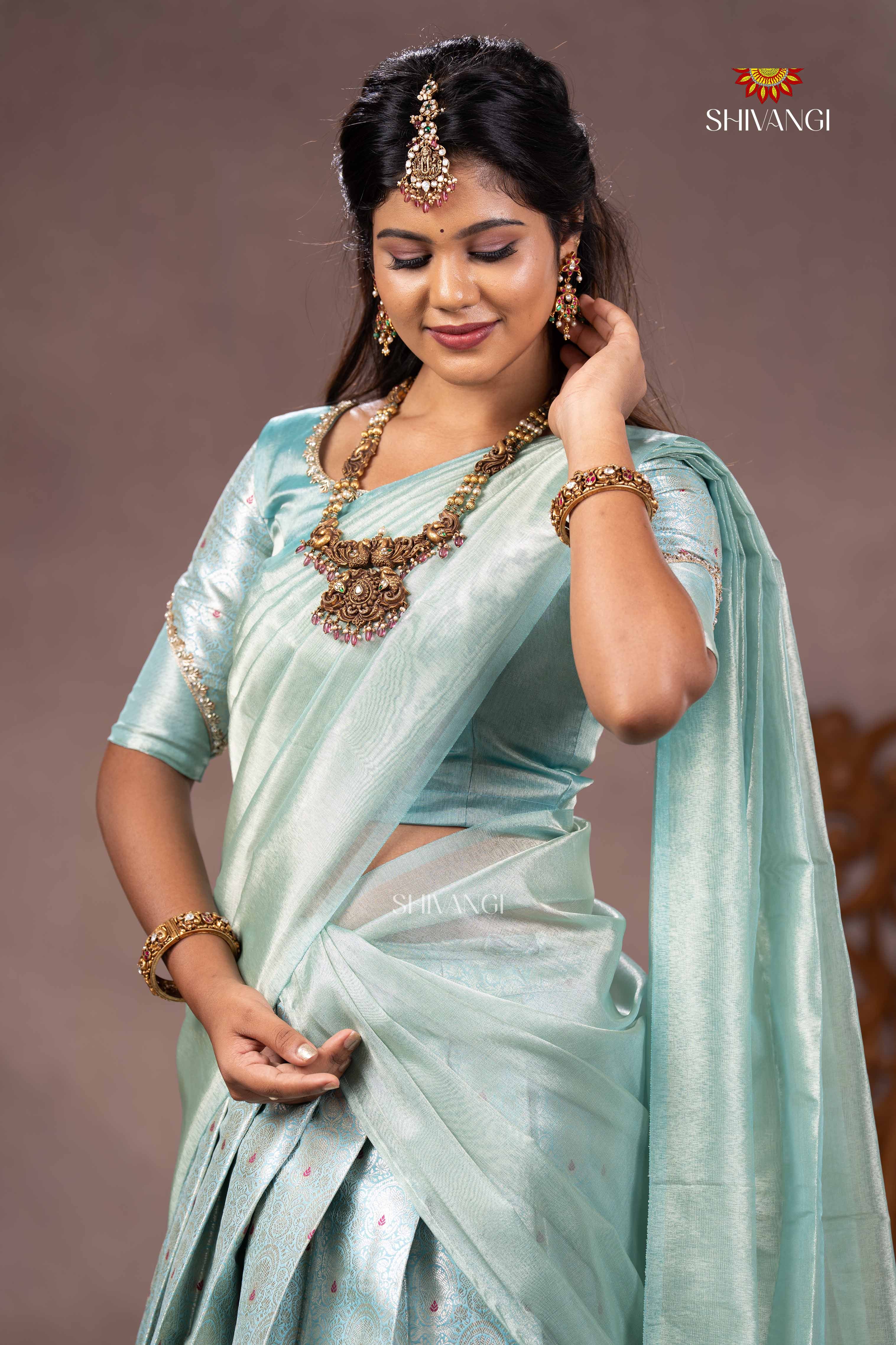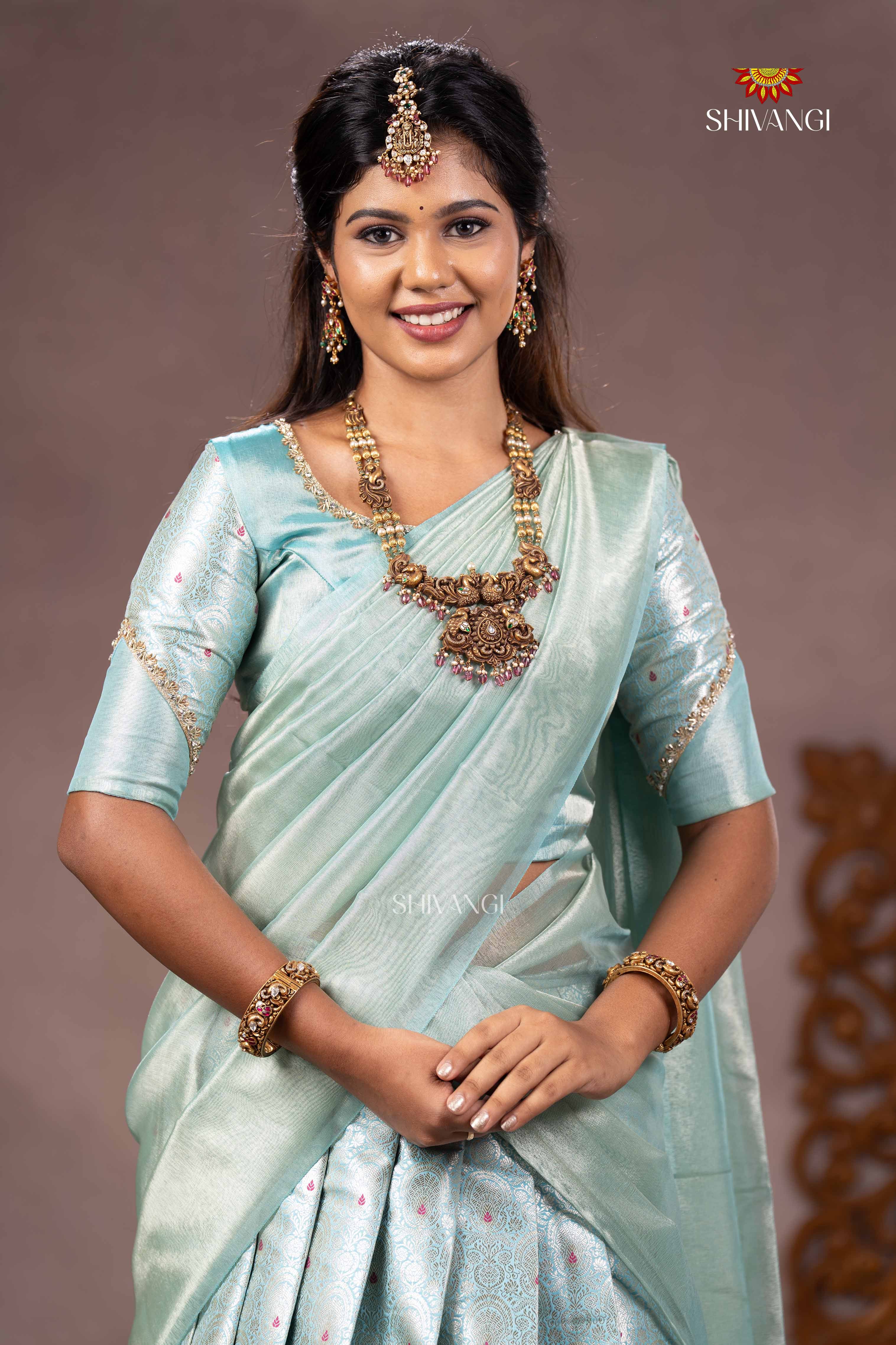Sky Blue Brocade Waves Half Saree | Lehenga For Girls