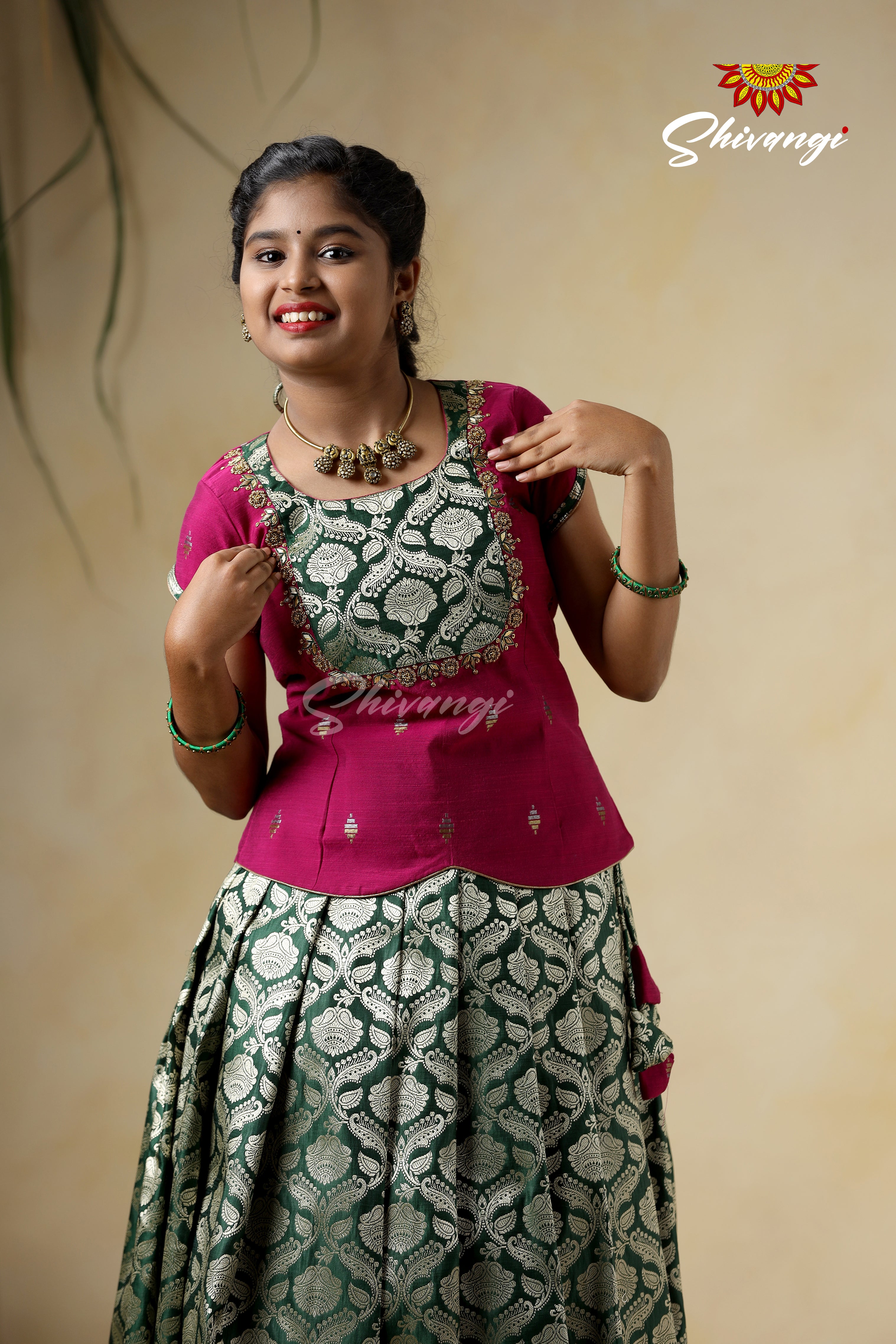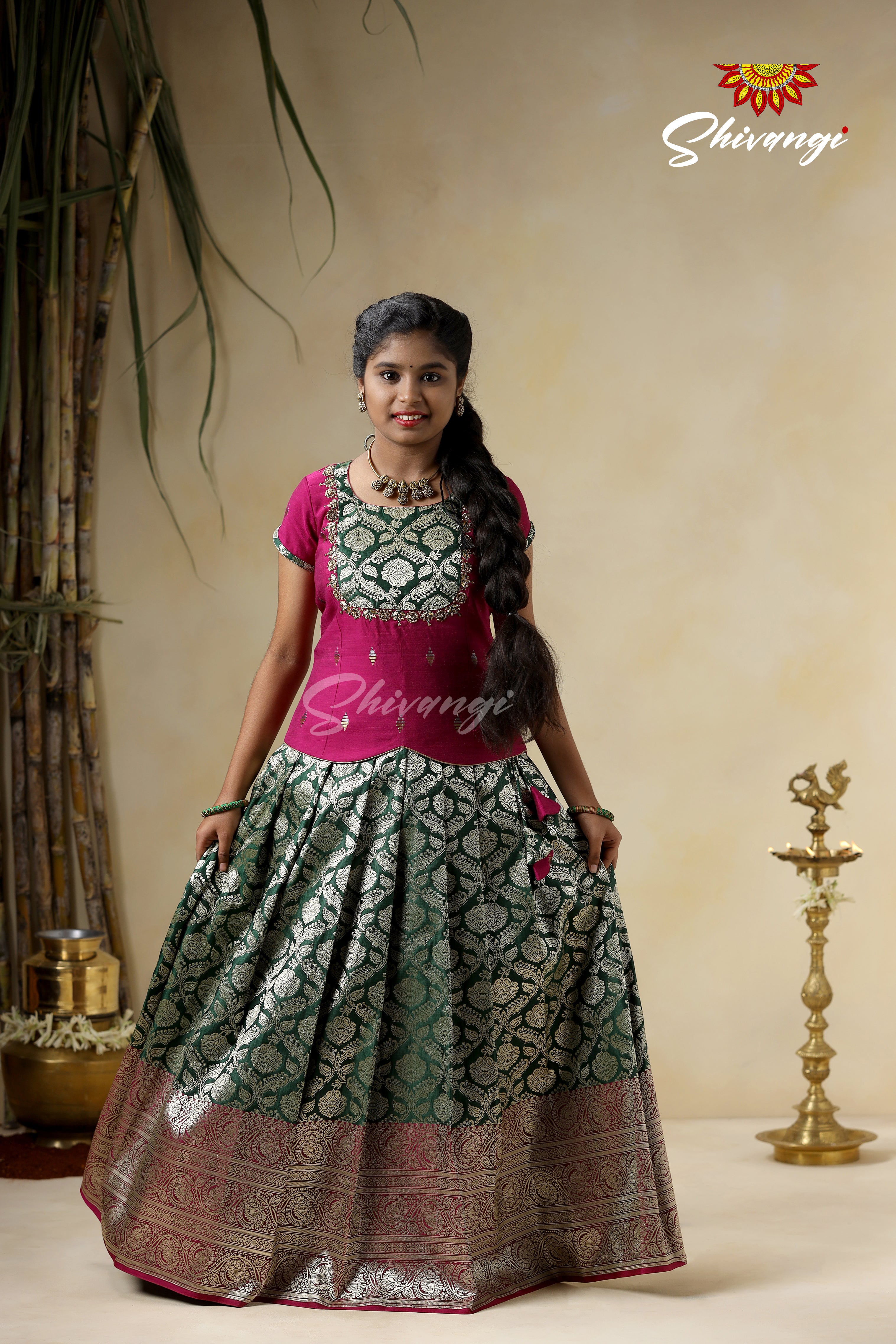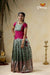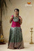 Embroidery Pattu Pavadai Designs for Girls - Green Satin Diya