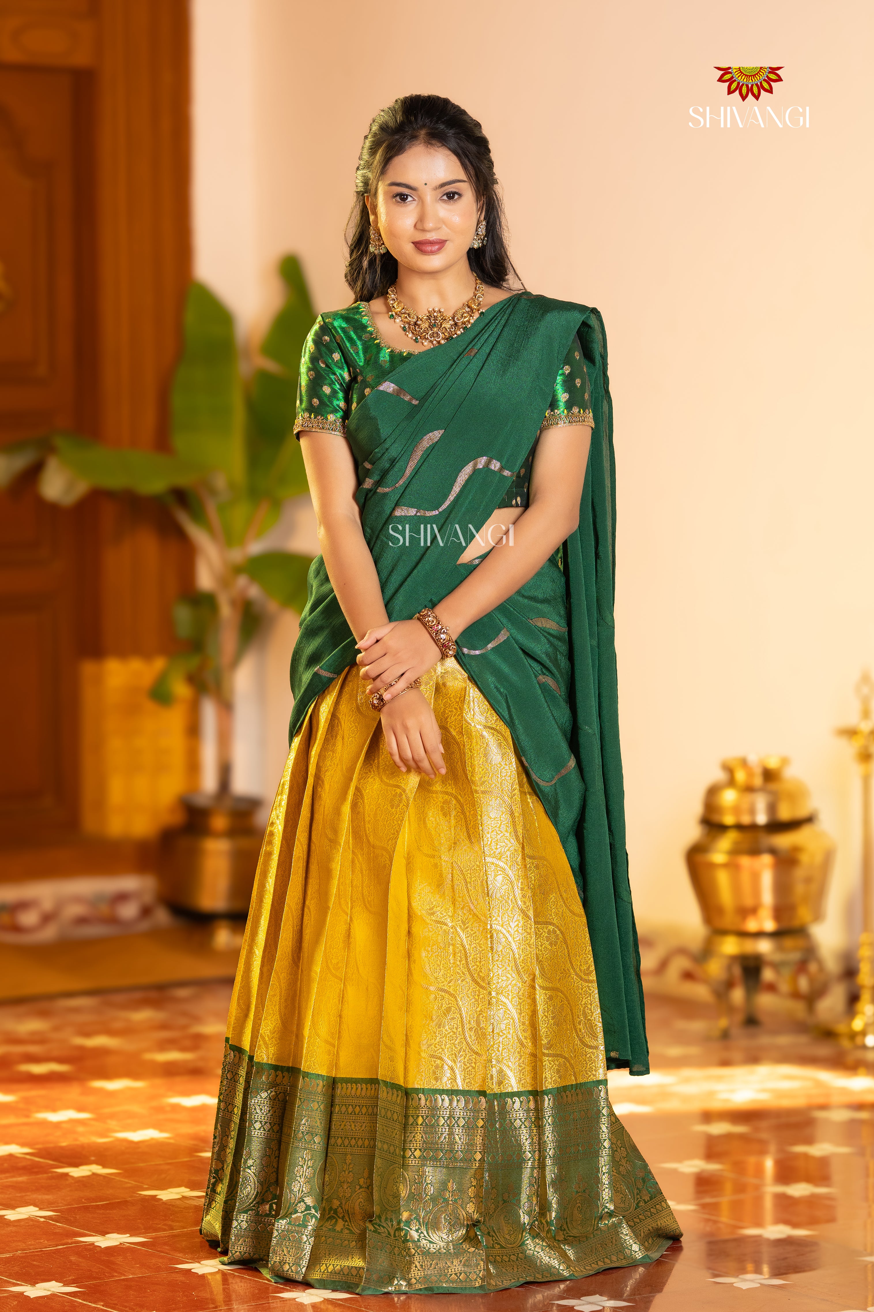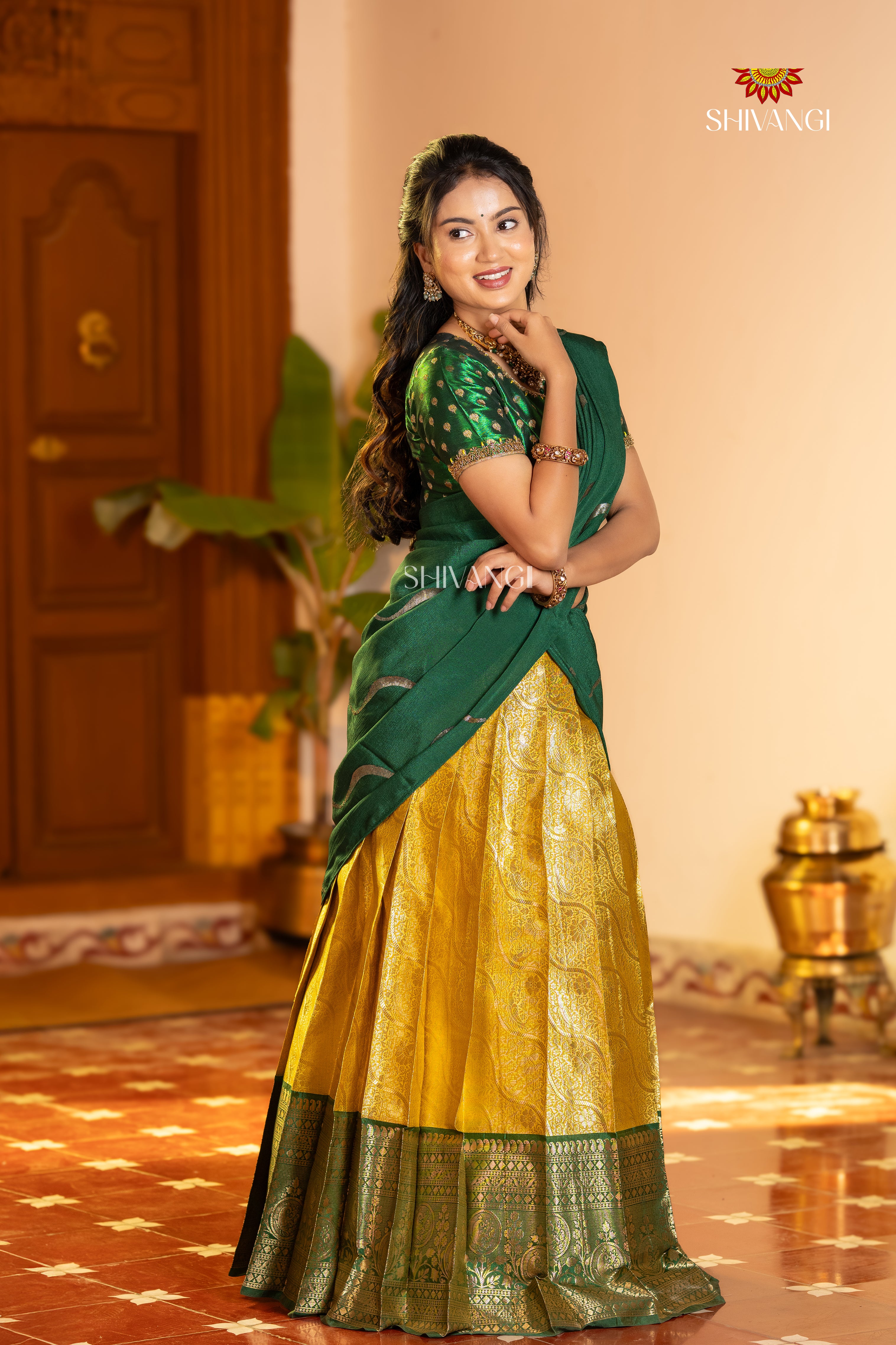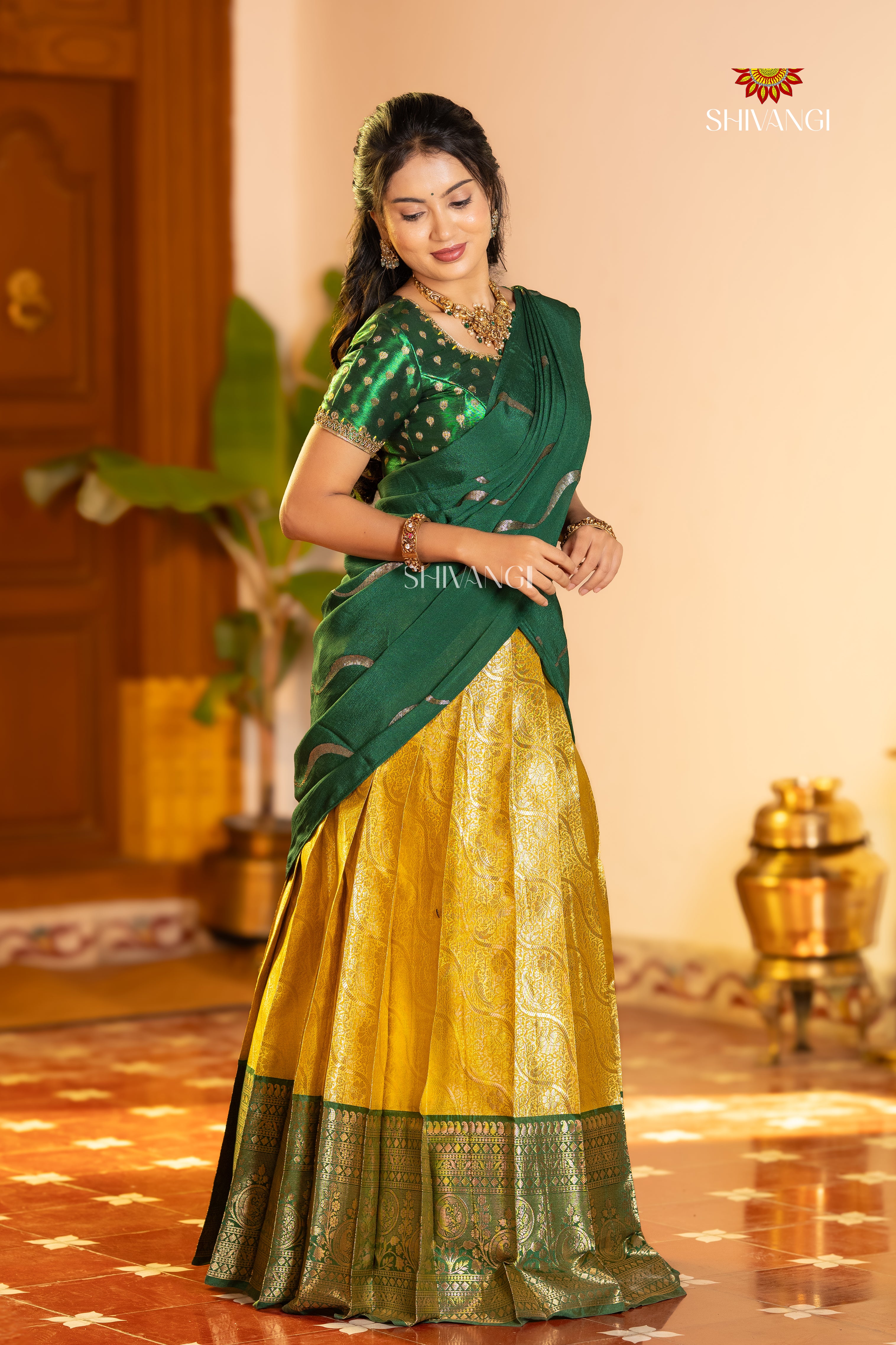 Yellow Golden Annam Emb Half Saree | Lehenga For Girls