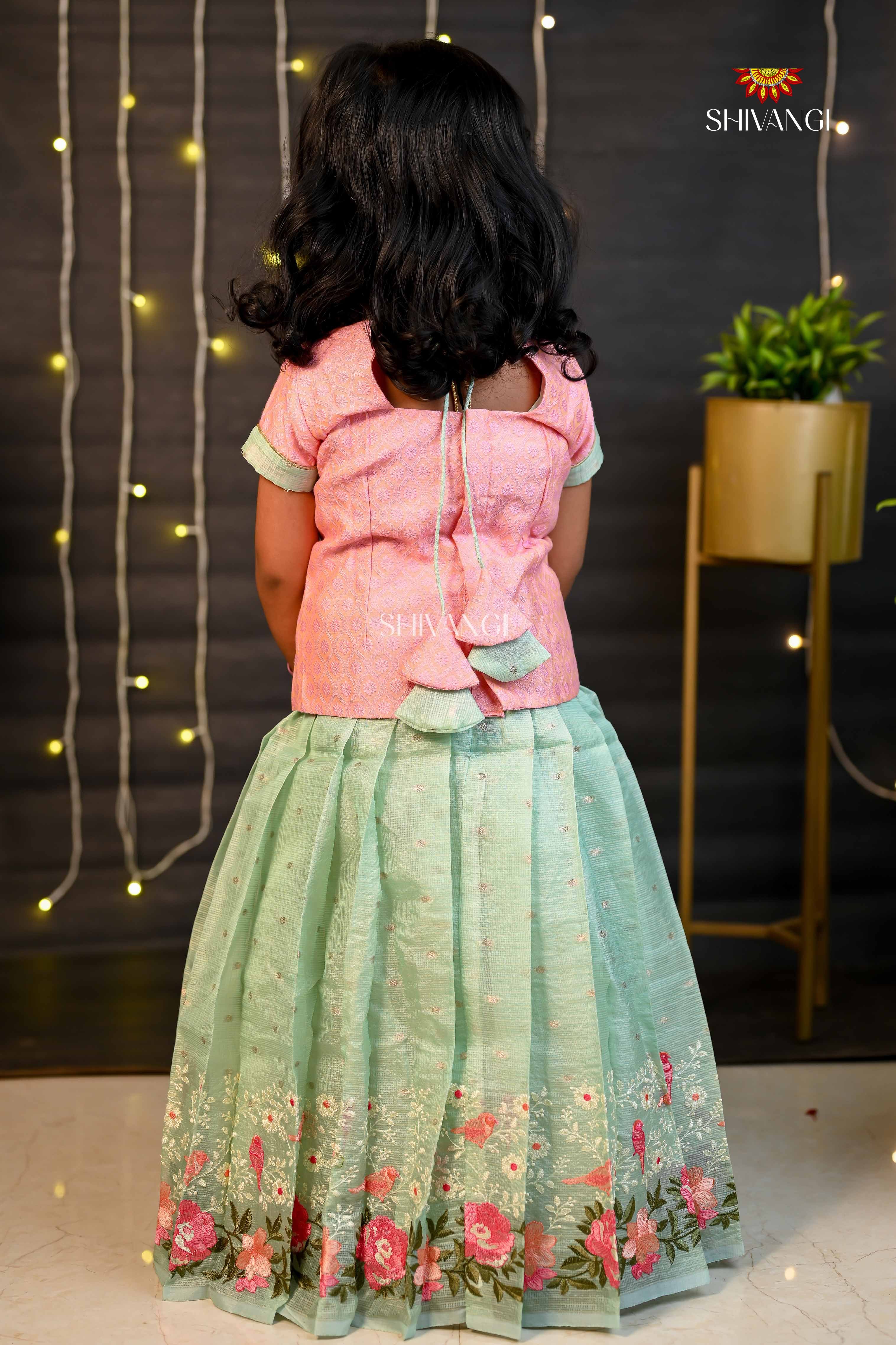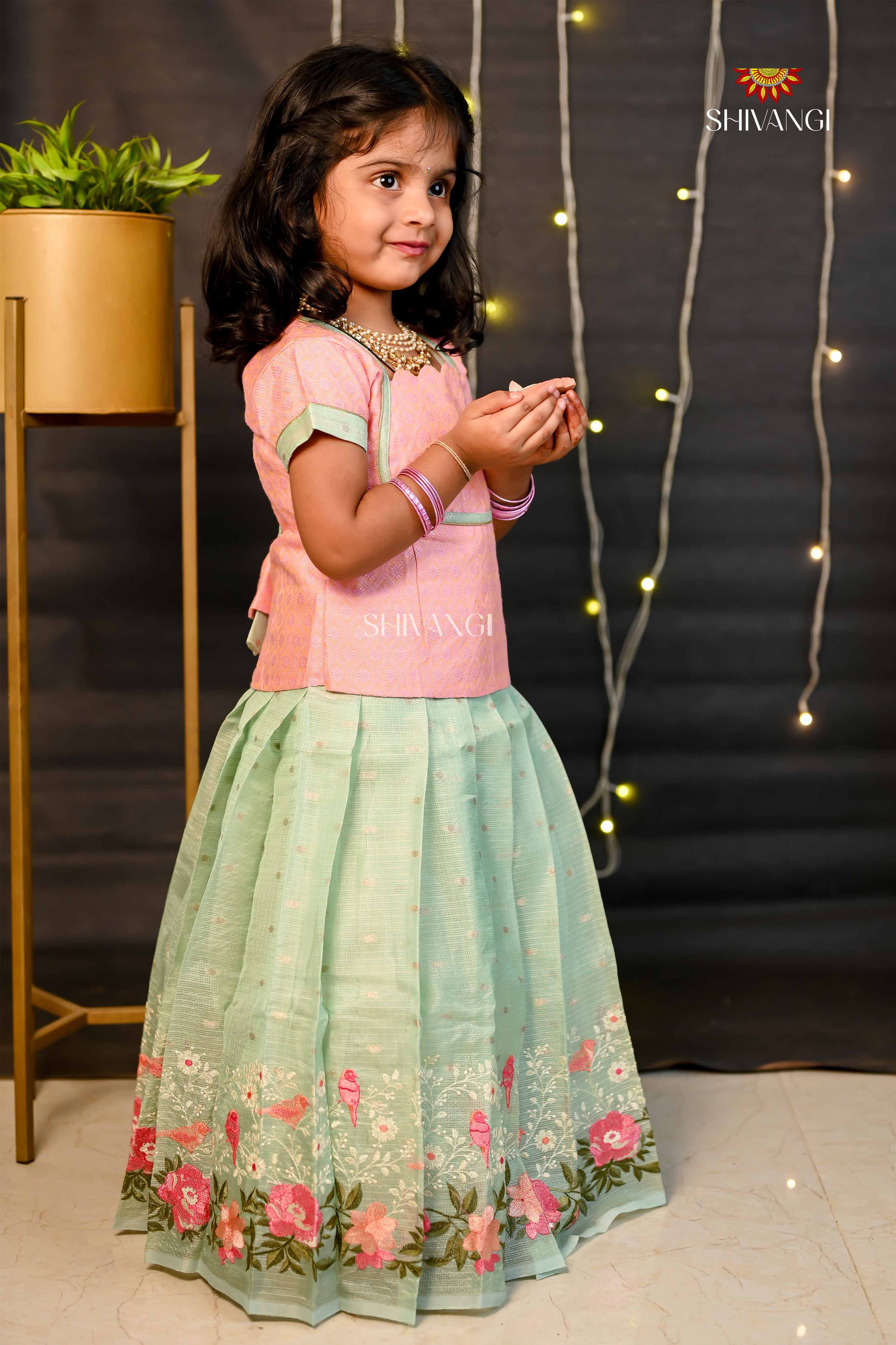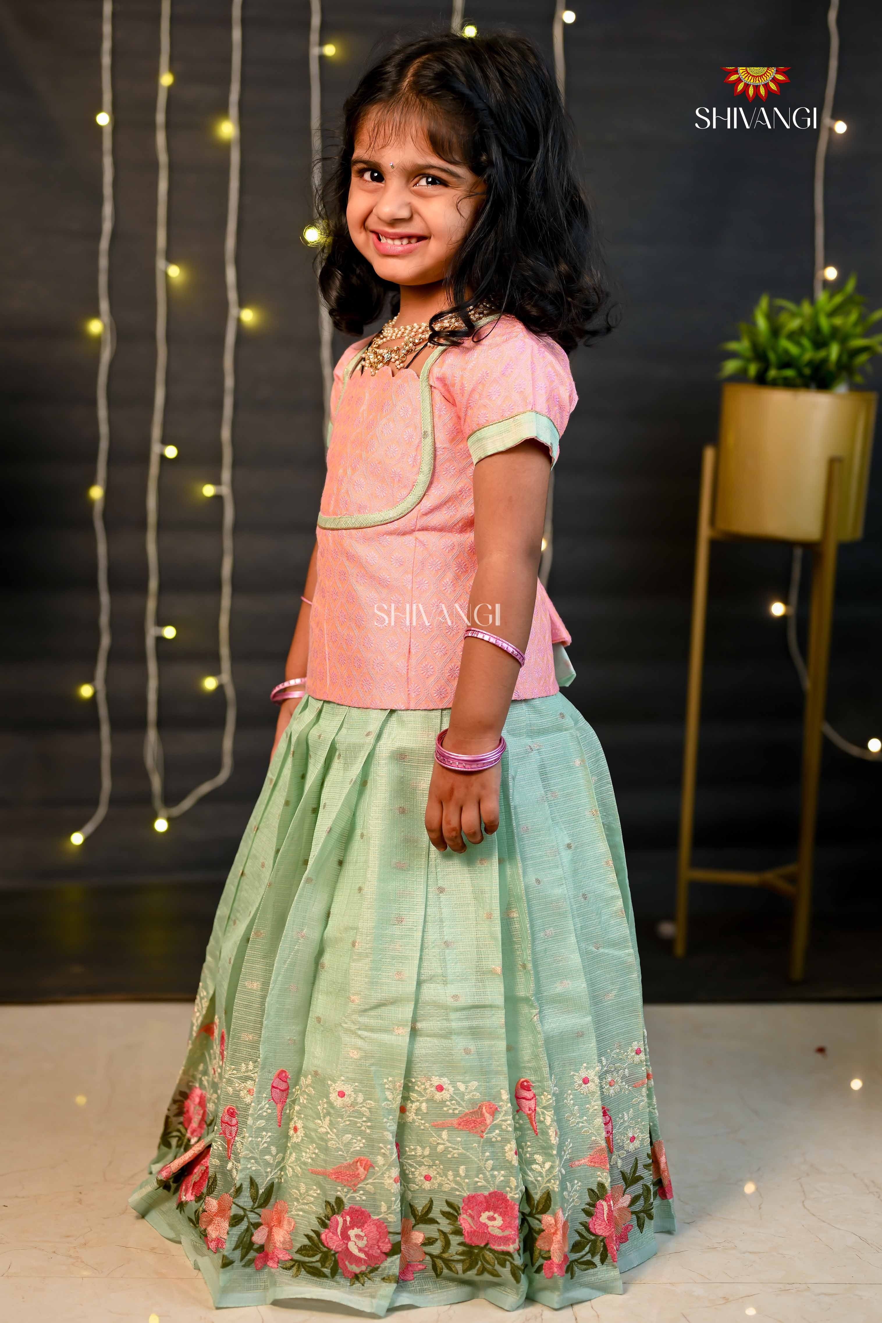 Green Pink Sparrow Traditional Pattu Pavadai Set features a top with a round neck and elbow sleeves.