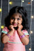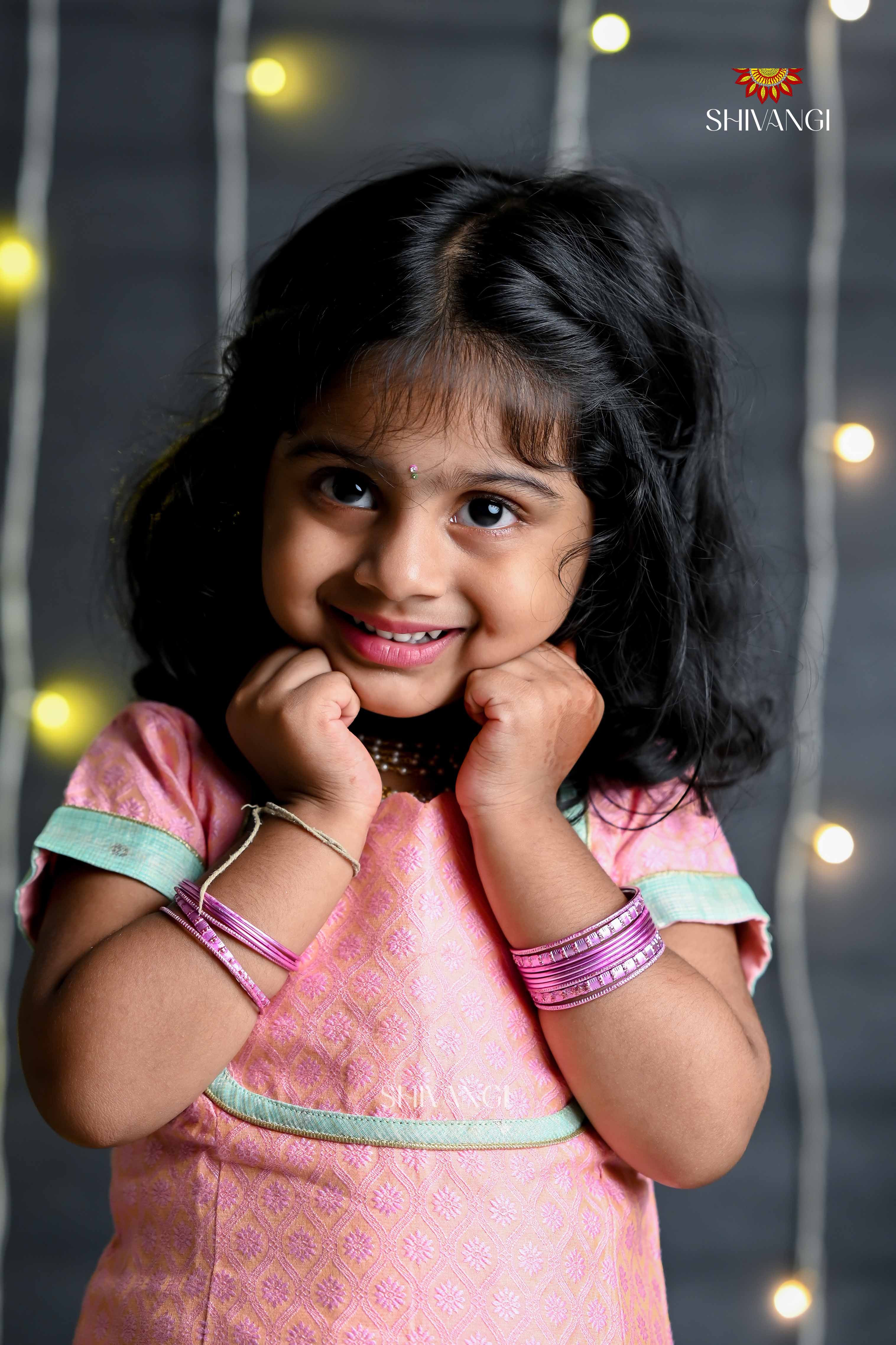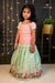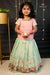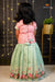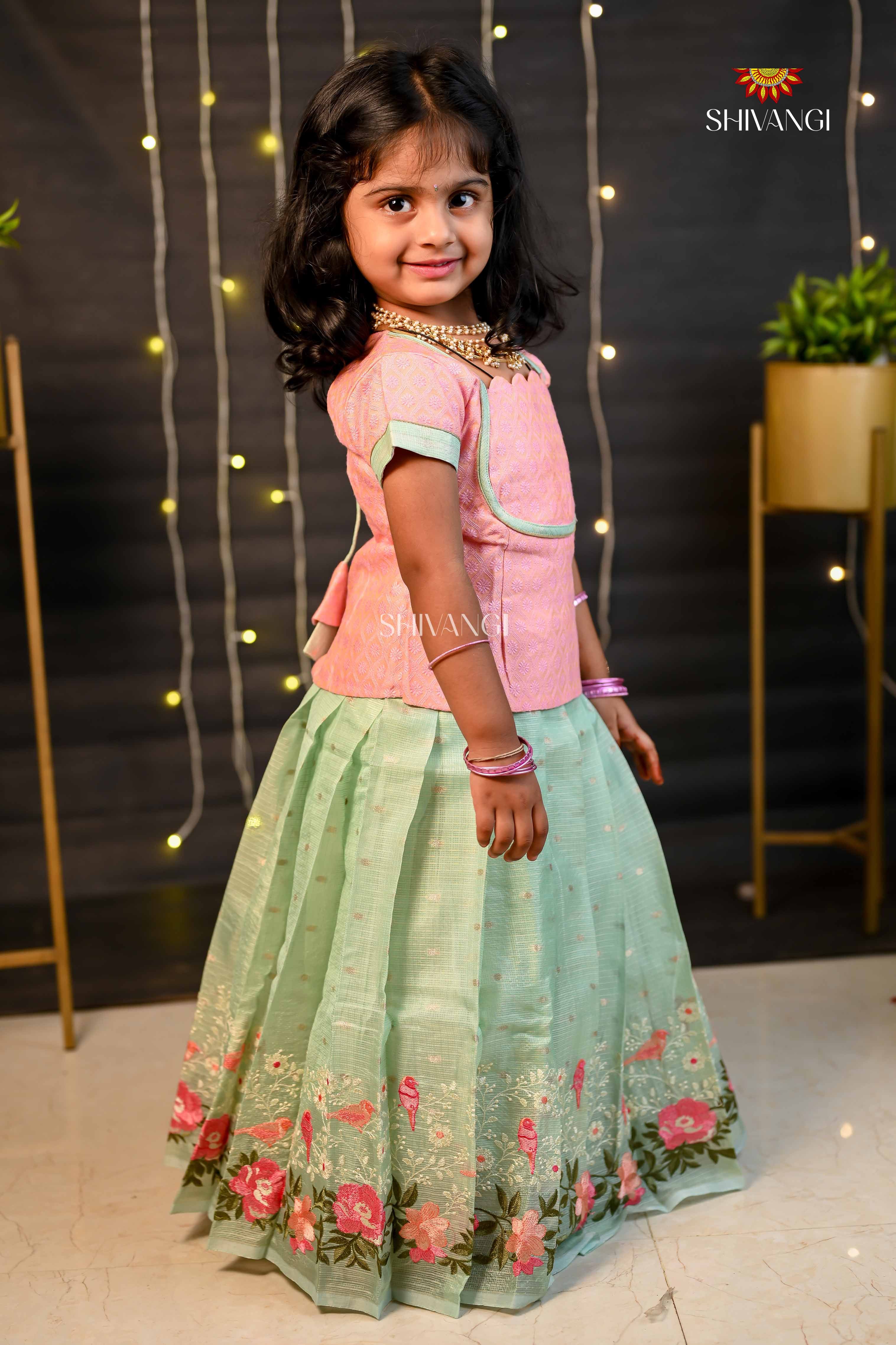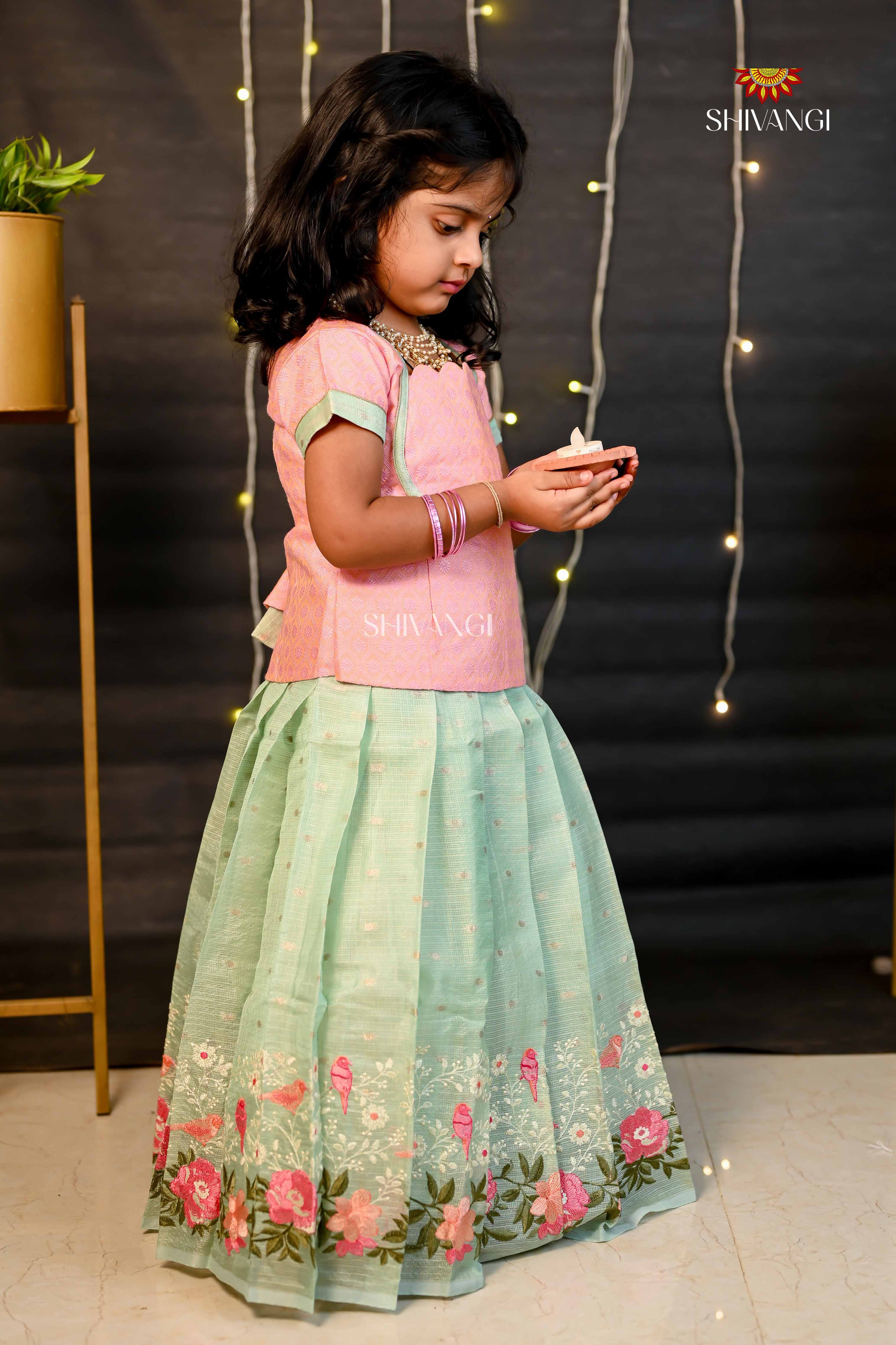 Green Pink Sparrow Traditional Pattu Pavadai Set features a top with a round neck and elbow sleeves.
