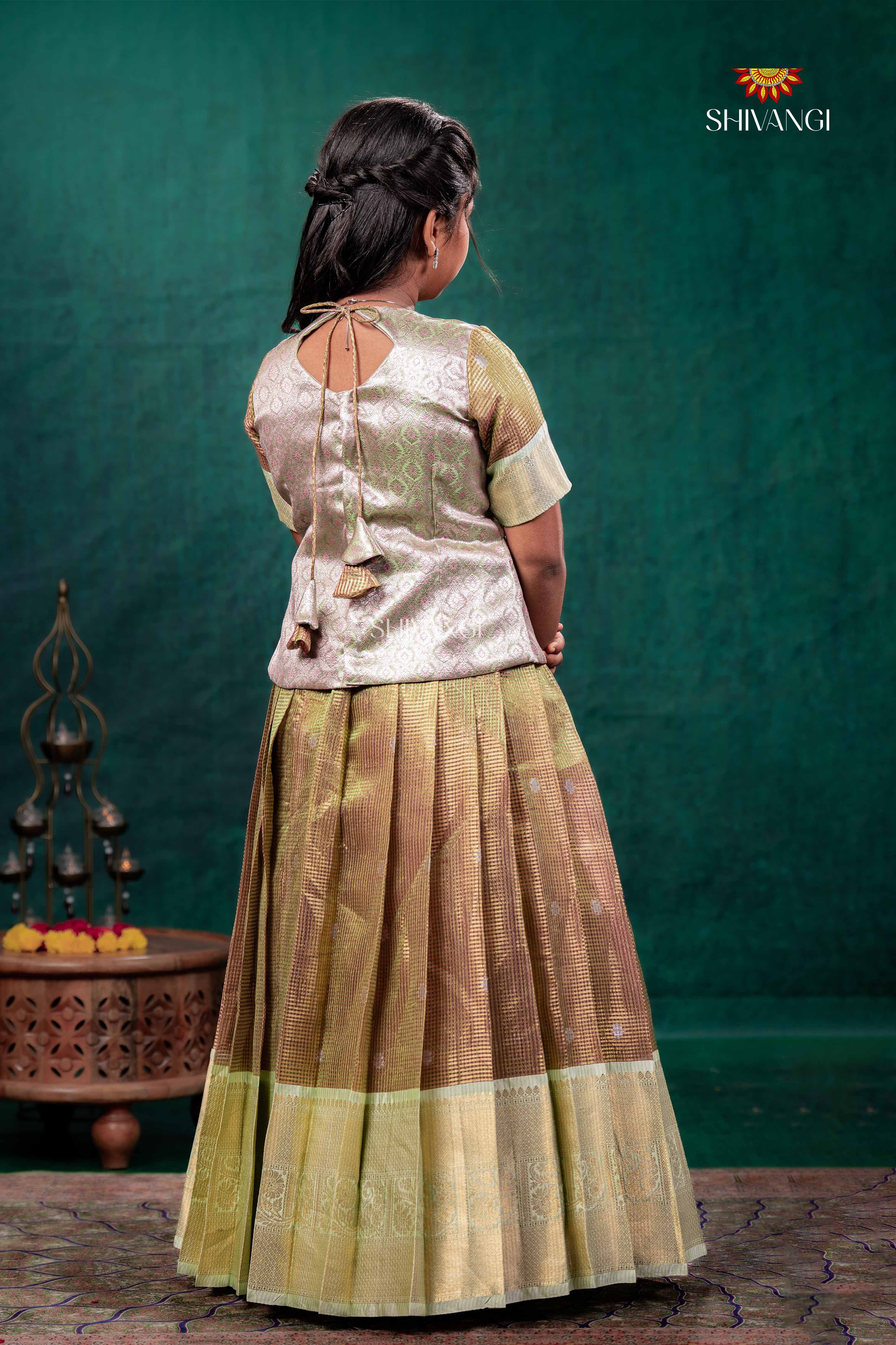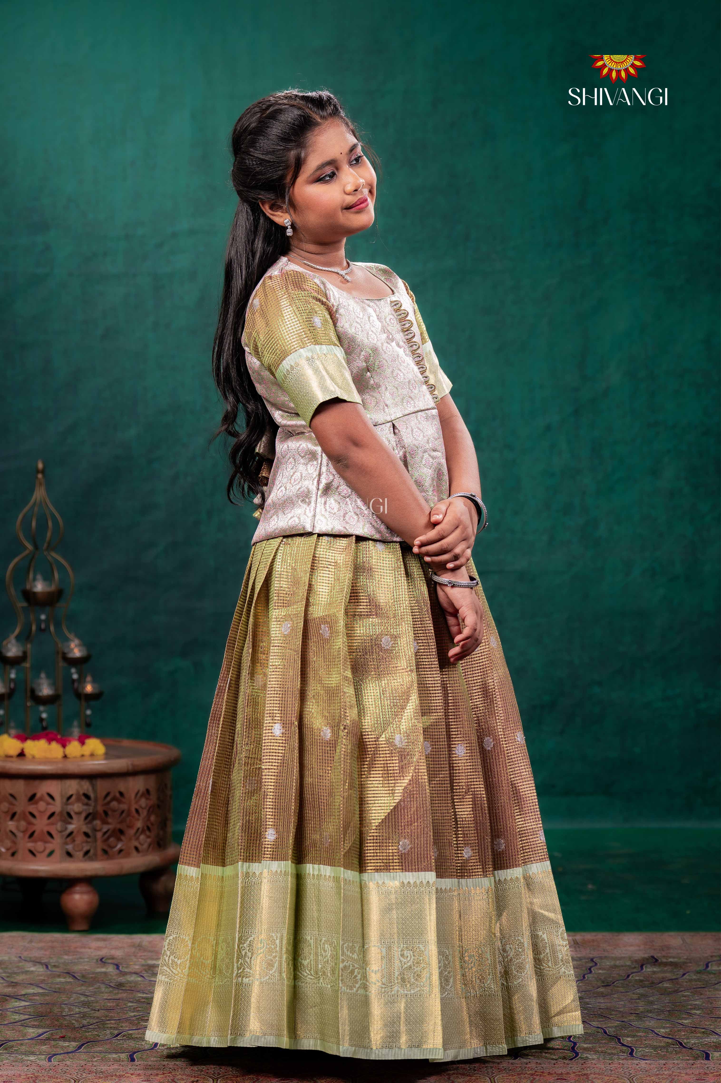 Green Mayaparvai Traditional Pattu Pavadai Set features a silver top with a round neck and elbow sleeves.