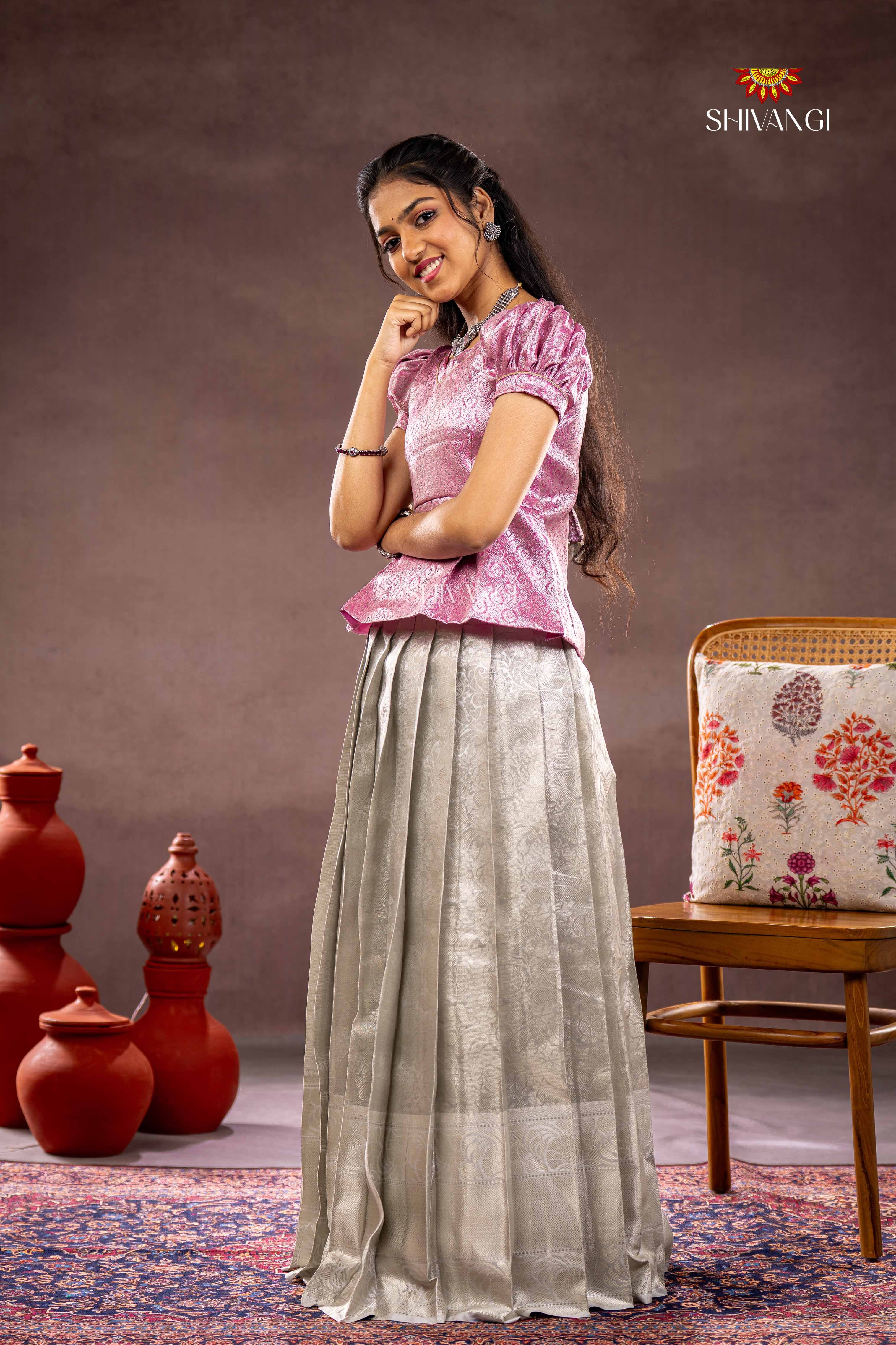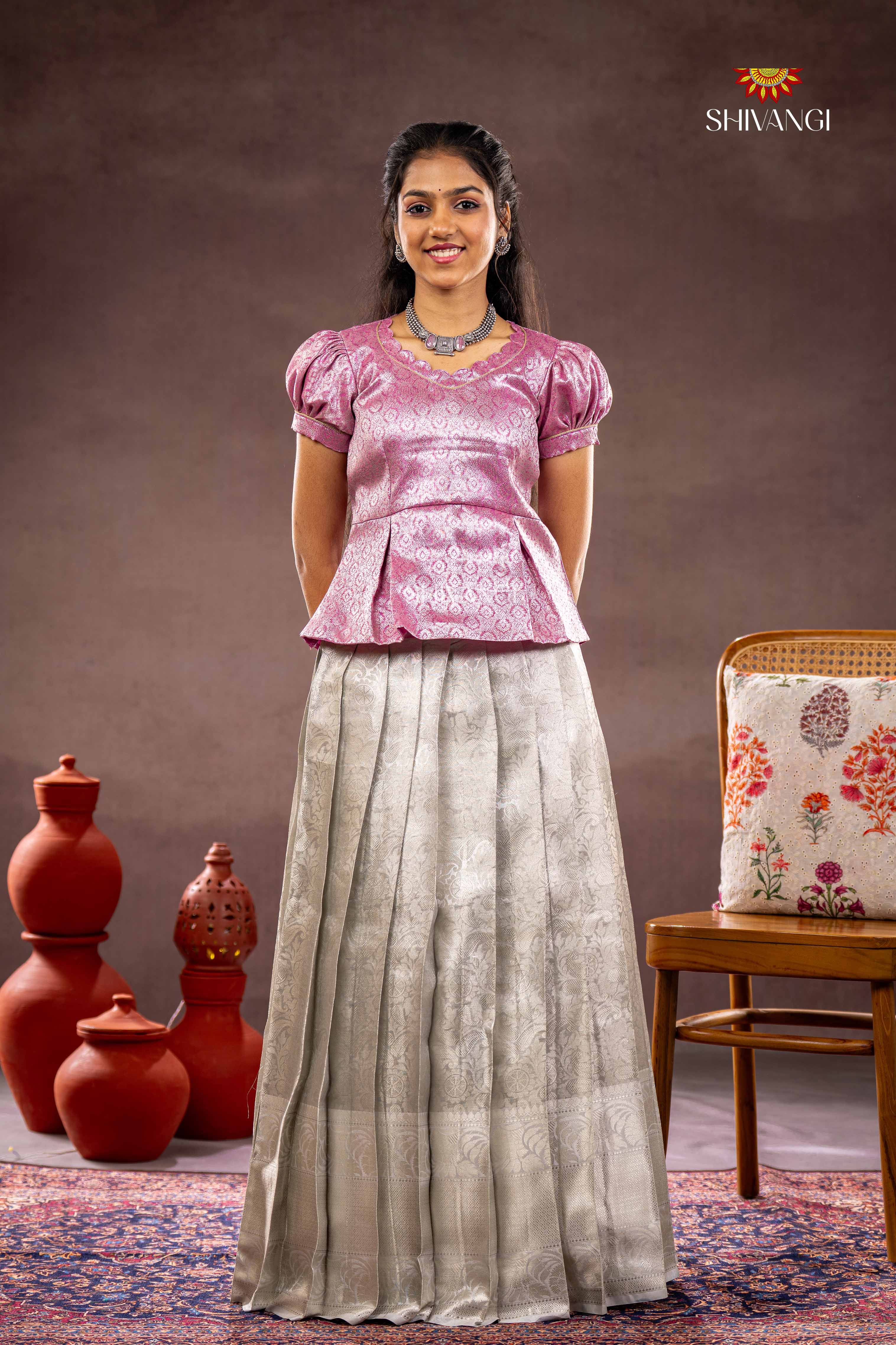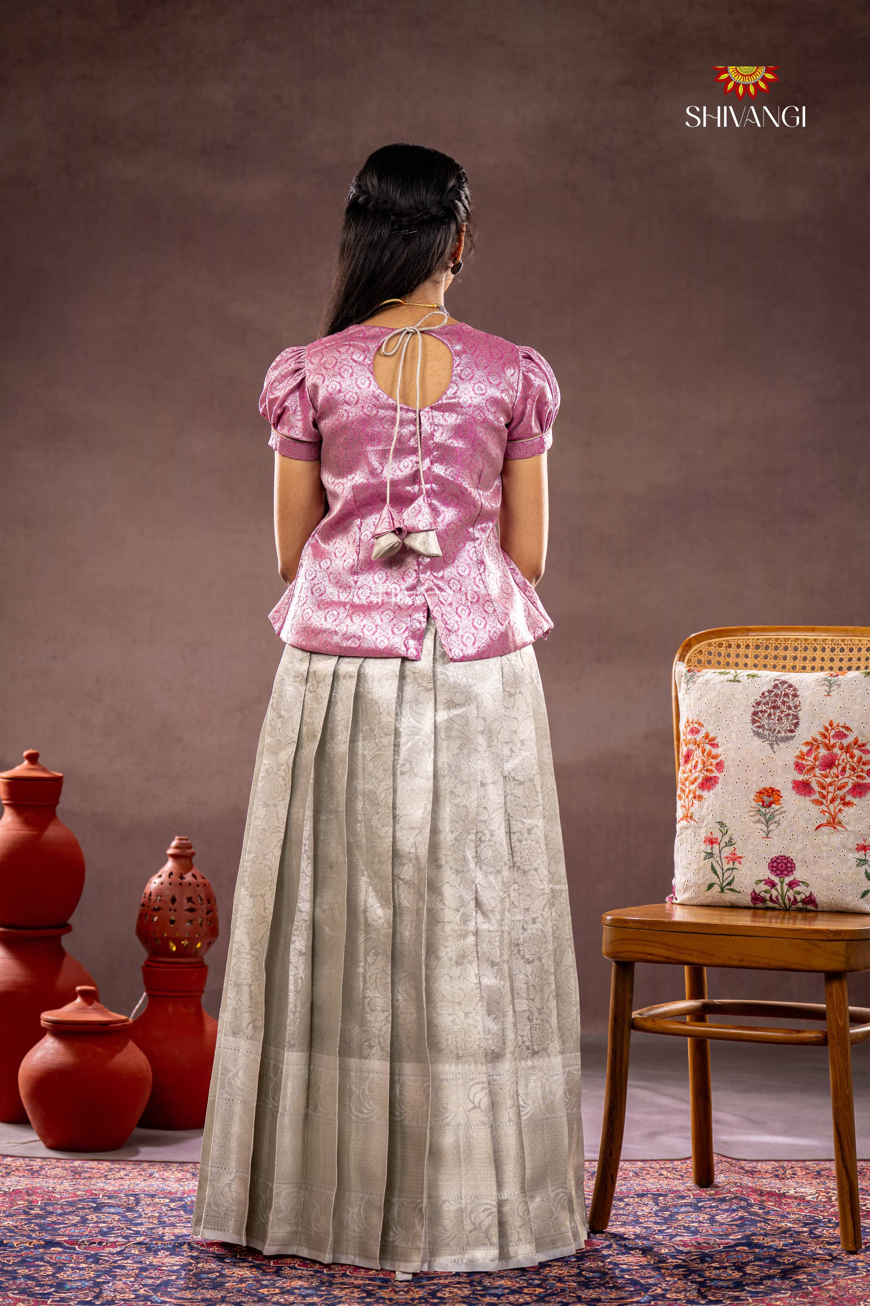 Half White Misty Lilac Traditional Pattu Pavadai Set features a pink top with a round neck and elbow sleeves.