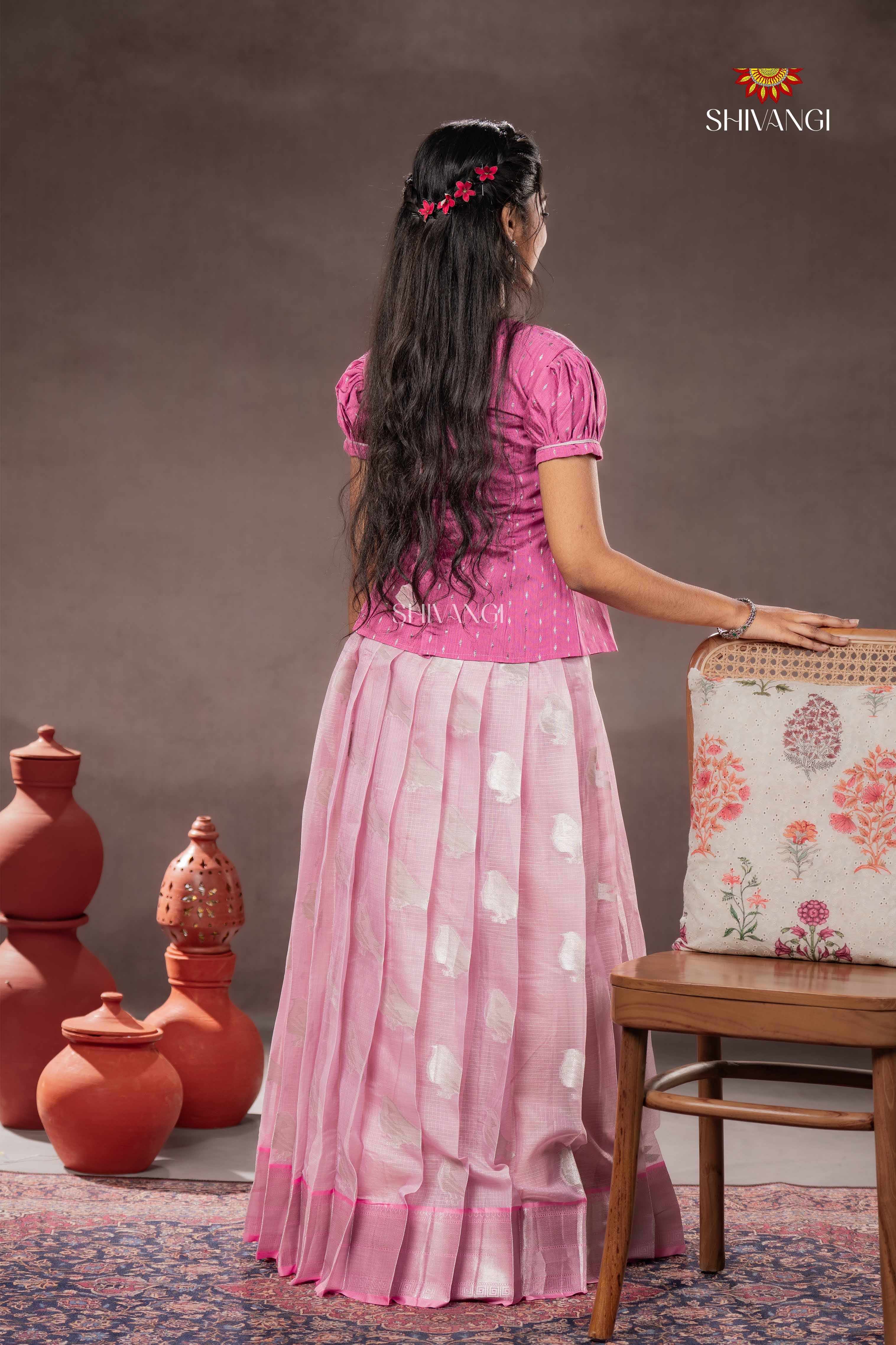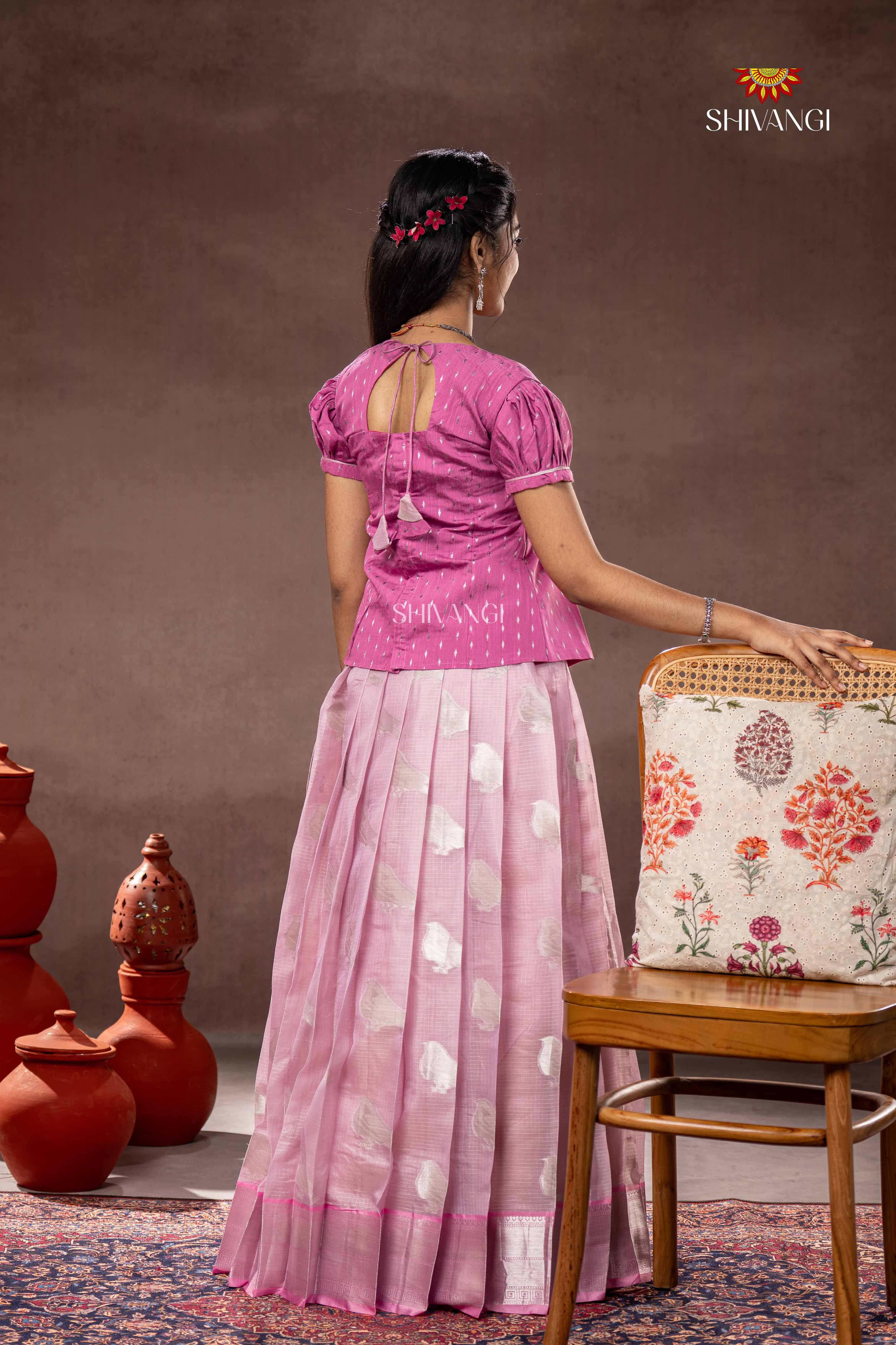Lavender Silver Bird Traditional Pattu Pavadai Set features a top with a round neck and elbow sleeves.