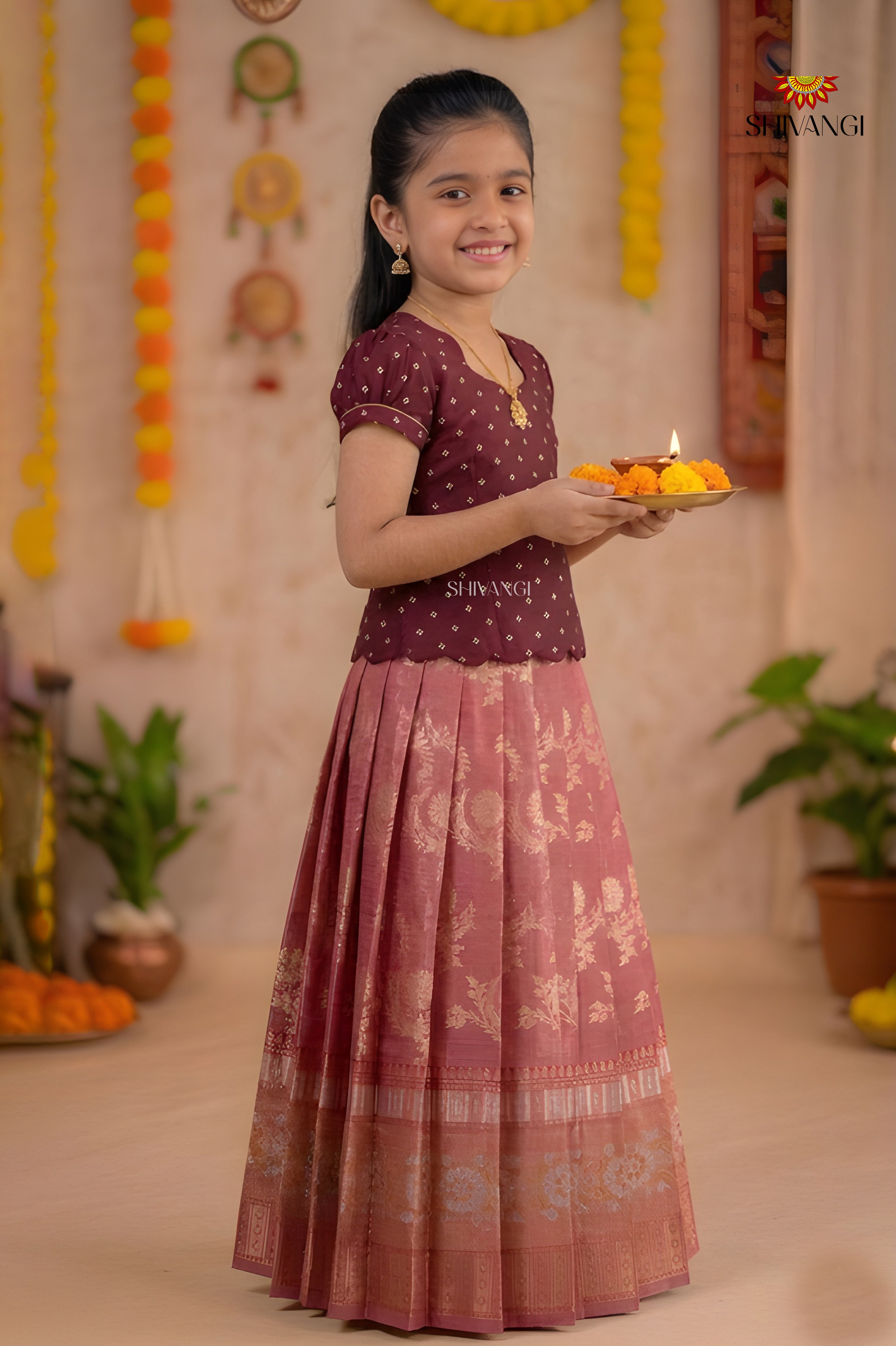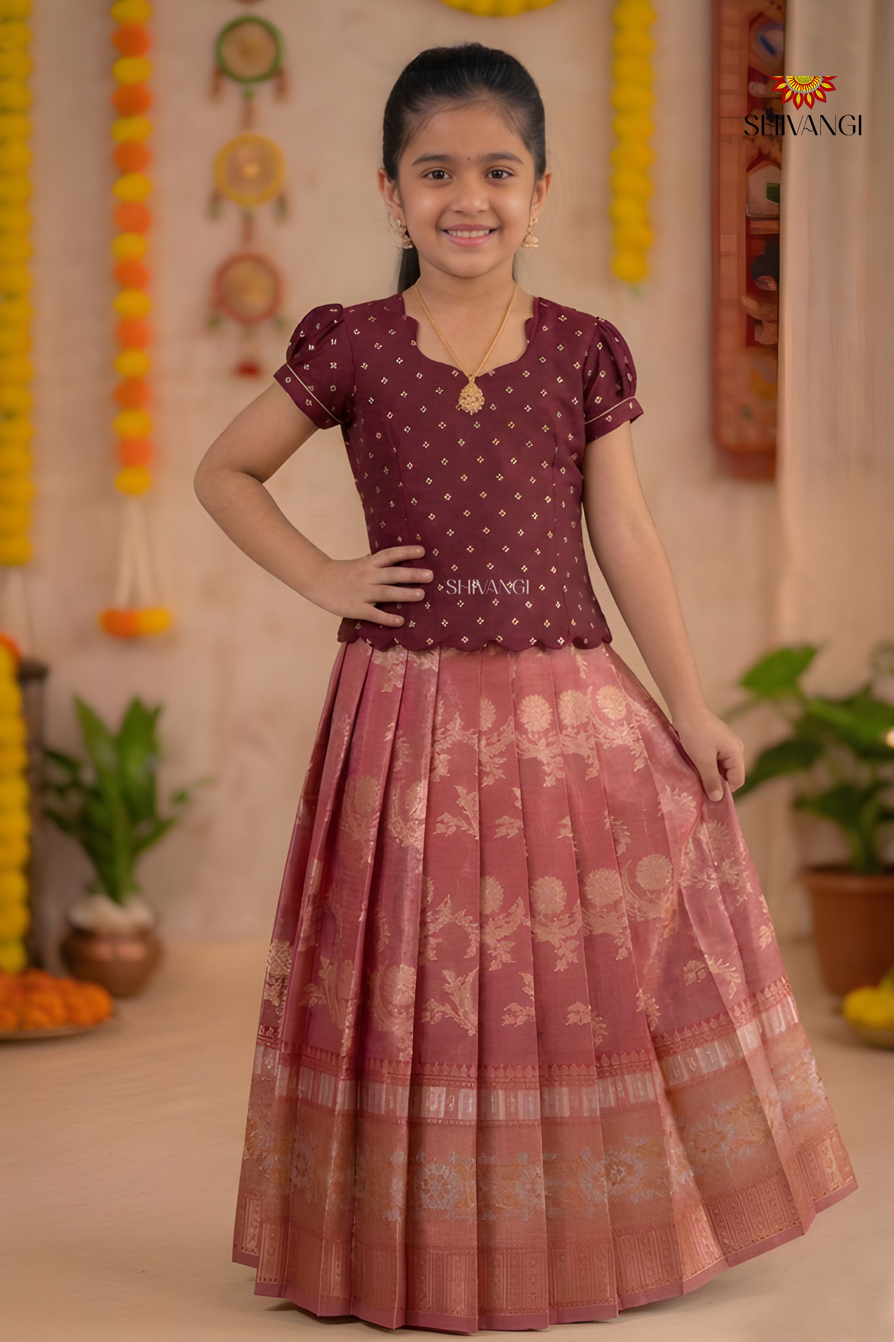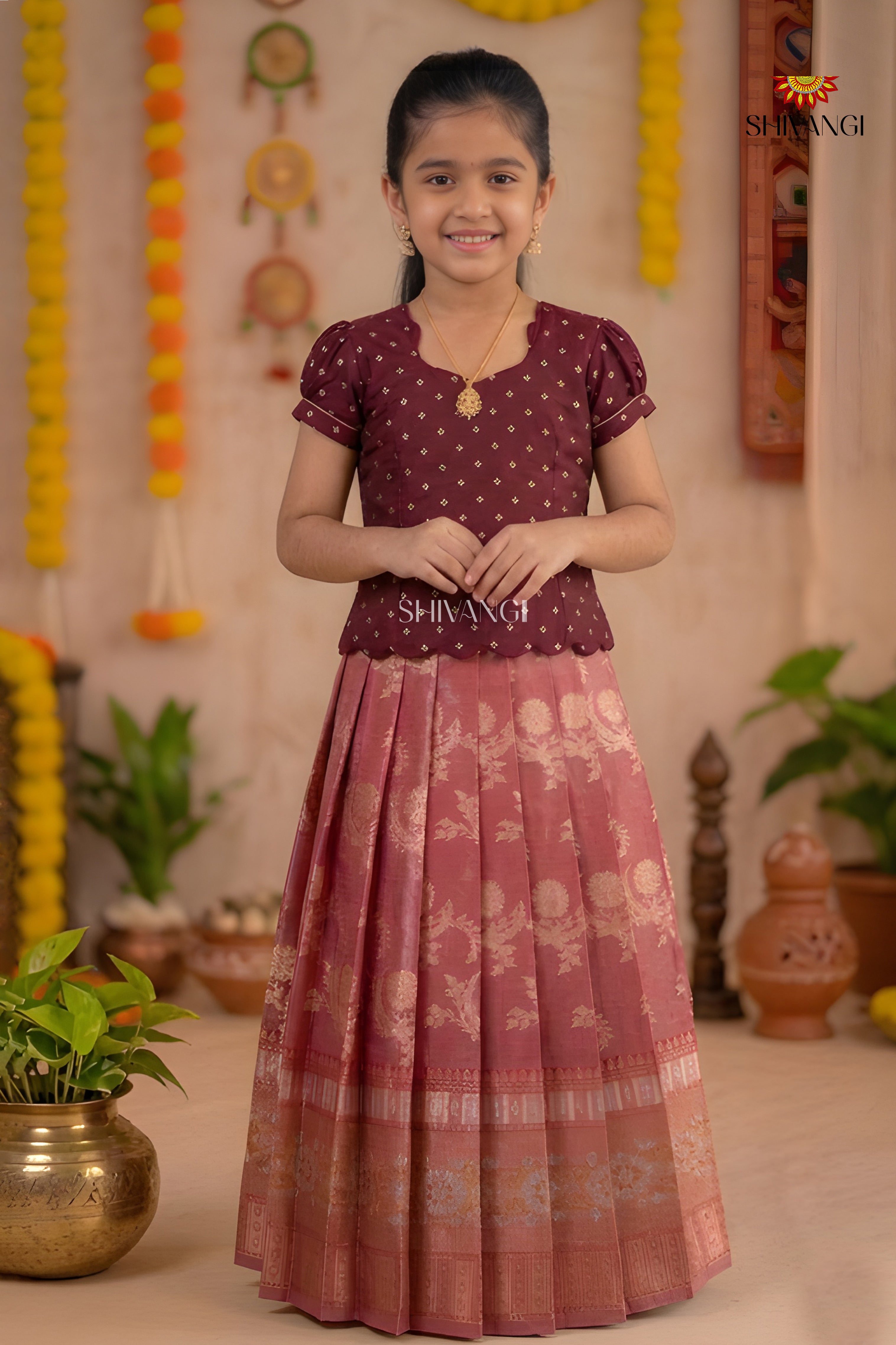 Maroon Floral Moon Traditional Pattu Pavadai Sets