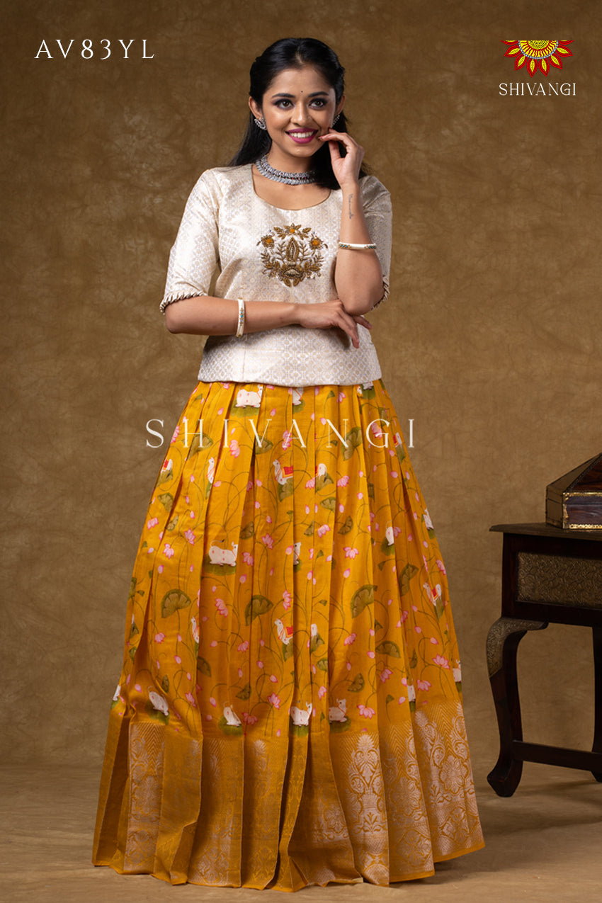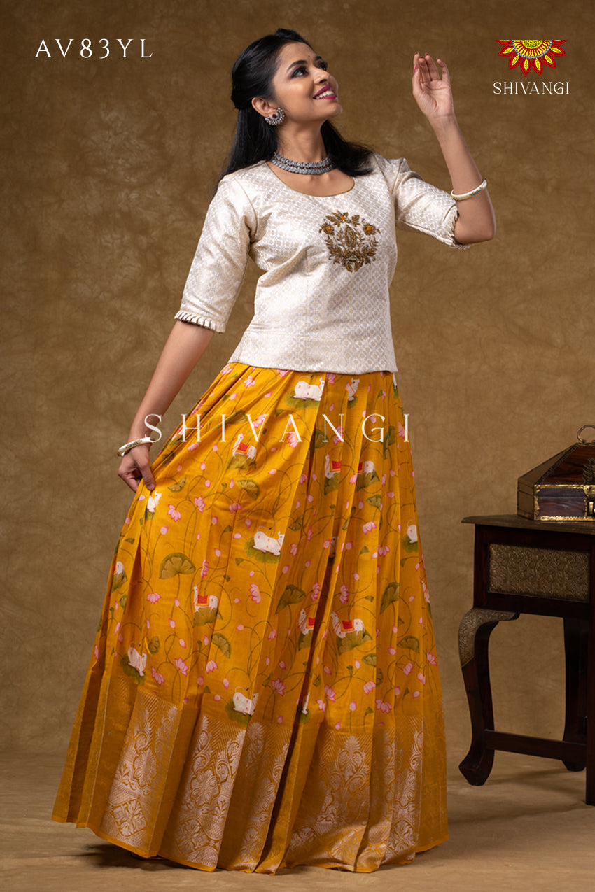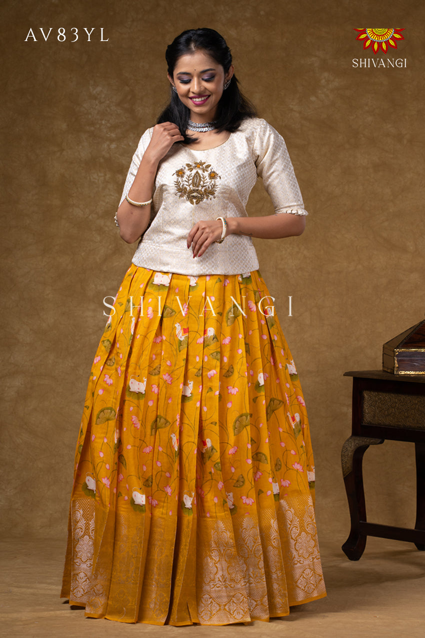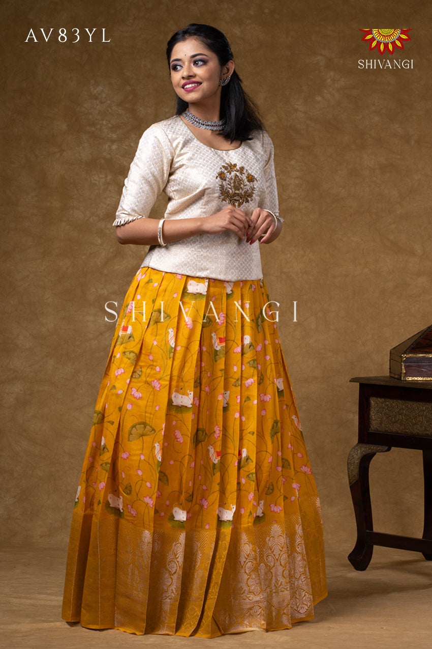 Onam Collection - Yellow Pure Chanderi Pichwai Pavadai Set
