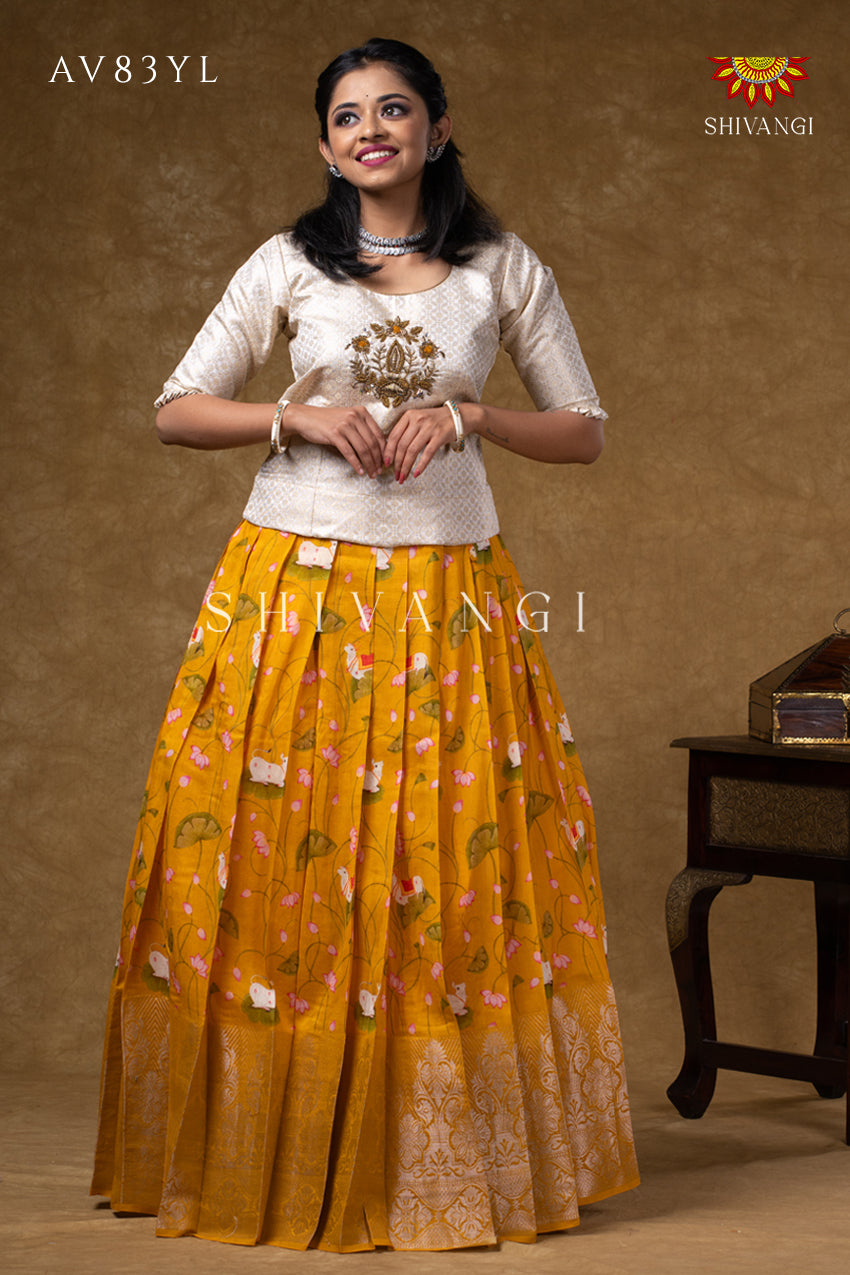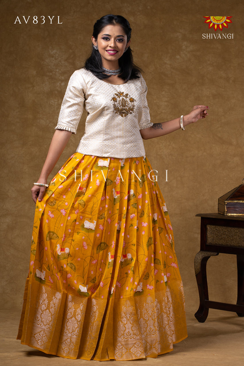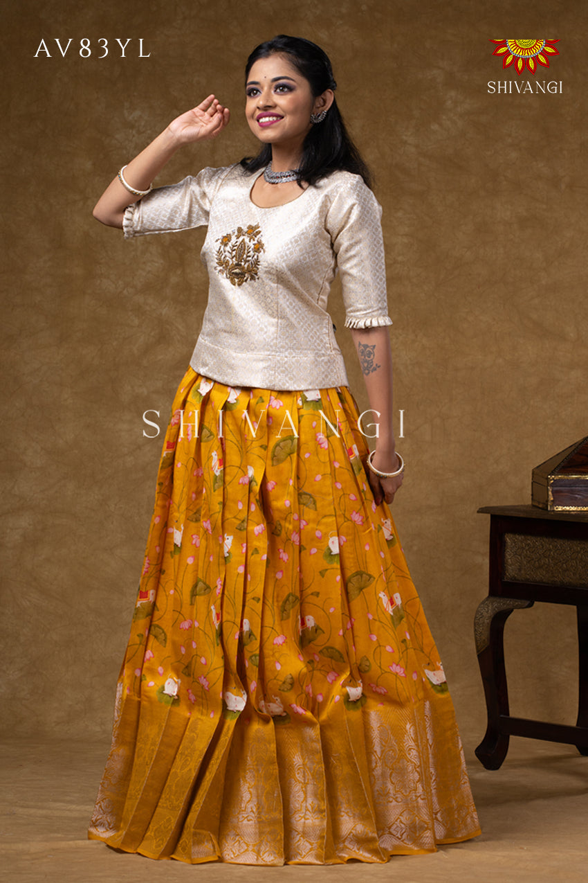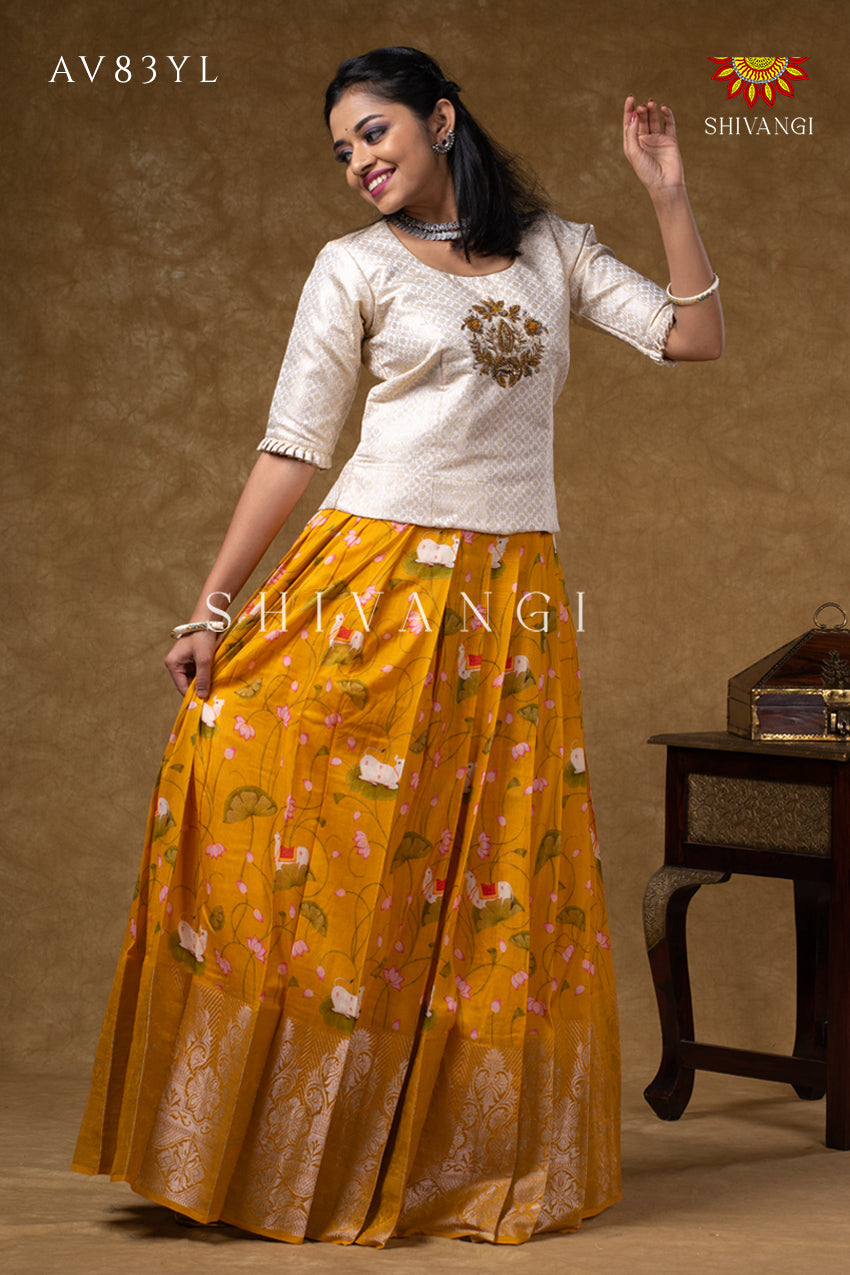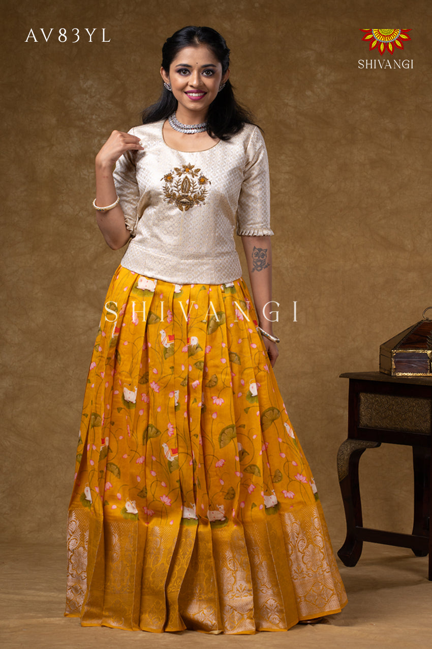 Onam Collection - Yellow Pure Chanderi Pichwai Pavadai Set