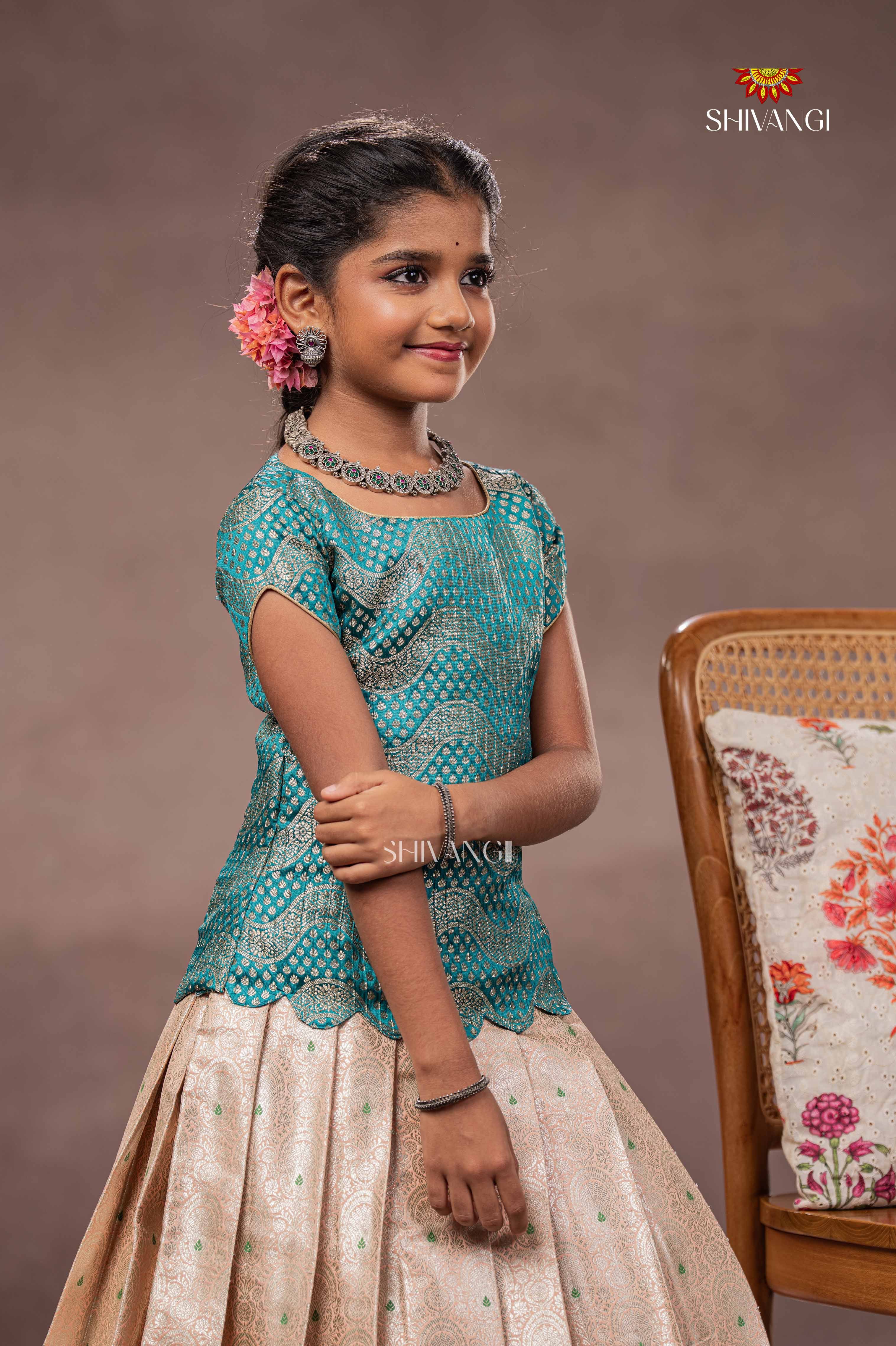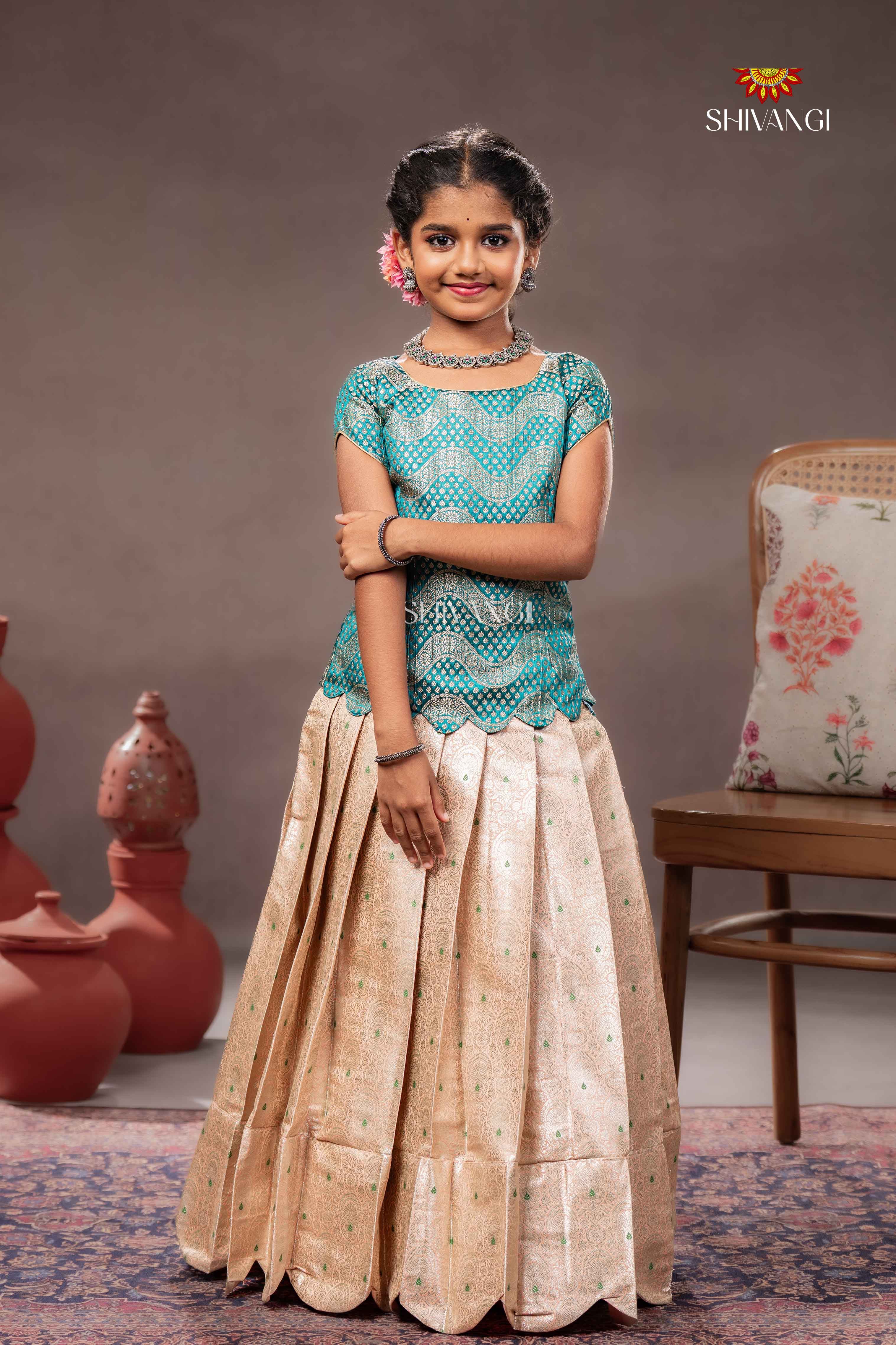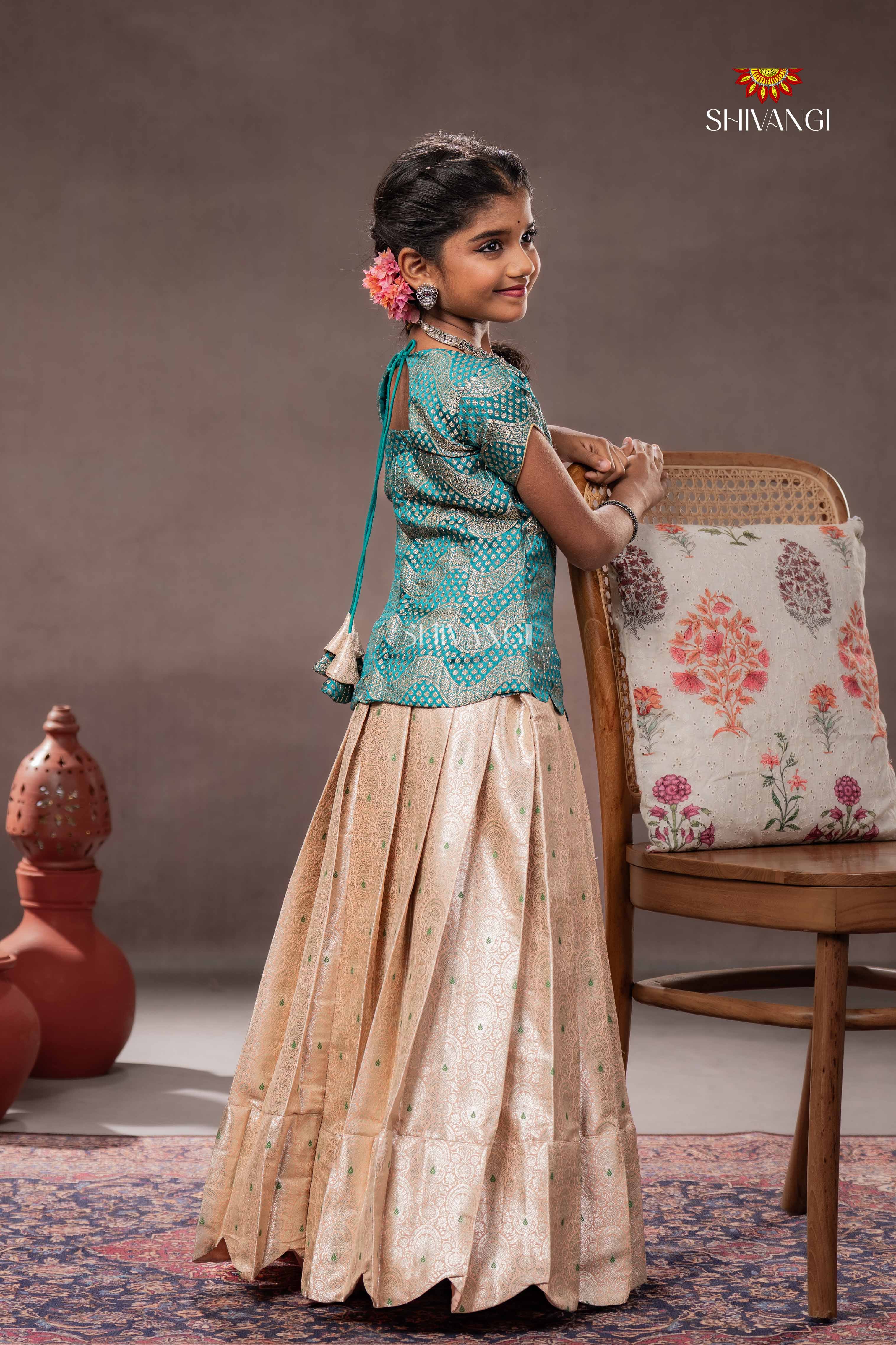 Peach Brocade Wave Traditional Pattu Pavadai Set for Girls