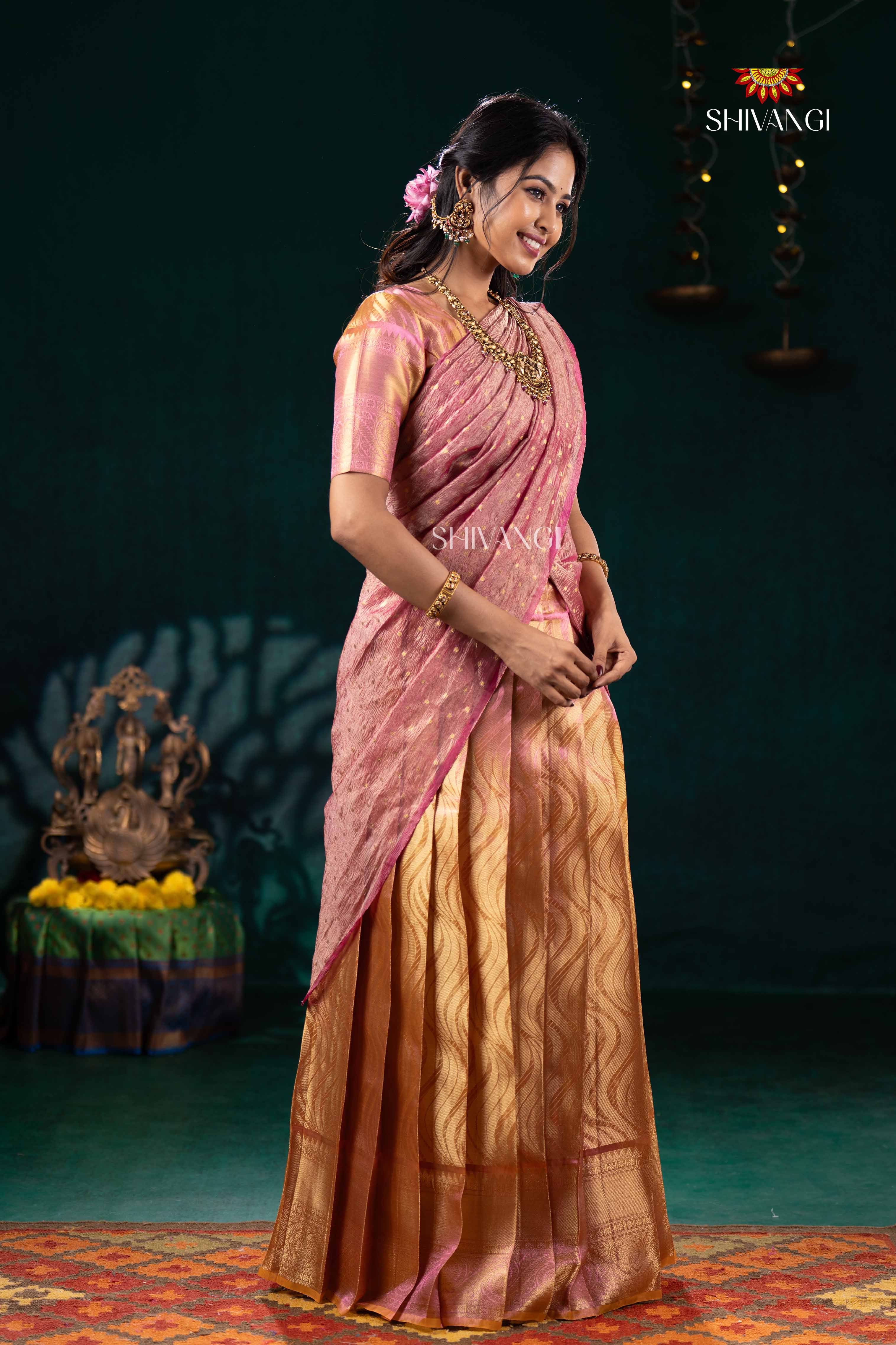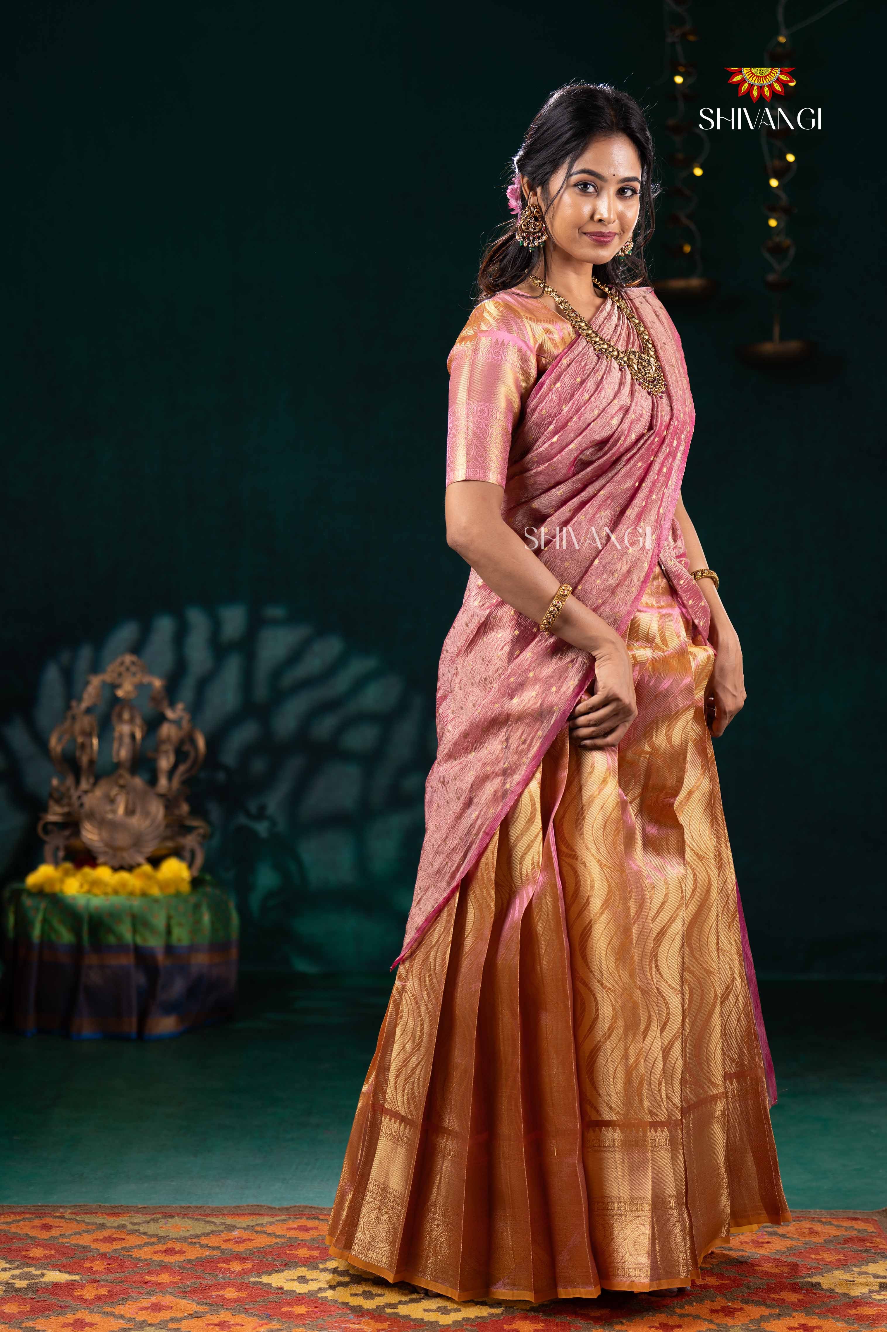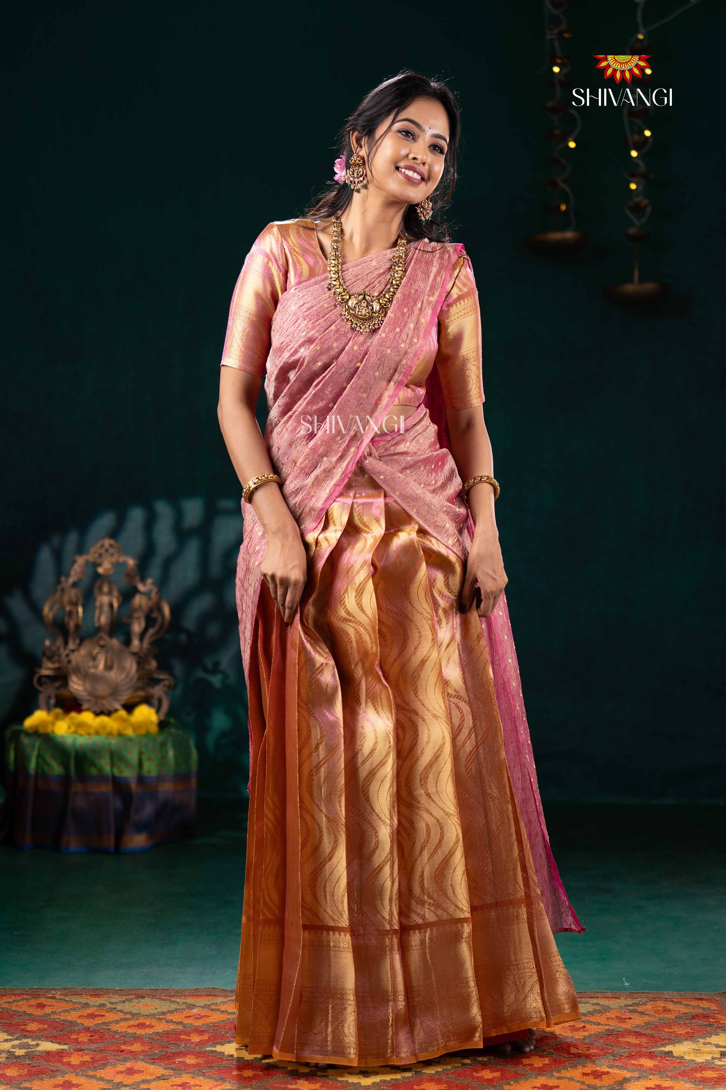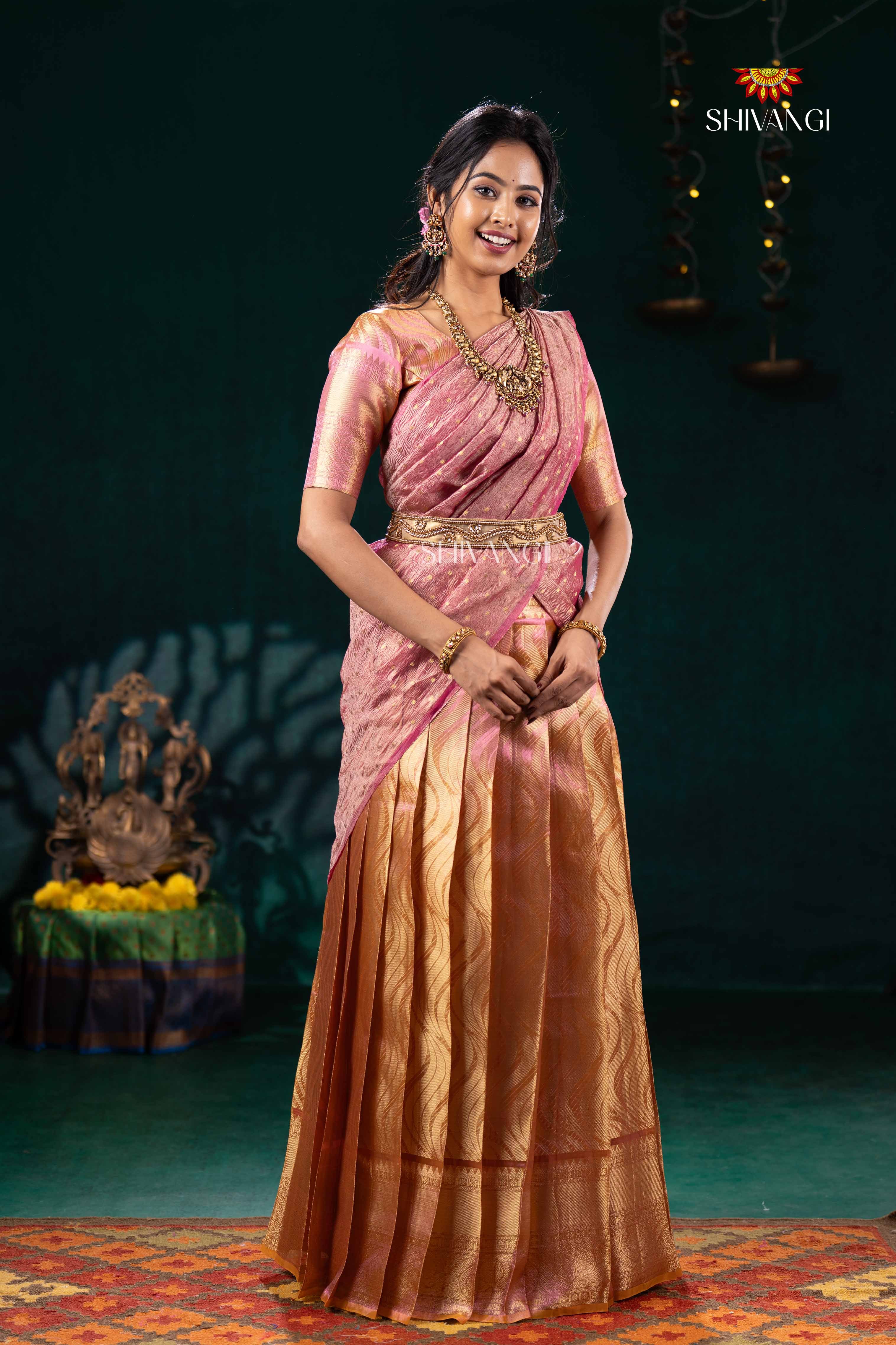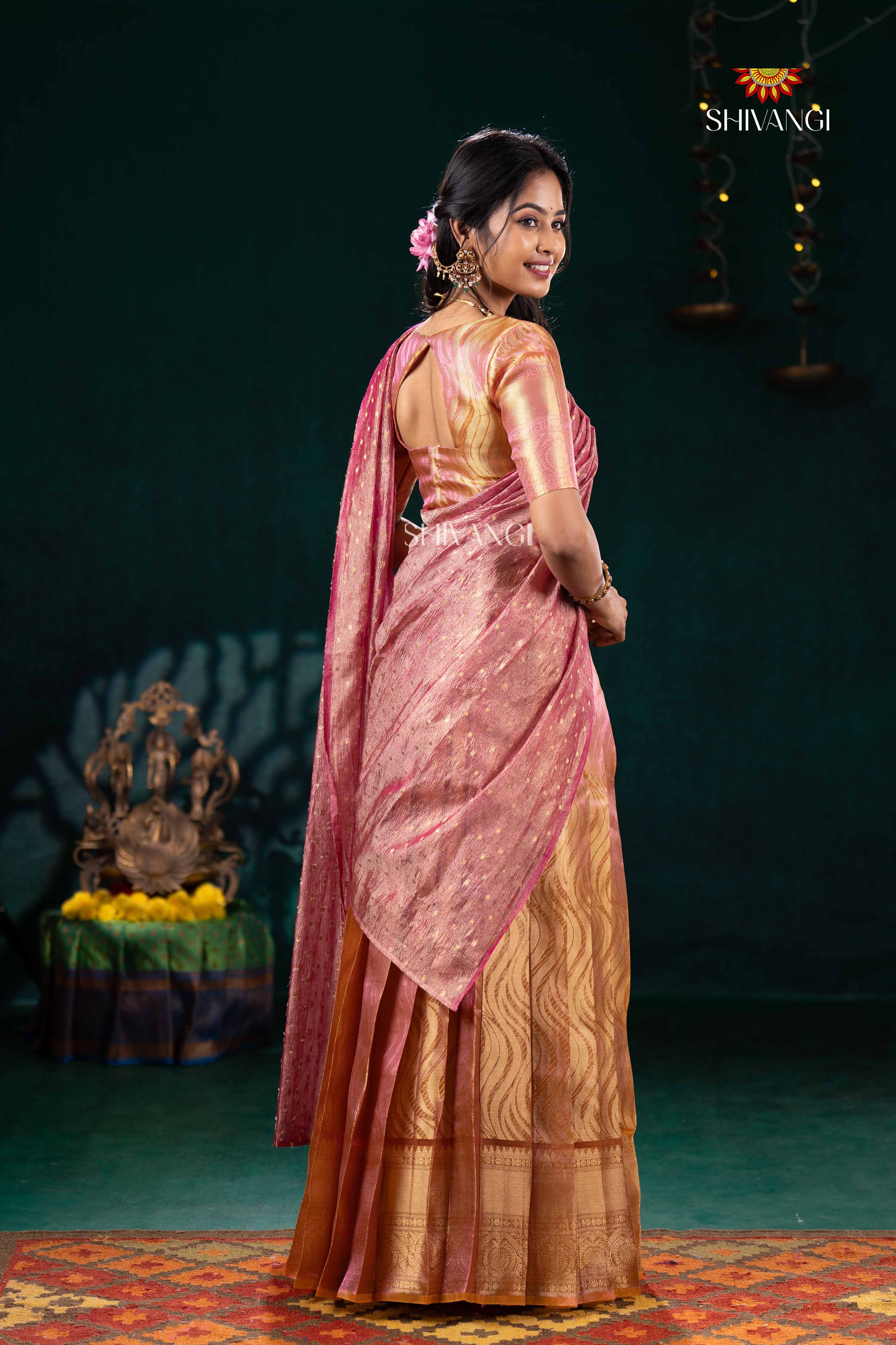 Peach Golden Flames Half Saree | Lehenga For Girls