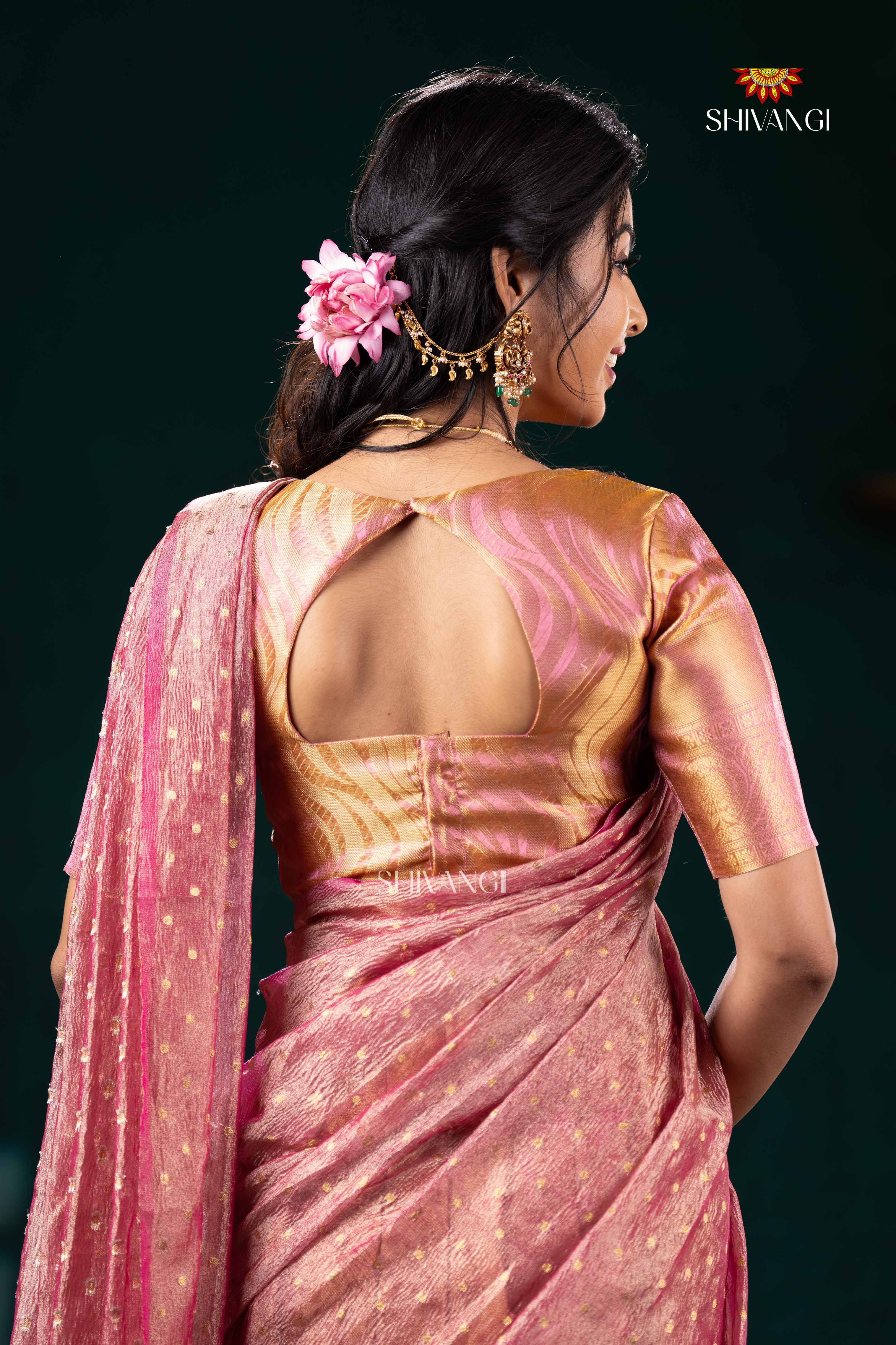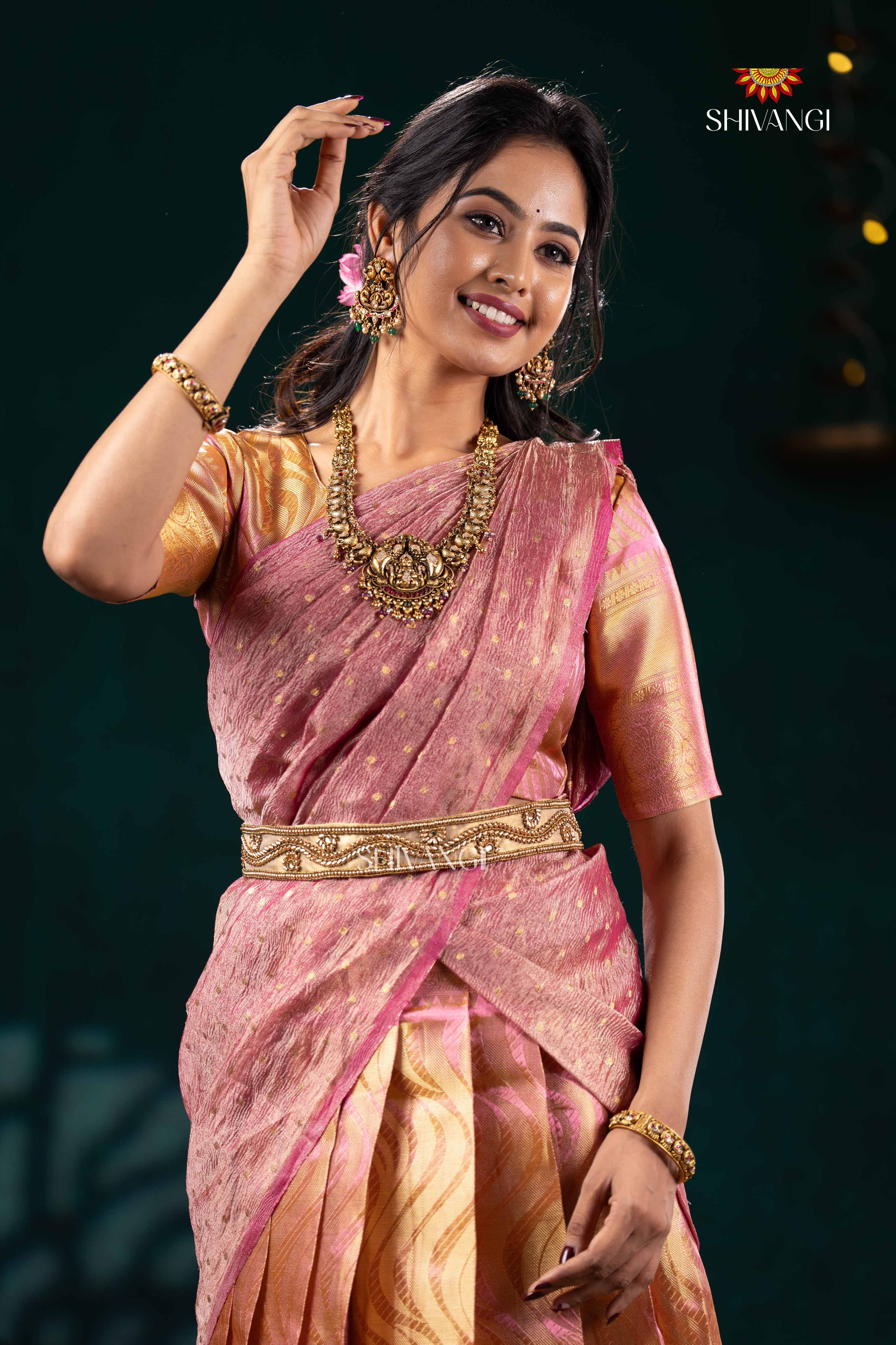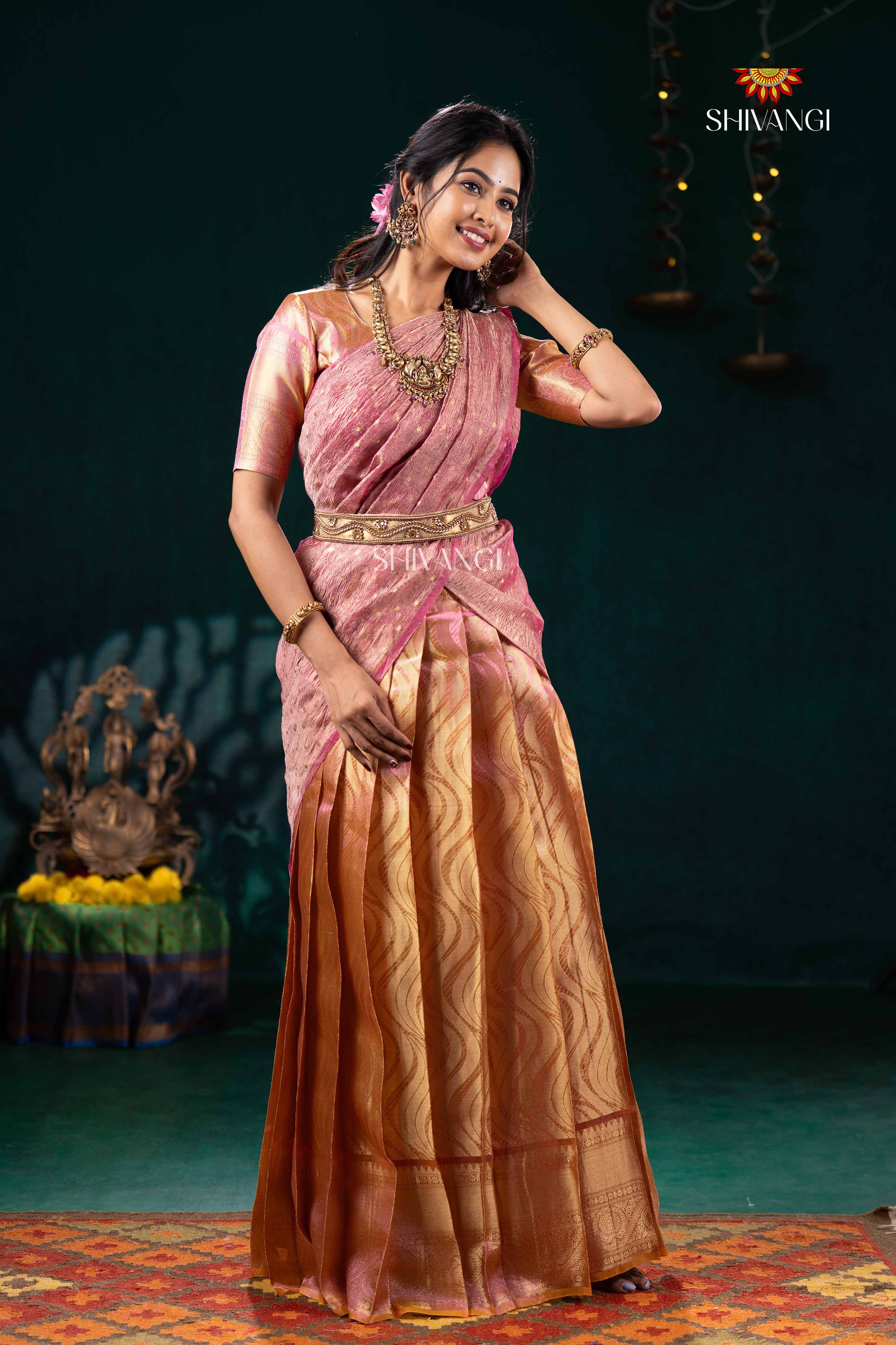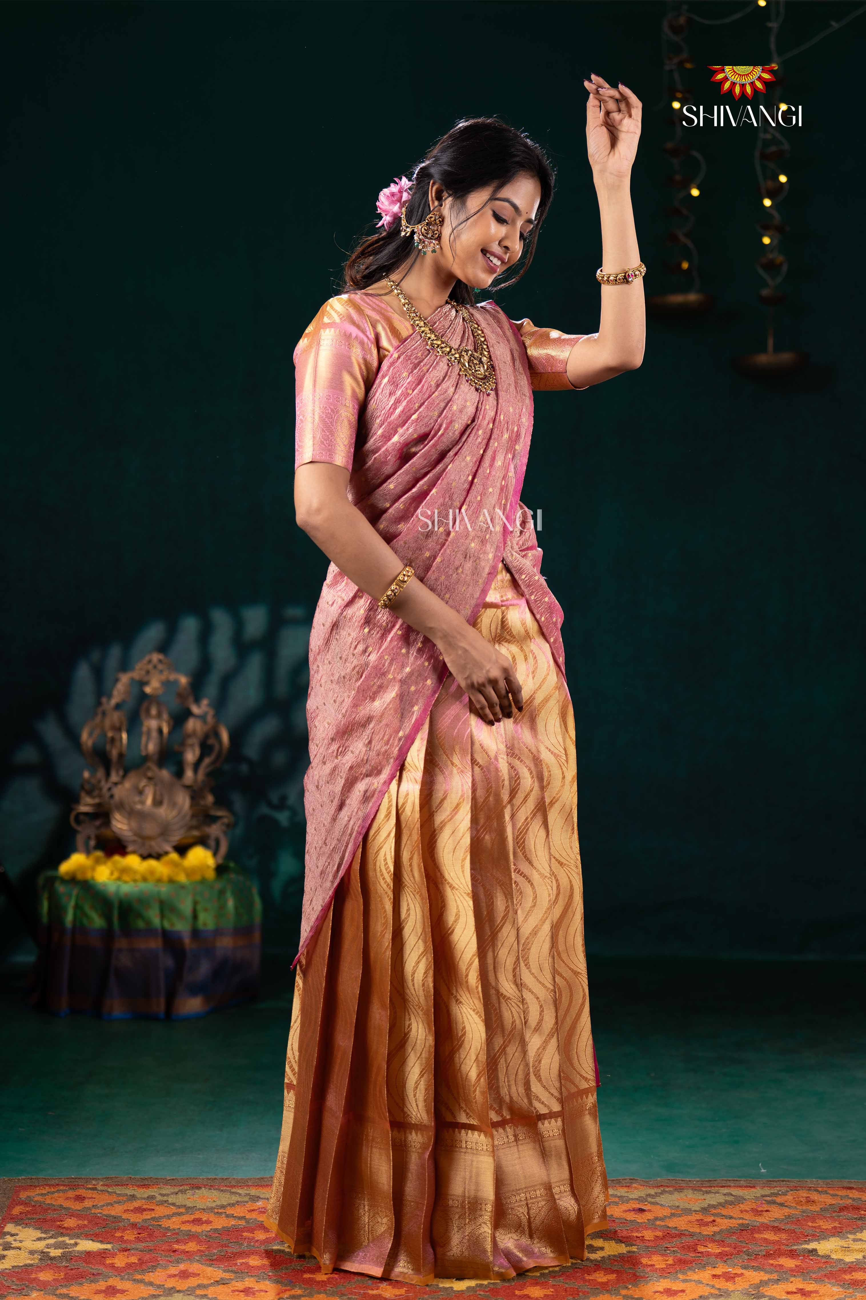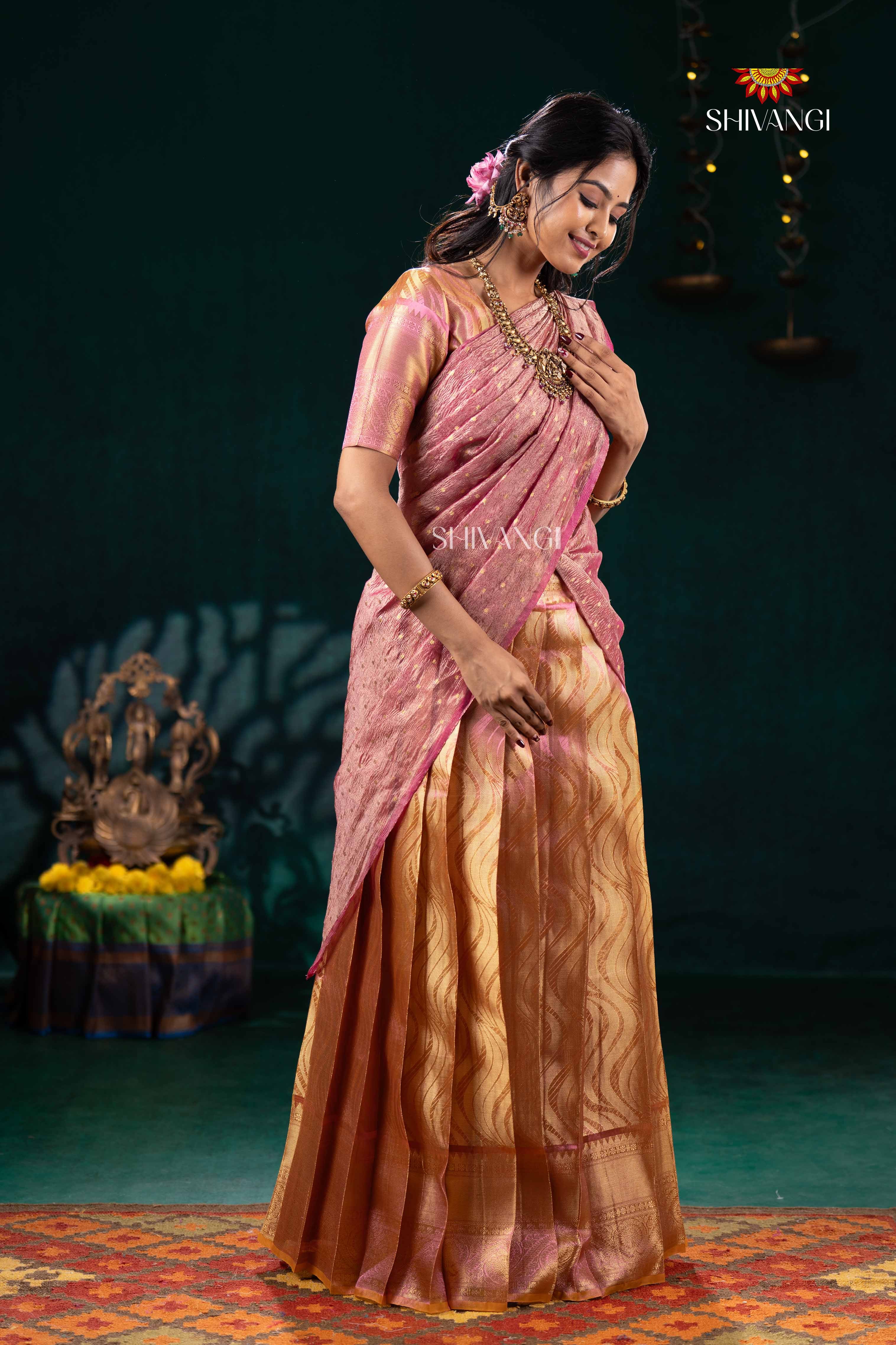 Peach Golden Flames Half Saree | Lehenga For Girls