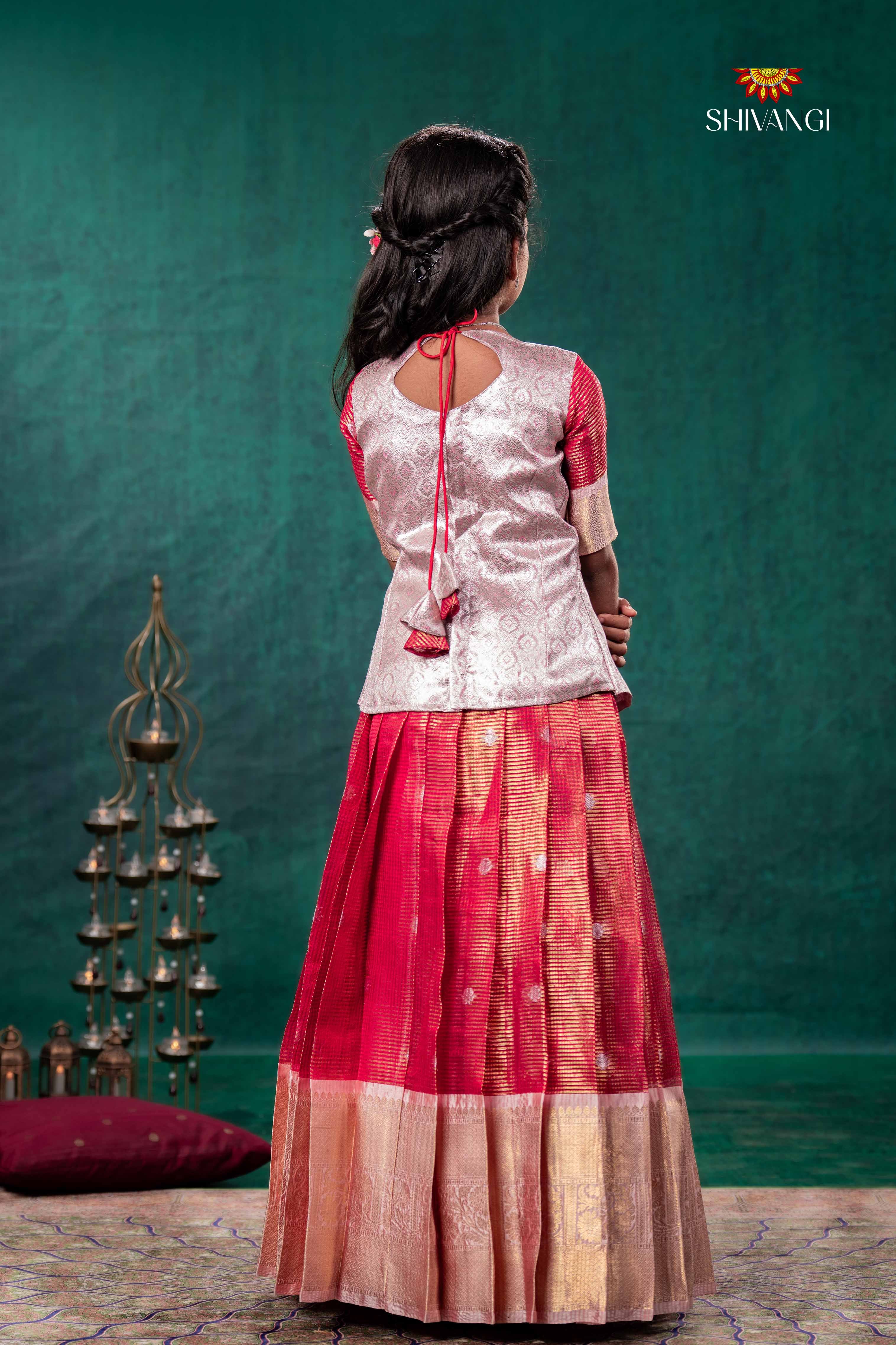 Red Mayapavai Traditional Pattu Pavadai Set features a silver top with a round neck and elbow sleeves.