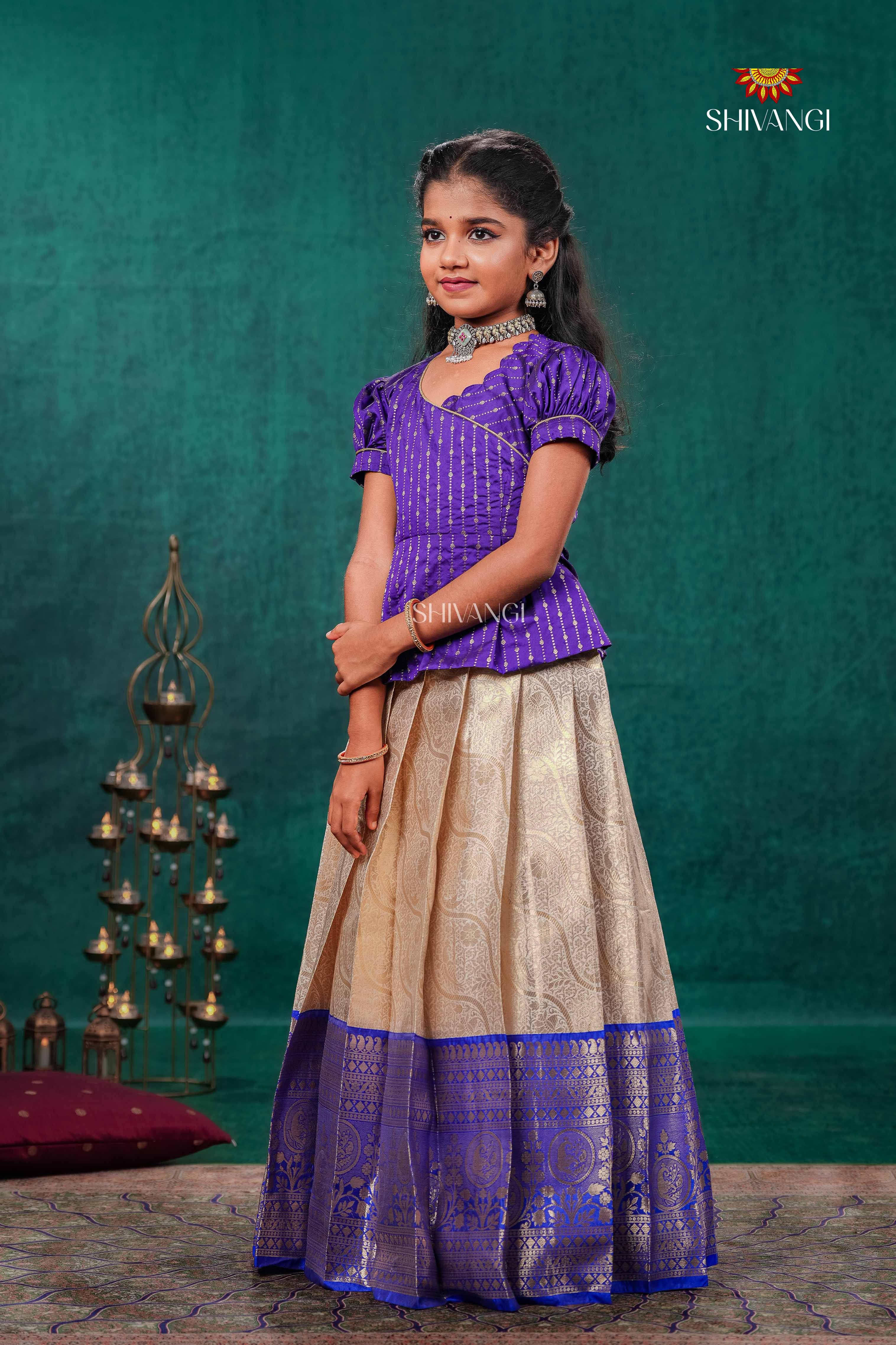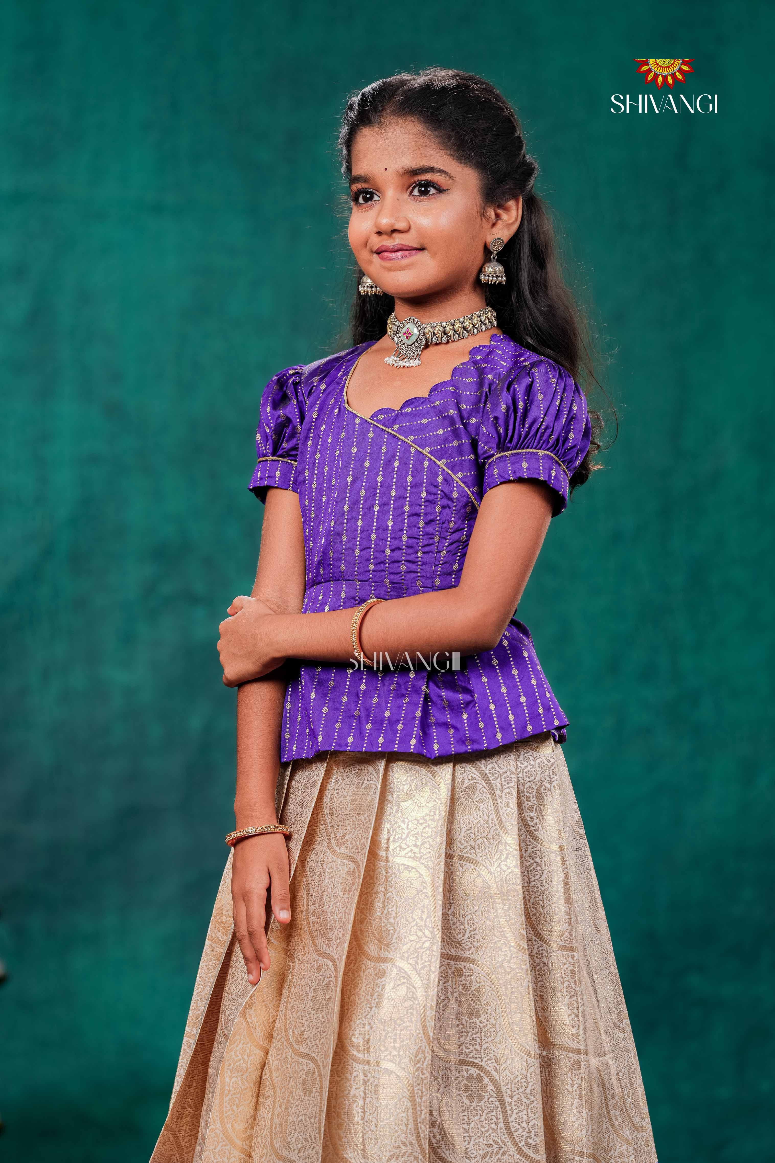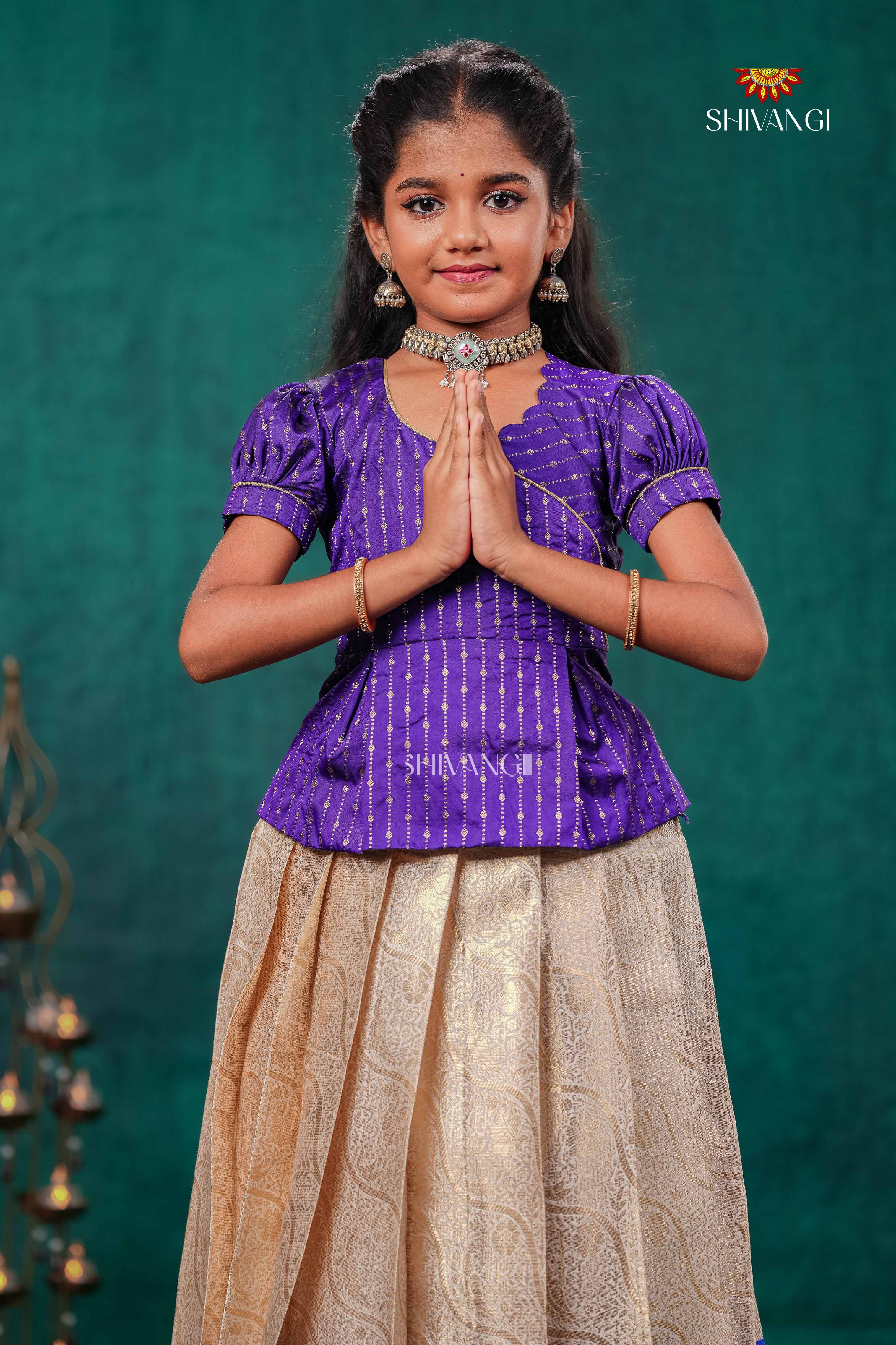 Sandal Golden Annam Traditional Pattu Pavadai Set features a purple top with a round neck and elbow sleeves, paired with a sandal-colored Banarasi silk skirt.
