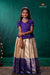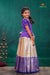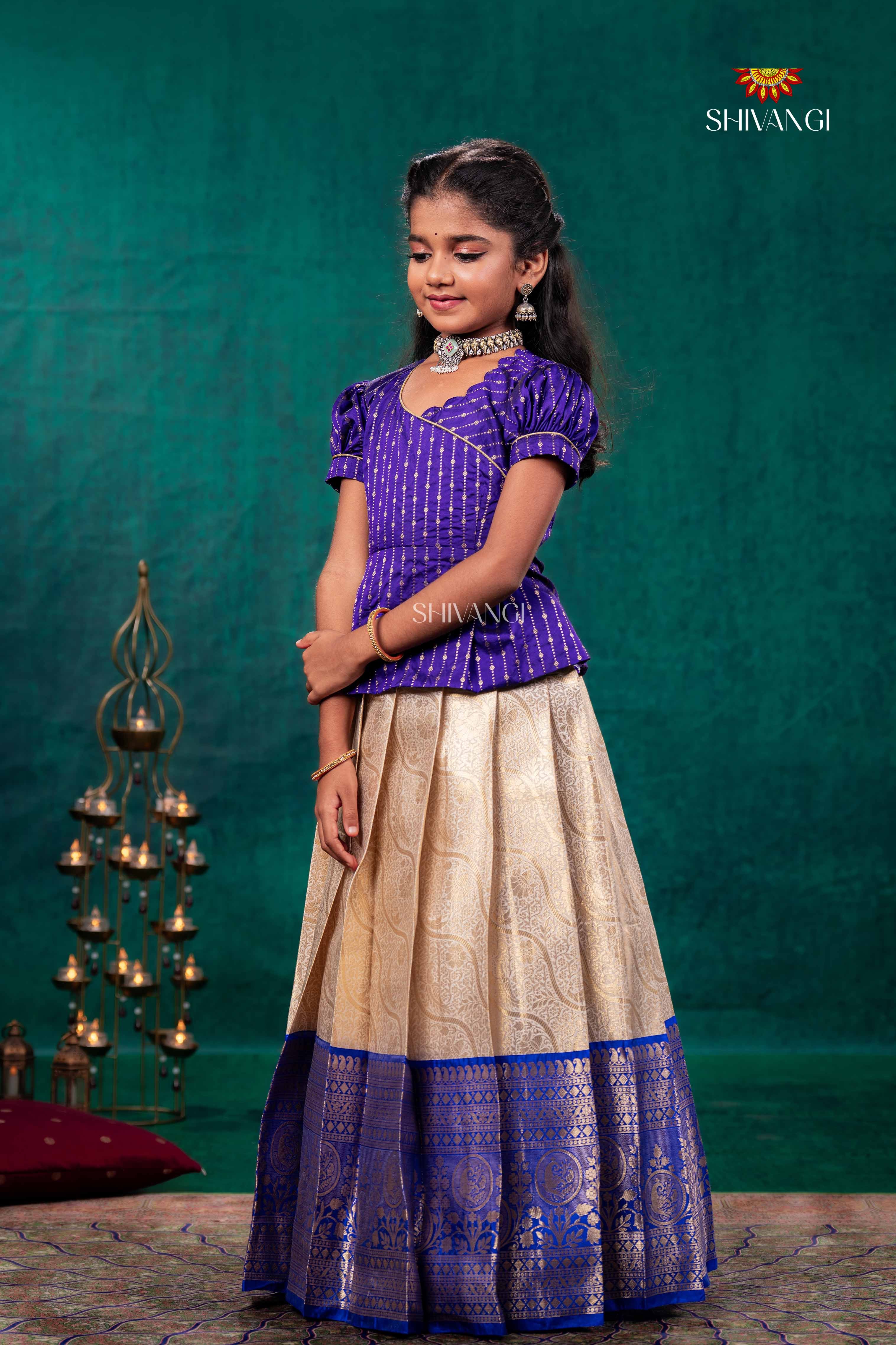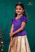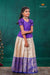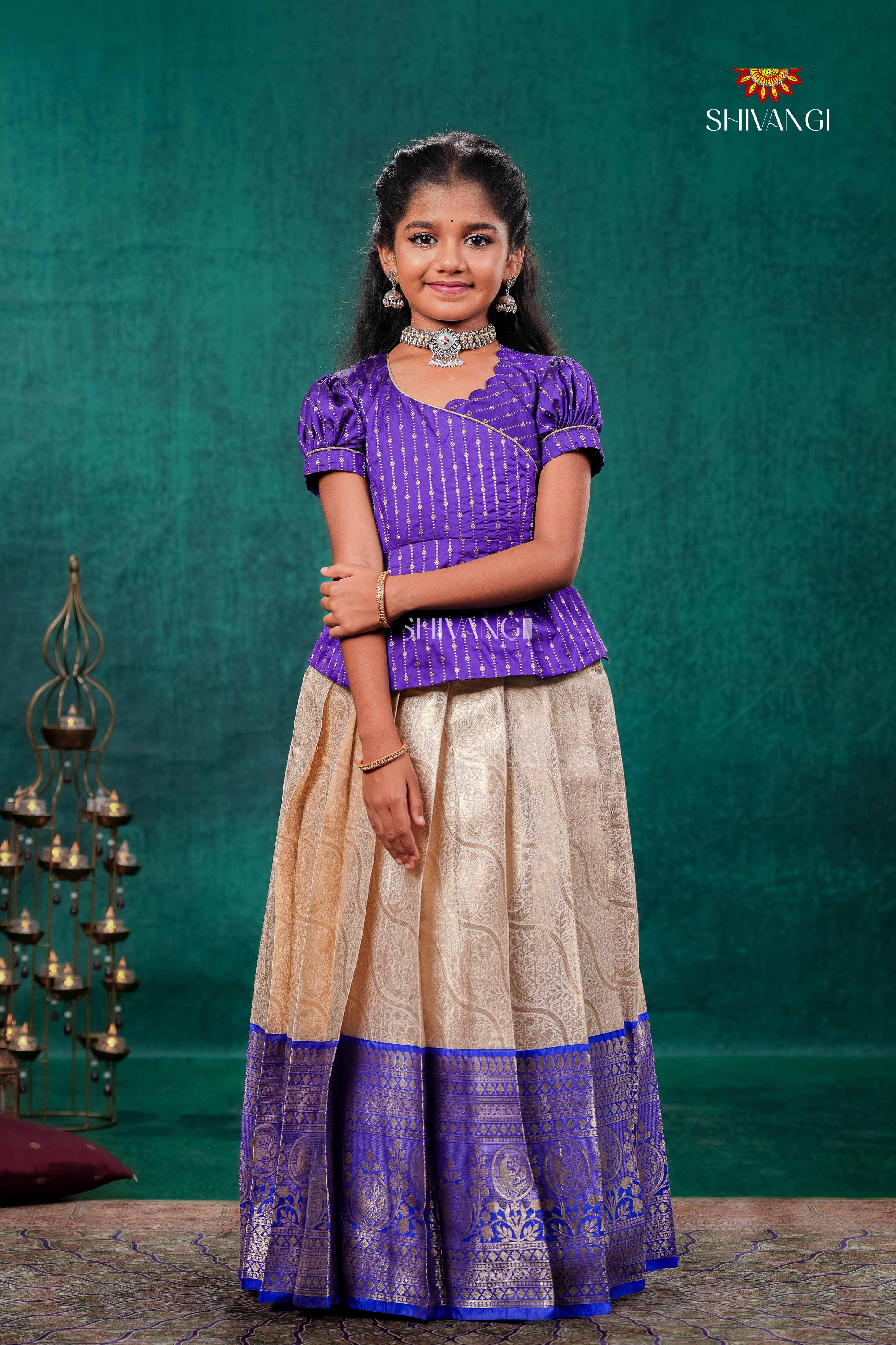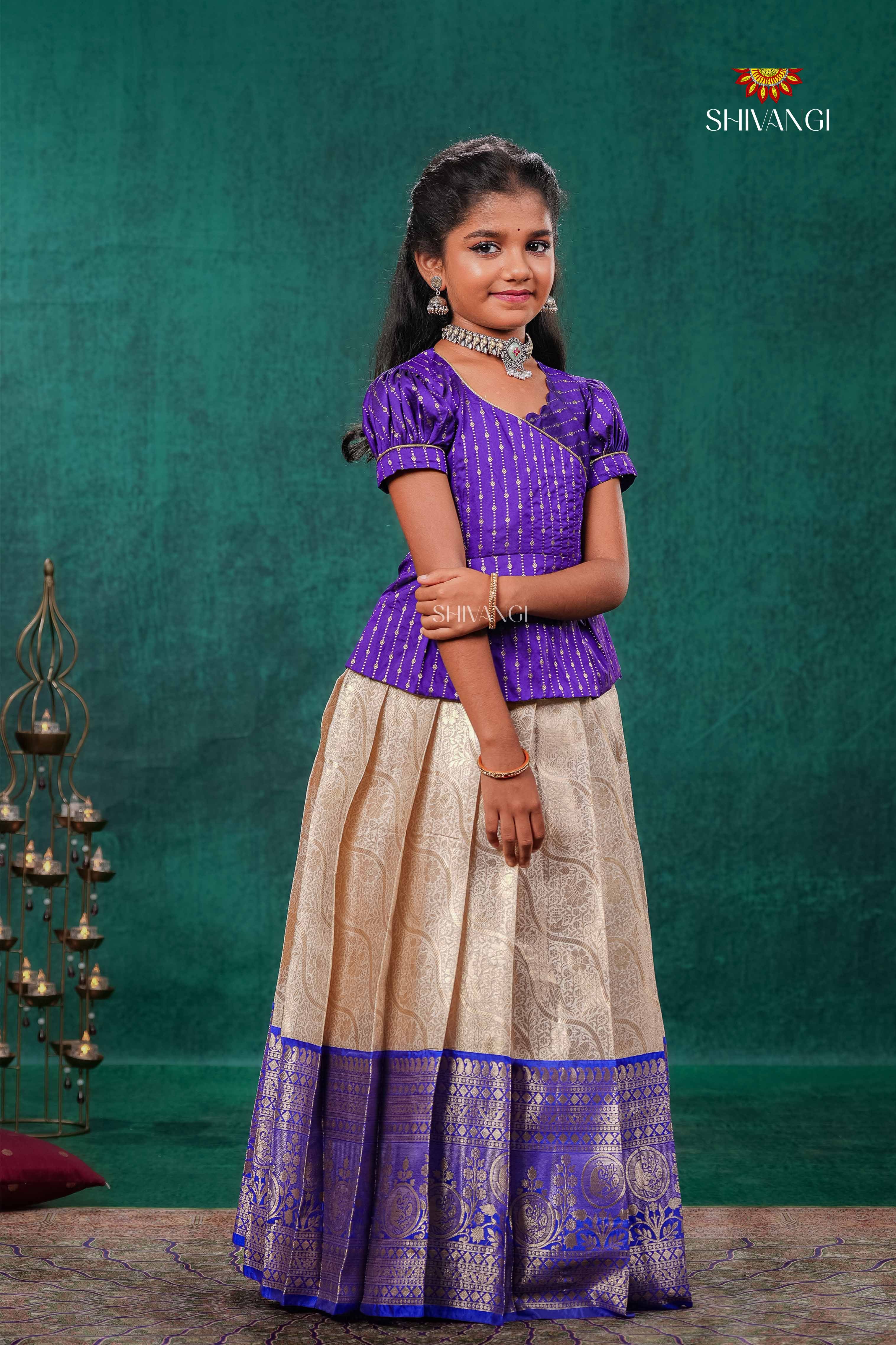 Sandal Golden Annam Traditional Pattu Pavadai Set features a purple top with a round neck and elbow sleeves, paired with a sandal-colored Banarasi silk skirt.